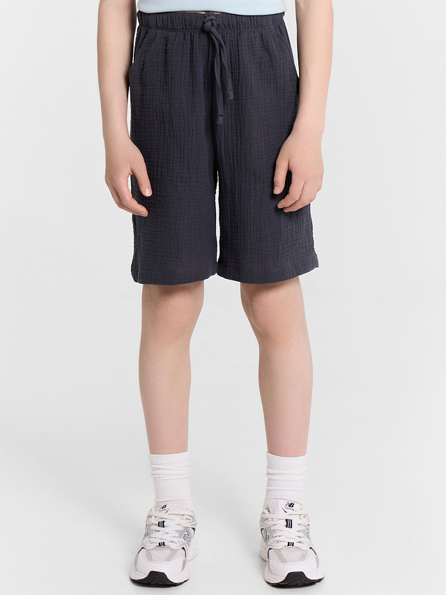 Шорты для мальчиков из ткани (муслин). Шорты с классической линией талии. Силуэт прямой. Пояс цельнокроеный. Верхний срез шорт застрочен с эластичной тесьмой. Карманы в боковых швах (хулиганы). На внешней стороне пояса пробиты петли, втянут шнур из основного полотна. Низ шорт обработан швом в подгибку.