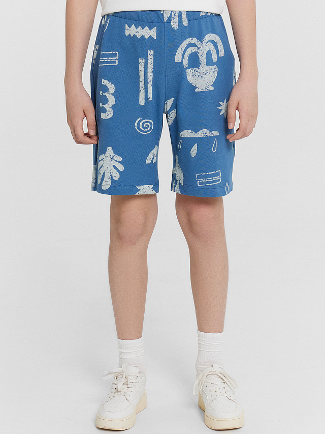 Шорты для мальчиков, прямого силуэта. Пояс цельнокроеный с втачной эластичной тесьмой. В поясе пробиты петли и протянут шнур. По переду обработаны карманы "хулиганы". На передней левой детали проложены отделочные строчки - имитация гульфика. Низ шорт обработан швом в подгибку.