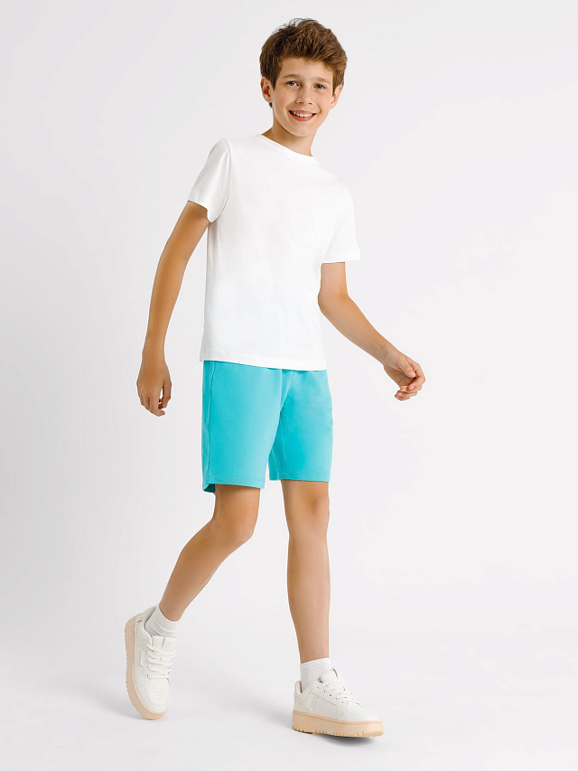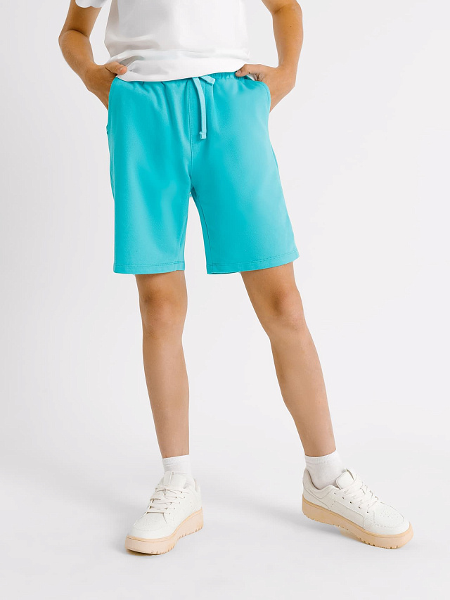 Шорты изготовлены из трикотажного полотна футер. Шорты прямого силуэта выше колена. Пояс отрезной с эластичной тесьмой внутри и шнуром. По поясу идут 2 декоративные строчки. Боковые швы перенесены вперед. На передних половинках обработаны карманы с наклонным входом от боковых швов. По переду ложный гульфик. Низ изделия обработан на 2-х игольной плоскошовной машине швом в подгибку.