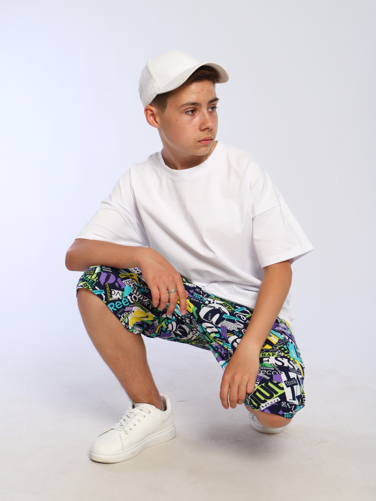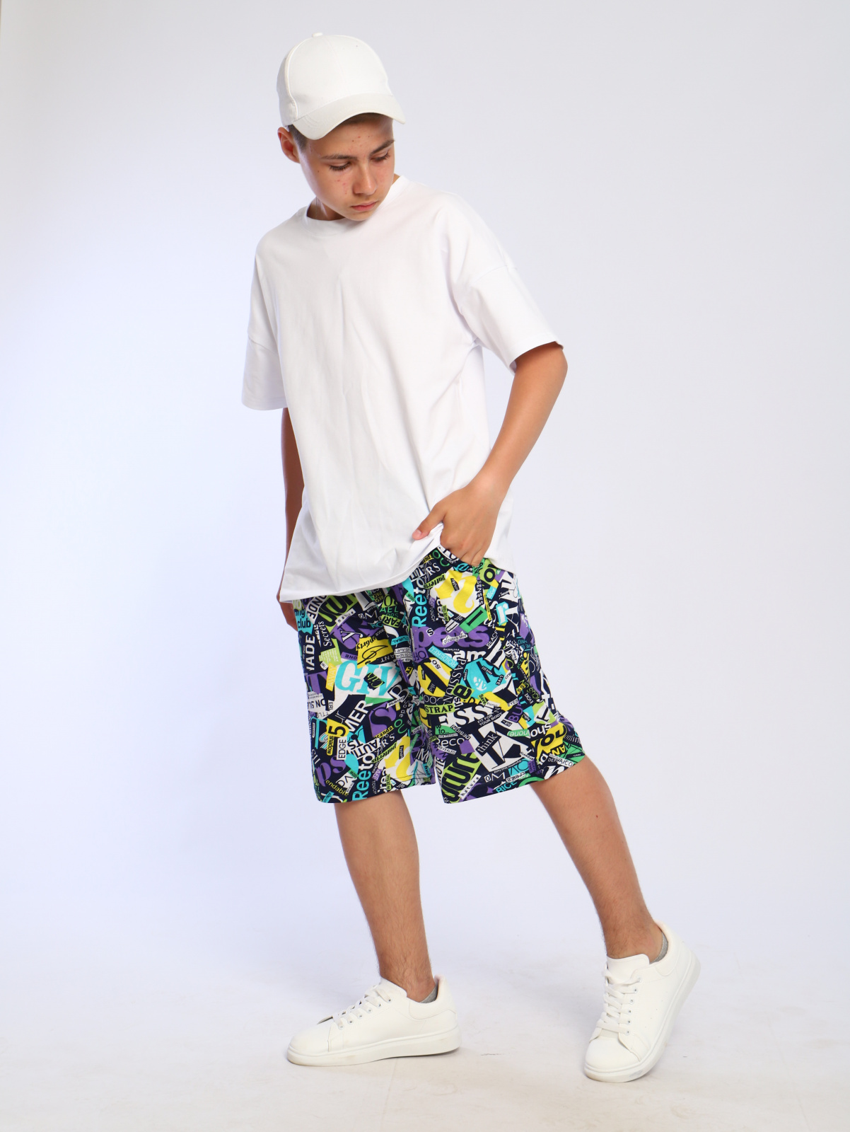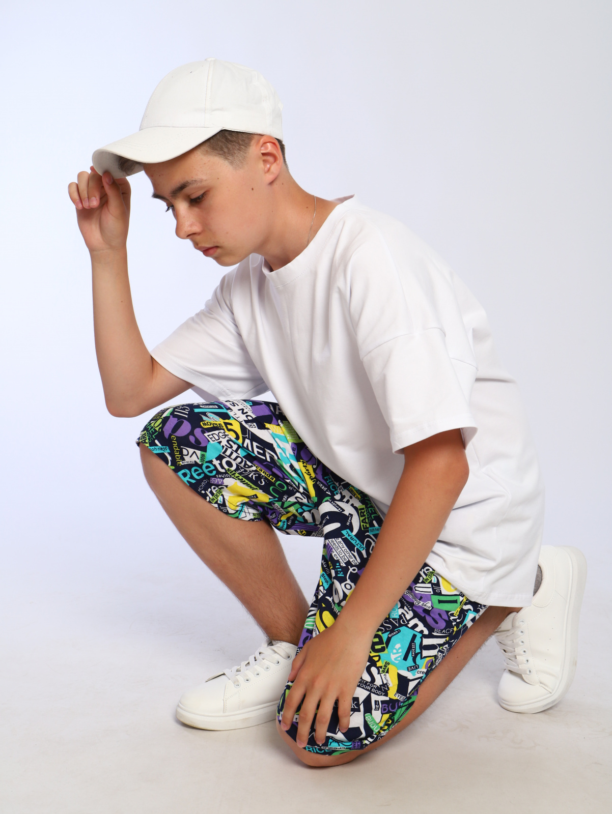 Летние легкие шорты для мальчиков-подростков с ярким молодежным принтом. Крой широкий свободный до колен с удобными кармашки в боковых швах. Пояс на комфортной широкой резинке. За счет удобной длины и свободного кроя, летние бриджи для мальчика позволяют активно двигаться, играть, заниматься спортивными играми даже в самую жаркую погоду. Модные яркие шорты составят  основу летнего гардероба мальчика-подростка, подходят на каждый день, на пляж, на дачу, на море, для отдыха, а также для физкультуры в школе, занятий спортом, бегом, для тренировок. Можно комплектовать с футболкой. Лонгсливом, облегченной толстовкой ,свитшотом, худи.