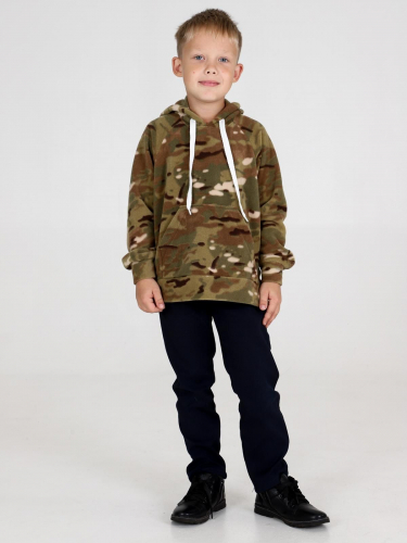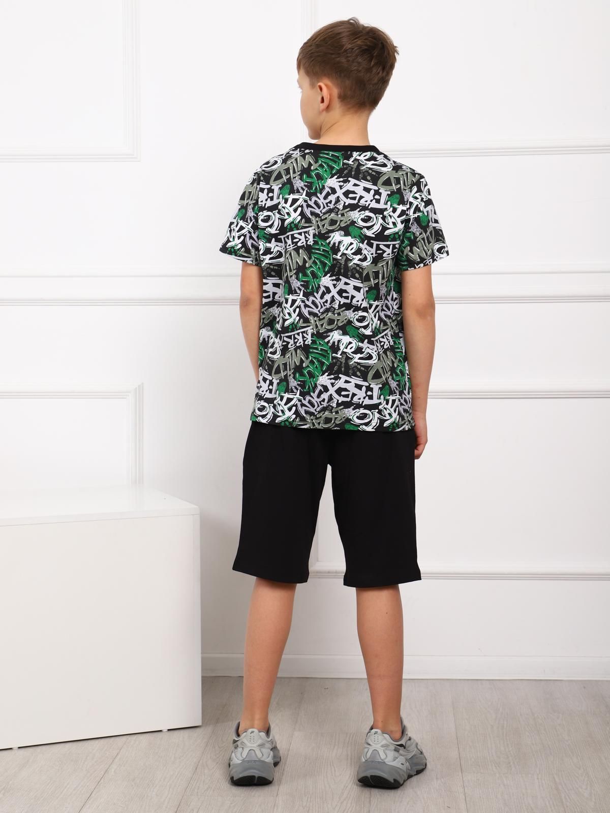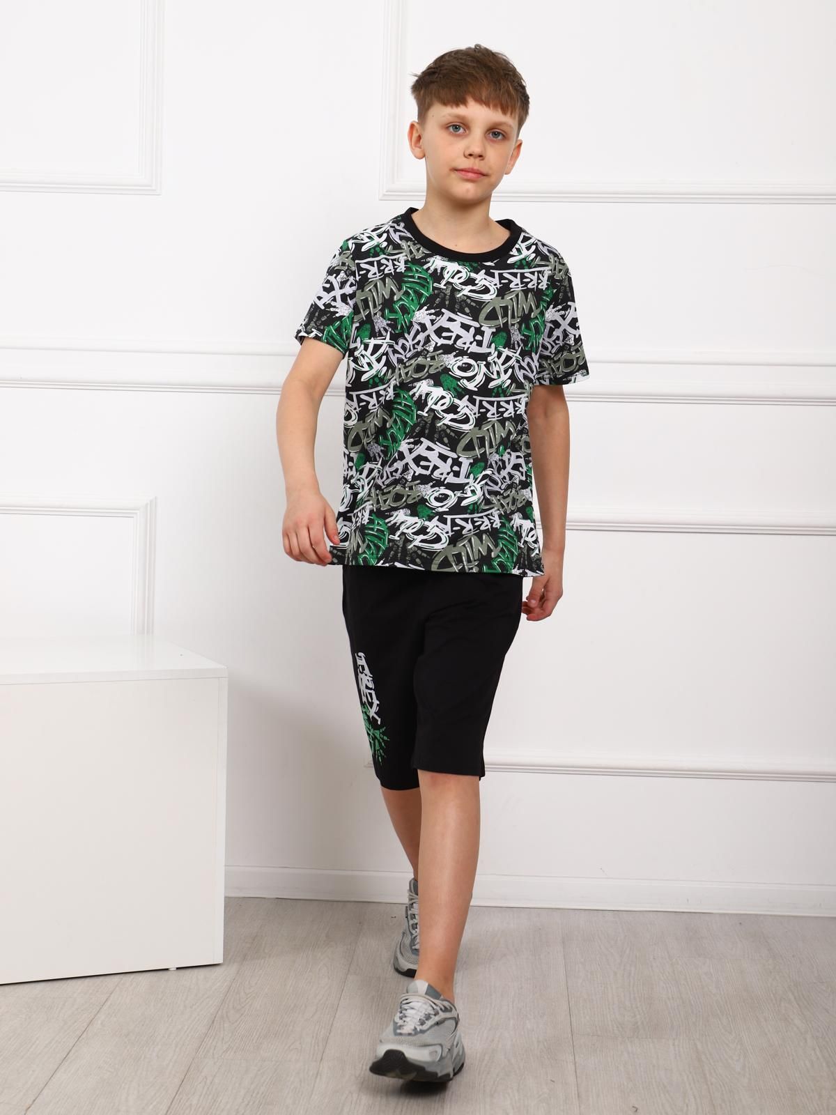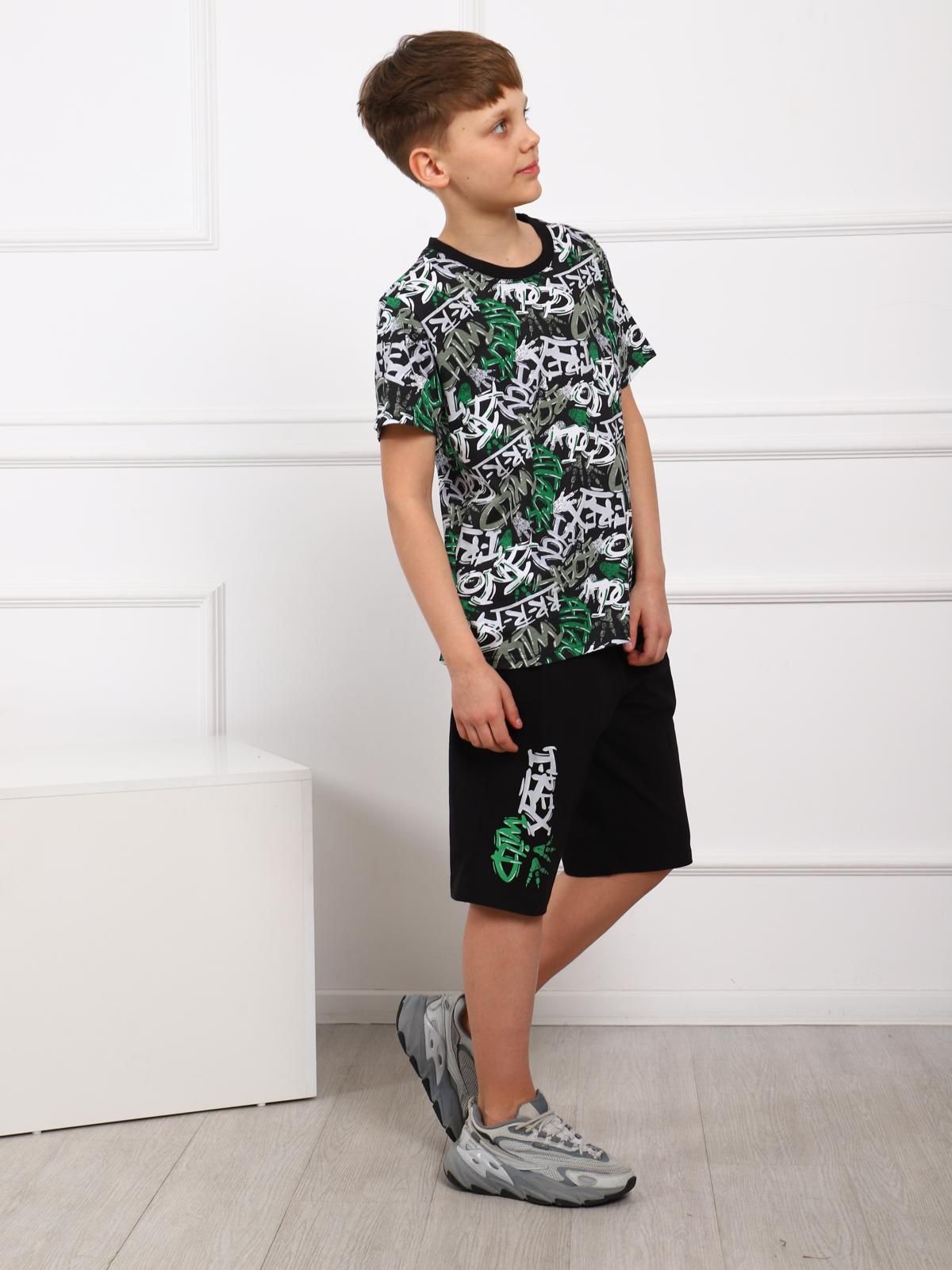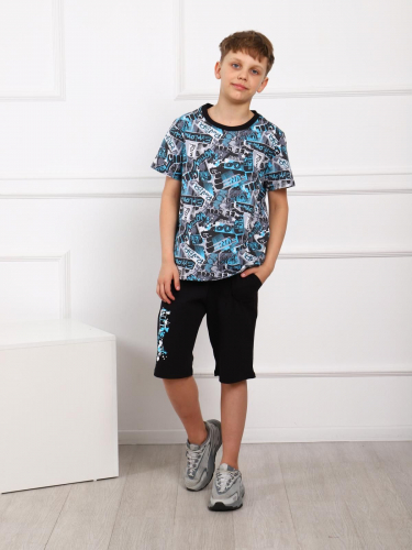 Костюм для мальчика из хлопкового полотна. Футболка с втачным рукавом из набивной ткани. Удлиненные шорты на поясе-резинке с карманами, с крупным ярким логотипом на одной штанине.
