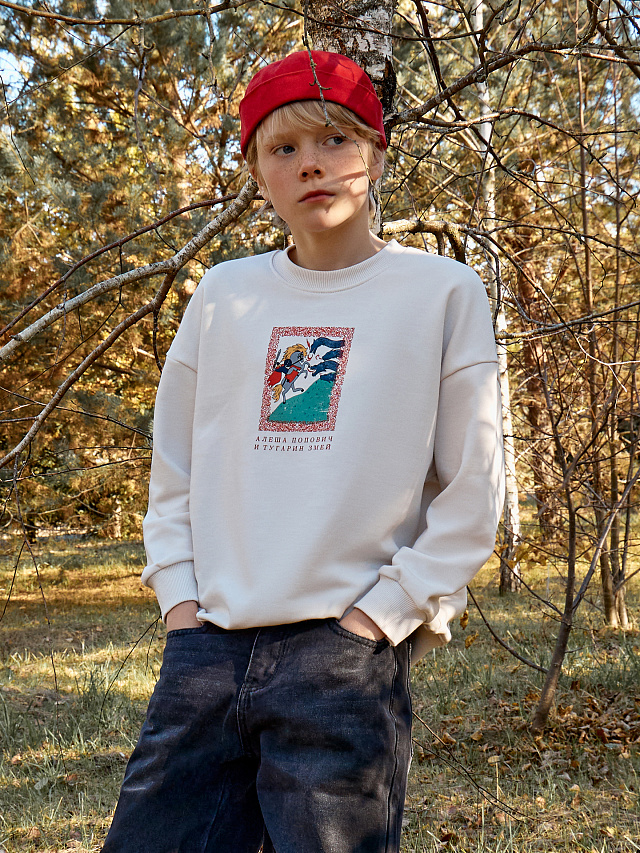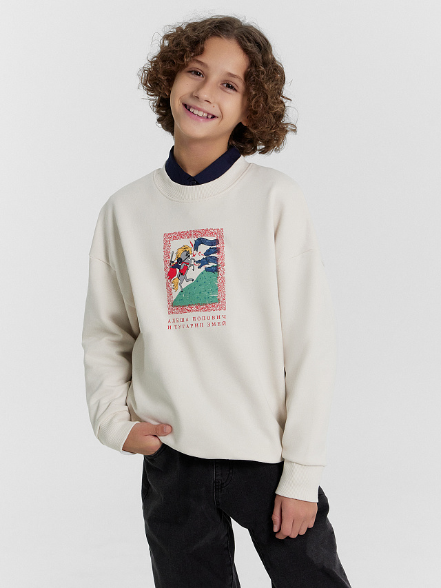 Стильный свитшот для мальчиков выполнен из высококачественного хлопка с печатью в виде сцены из сказки "Алёша Попович и Тугарин Змей». Оригинальная модель свободного силуэта, которая приведет в восторг не только малышей, но и подростков. Горловина круглой формы из рибаны. Рукава длинные, с отрезными манжетами. По низу джемпера отрезной пояс. Комфортный и уютный вариант для создания городских образов. Дополнить можно любым низом в тон. Широкий размерный ряд. Рекомендуем!