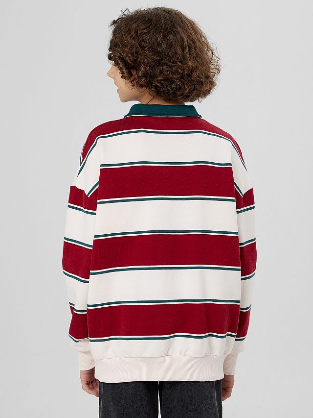 Свитшот для мальчика — это стильная и комфортная модель для повседневной носки. Свободный силуэт со спущенным плечом и длинными рукавами обеспечивает полную свободу движений, а отрезные манжеты из рибаны мягко фиксируют запястья, сохраняя тепло. Округлая горловина с рубашечным воротником и застежкой на пуговицы добавляет образу аккуратности, напоминая классический поло, но с уютом свитшота.