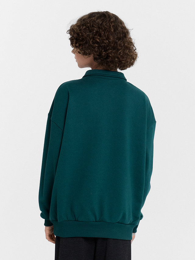 Свитшот для мальчика зеленый — это стильная и комфортная модель для повседневной носки. Свободный силуэт со спущенным плечом и длинными рукавами обеспечивает полную свободу движений, а отрезные манжеты из рибаны мягко фиксируют запястья, сохраняя тепло. Округлая горловина с рубашечным воротником и застежкой на пуговицы добавляет образу аккуратности, напоминая классический поло, но с уютом свитшота.