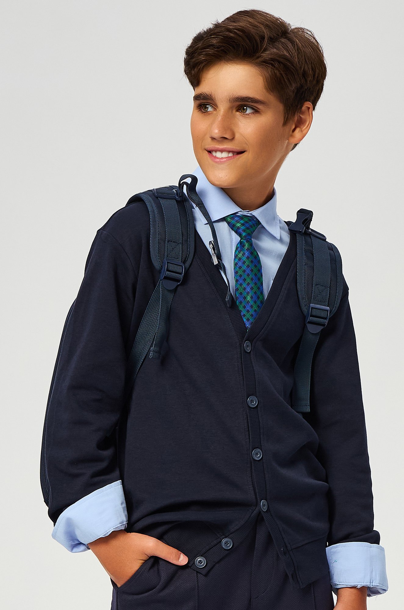 Сочетание классики и комфорта! Детский..показать кардиган из натурального 100% хлопка для мальчиков и мальчиков-подростков – отличное дополнение к школьной форме! Длинный рукав, классическая застежка на пуговицы, глубокий V-образный вырез – этот синий кардиган для детей поможет создать опрятный и нарядный образ в школу.