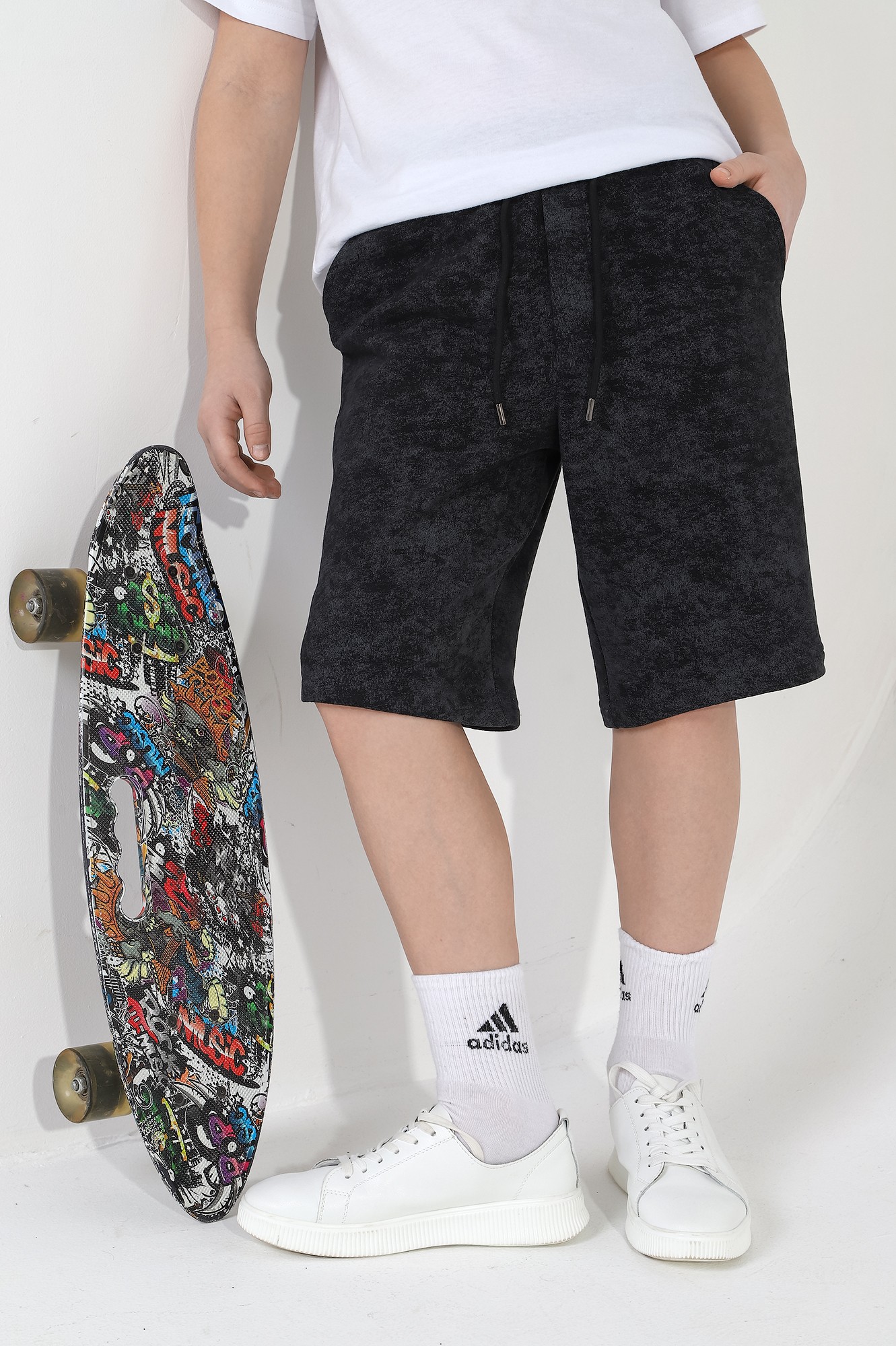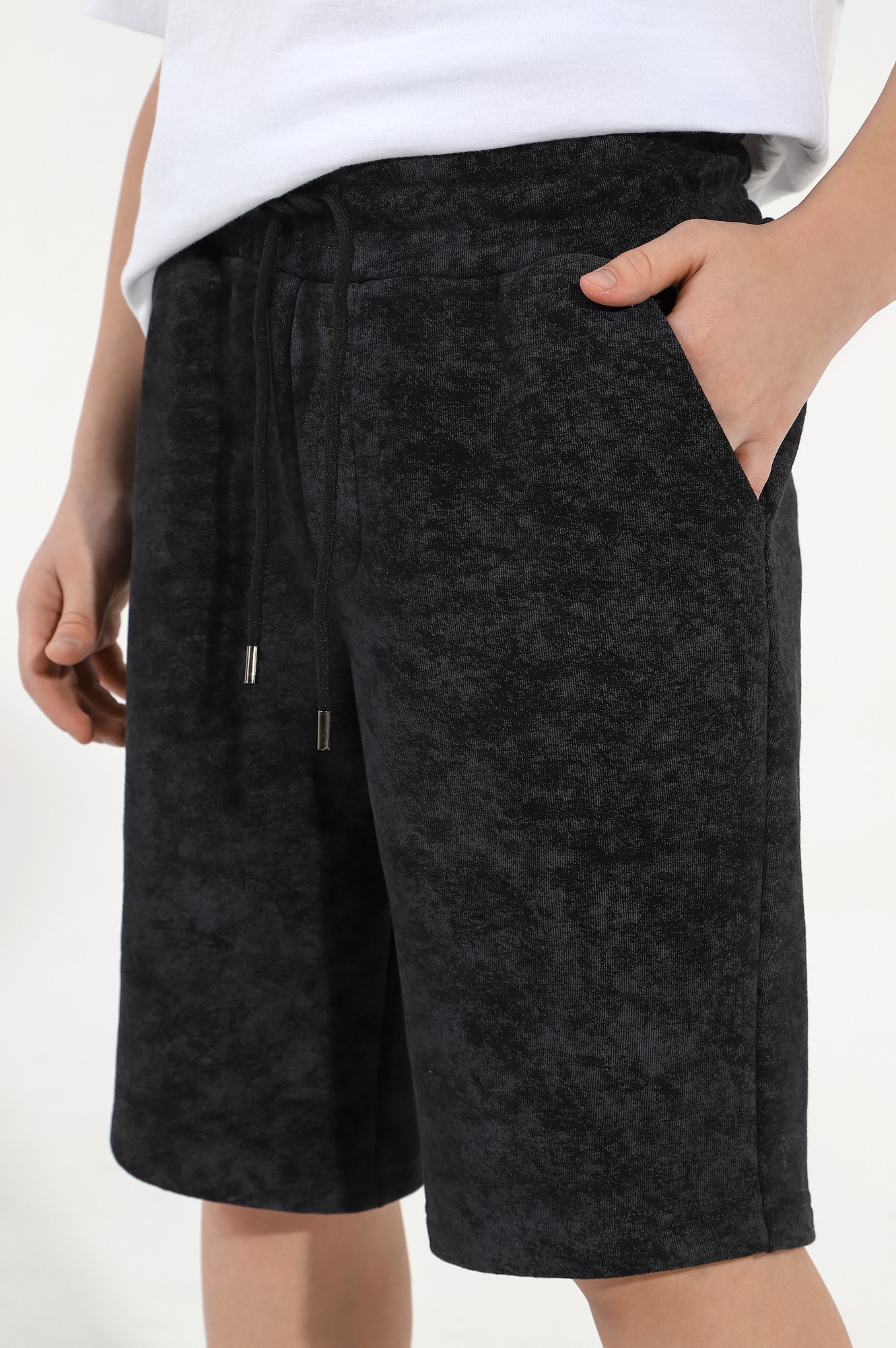 Шортыдля мальчика из трикотажного полотна "футер-трехника -петля", на притчном поясе с эластичной тесьмой внутри, с карманами в боковых швах и имитацией застежки "гульфик". В центре пояса - две обметанные петли, чере которые продет шнурок с наконечниками для регулирования степени прилегания шорт по талии.