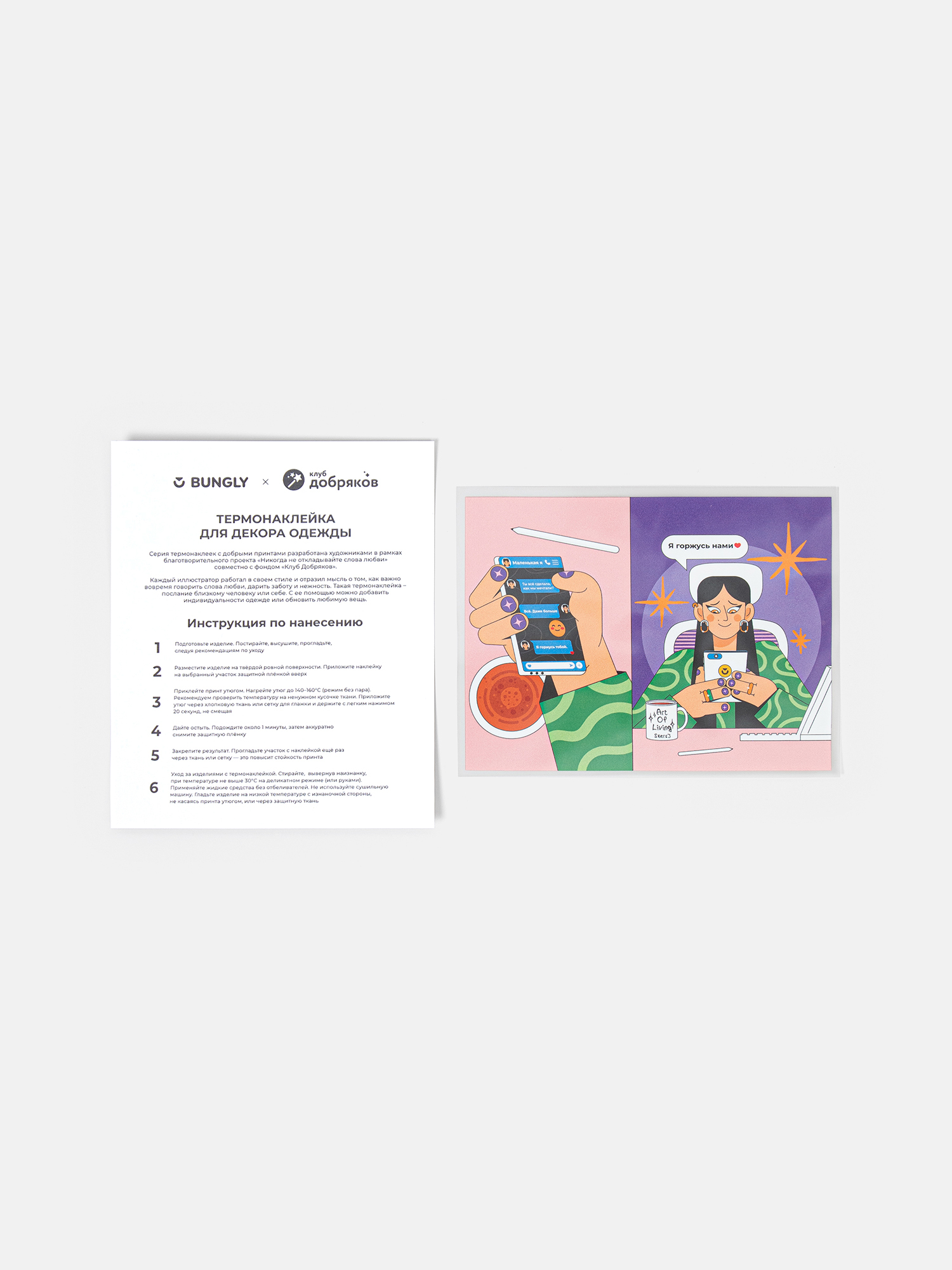 Эта особенная термонаклейка – не просто красивый принт, а маленький ритуал заботы: останавливающий миг, в котором мы замечаем простые проявления любви, дарим комфорт и внимание близкому человеку (или себе). Подарите её тому, кто вам дорог. С помощью такой наклейки, можно добавить индивидуальности одежде или обновить любимую вещь.