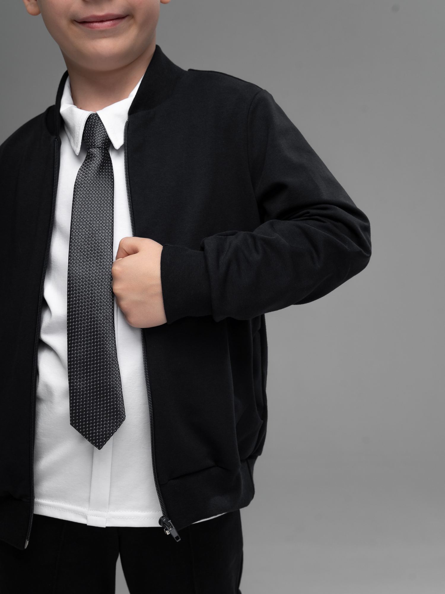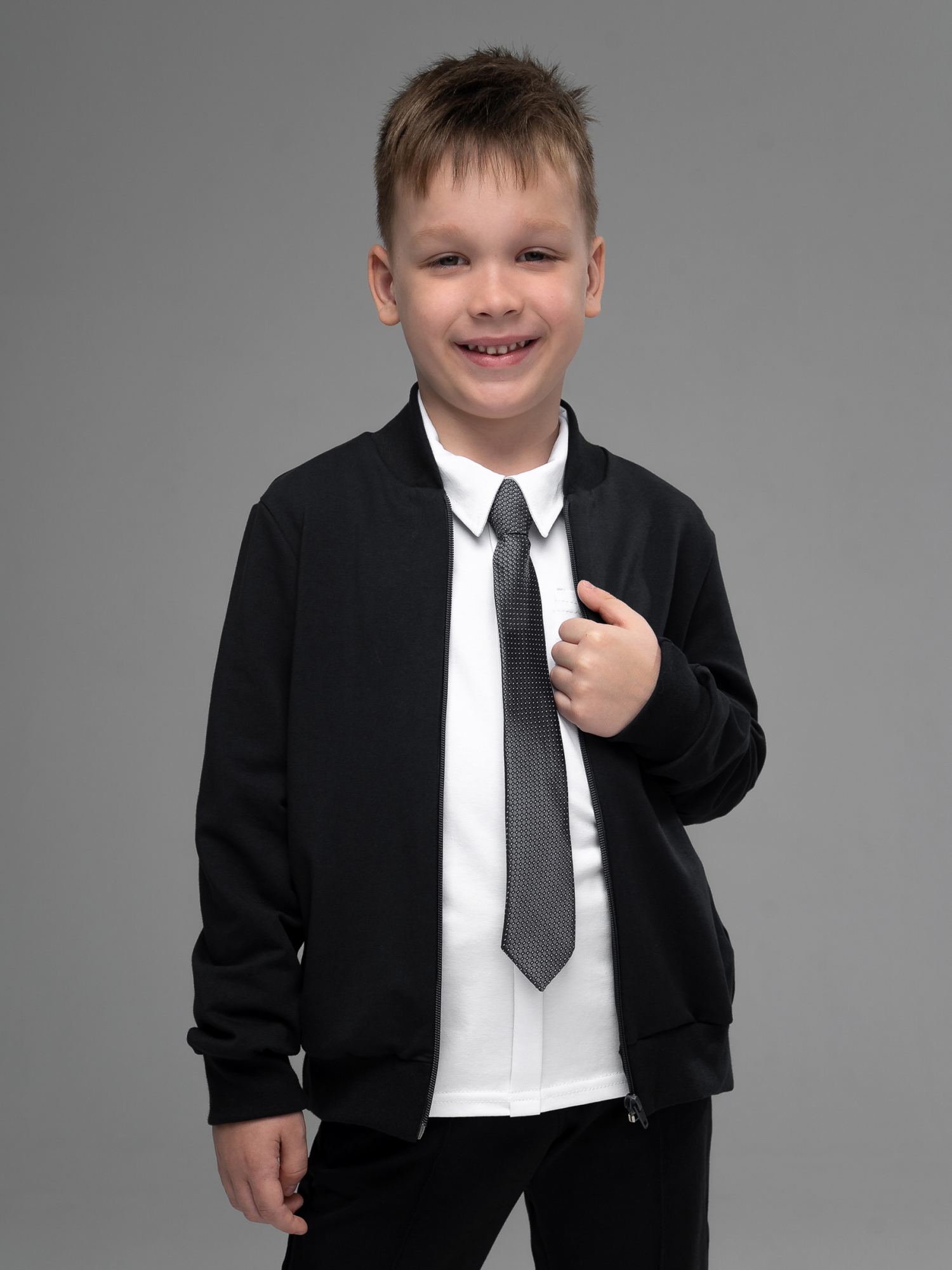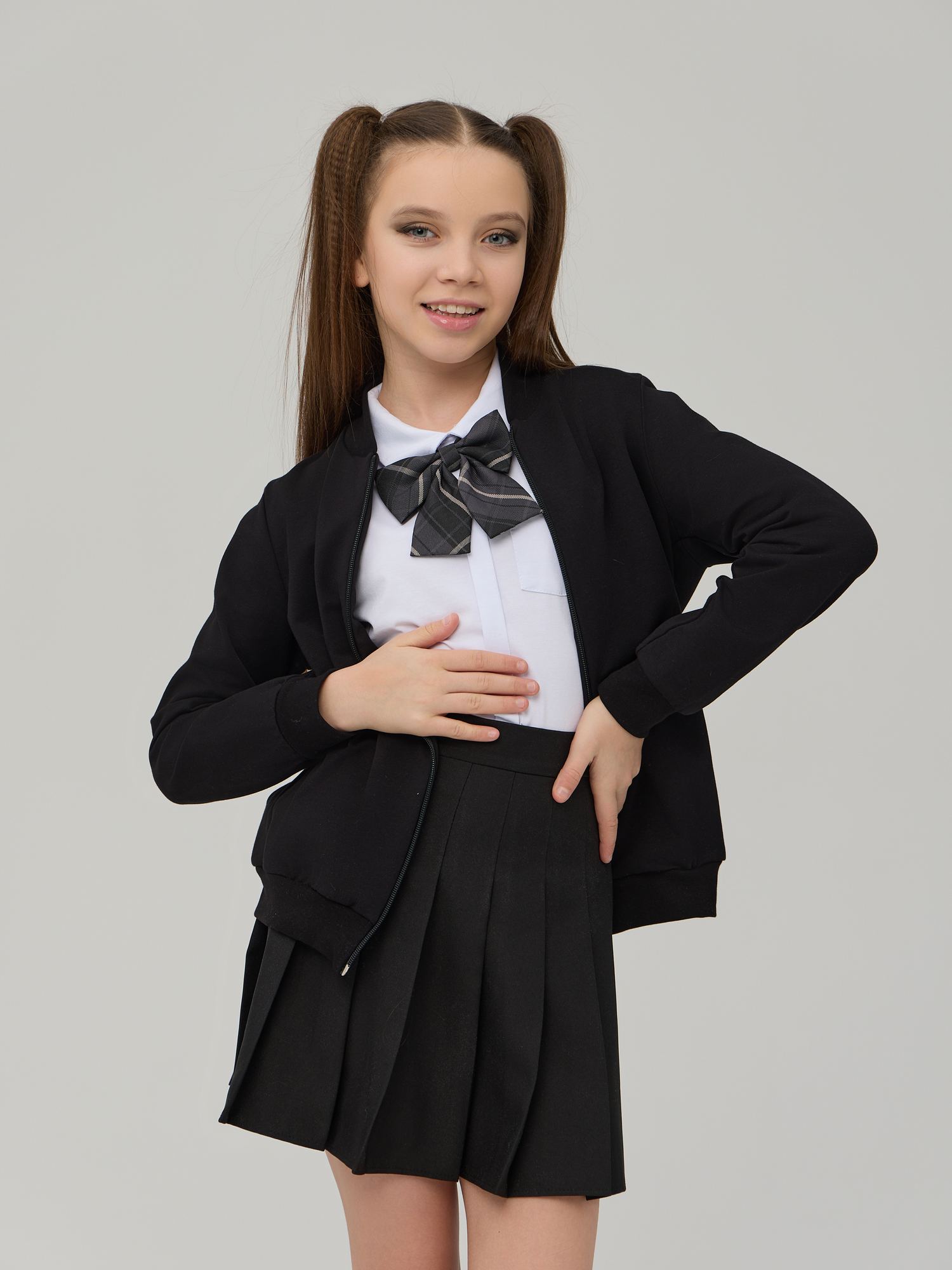Стильный жакет-бомбер из футера черного цвета прямого силуэта с боковыми карманами и длинными рукавами, с застежкой-молнией. Воротник-стойка. Рукава на манжетах, низ изделия с планкой. Изделие выполнено из трикотажа премиального качества - ПЕНЬЕ, с содержанием хлопка более 92%