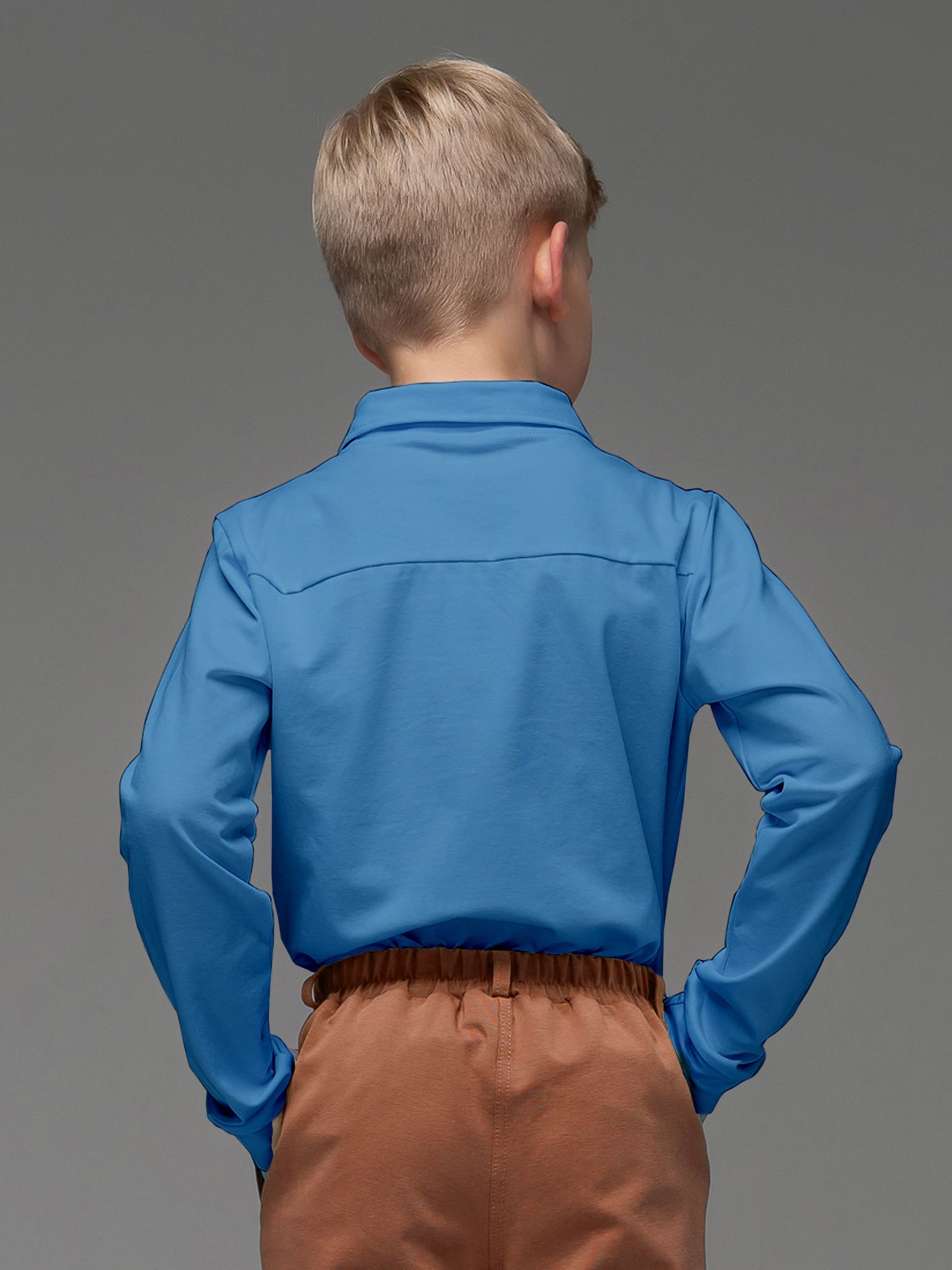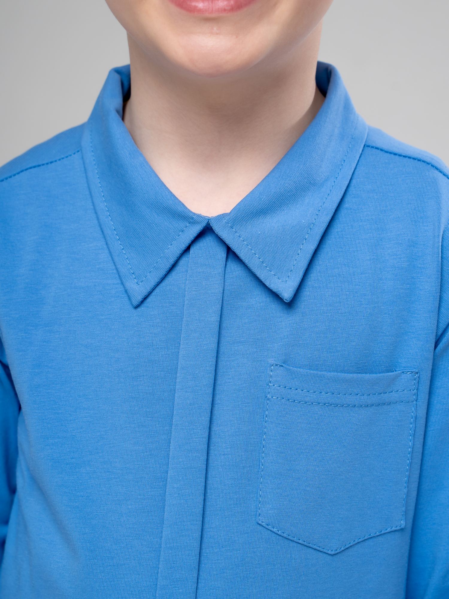 Толстовка а-ля "рубашка" из кулирки голубого цвета для мальчика, с центральной планкой, нагрудным карманом и отложным воротником. Изделие выполнено из трикотажа премиального качества - ПЕНЬЕ, с содержанием хлопка более 95%