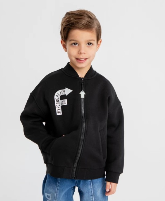 Чёрная толстовка на молнии. Этот бомбер с принтом и шевронами создан для стильных мальчиков. Тёплый, с начёсом и карманами, он идеально подойдёт для прохладной погоды. Крупный принт сзади и шрифтовый принт спереди добавят яркости и оригинальности в образ маленького модника. Бомбер выполнен из качественных материалов - 70% хлопок и 30% полиэстер. Такой состав обеспечивает комфорт и долговечность изделия. Идеальная посадка и универсальный цвет позволит носить бомбер как на прогулки, так и на занятия спортом.