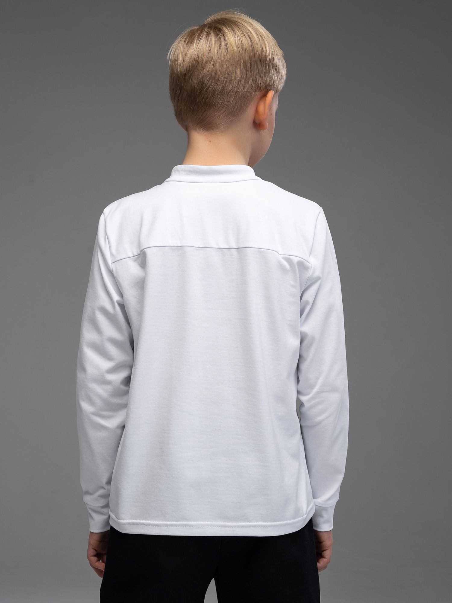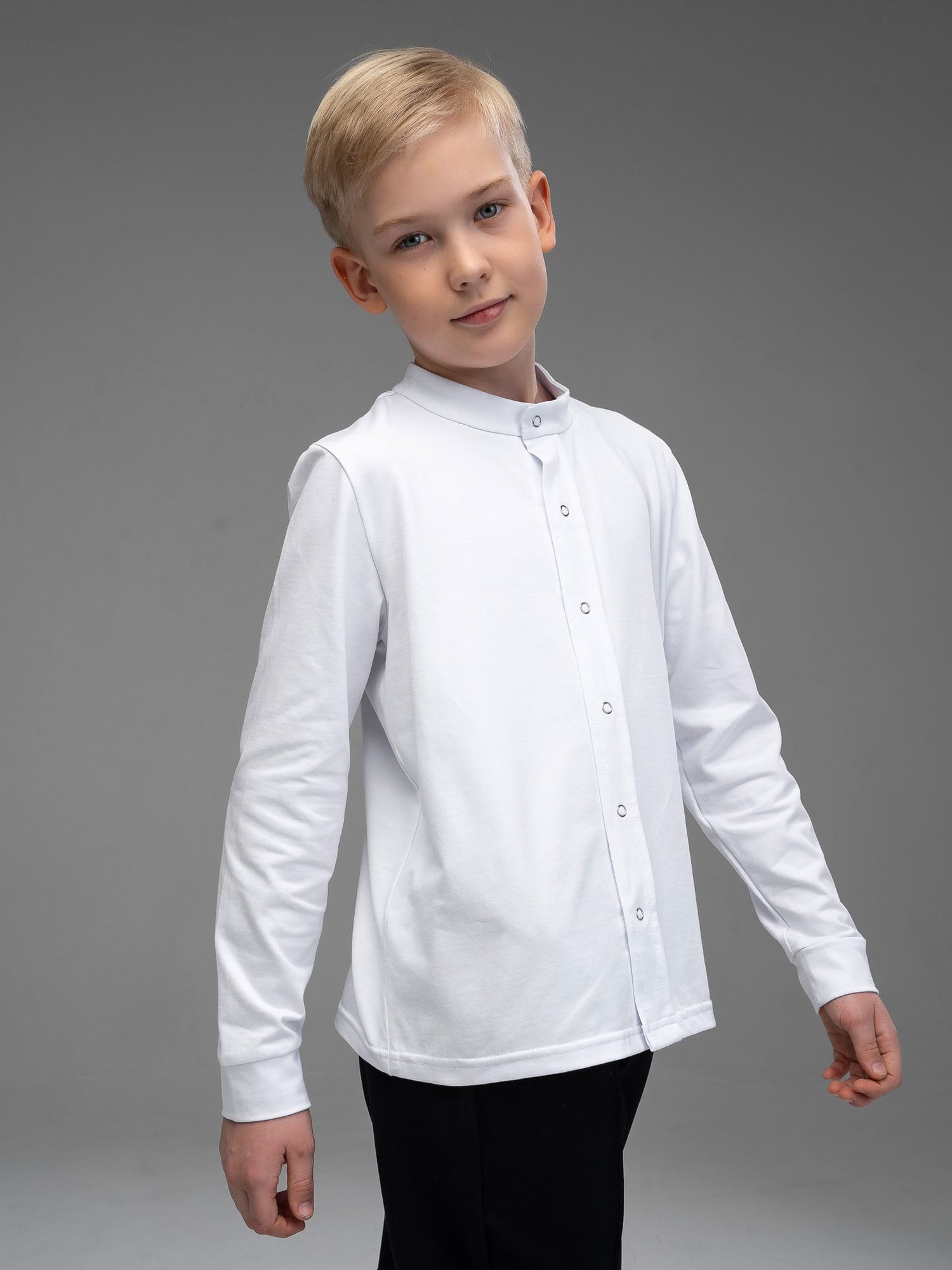 Рубашка из кулирки белого цвета полуприлегающего силуэта с центральной застежкой на кнопки, воротником- стойкой и длинными рукавами идеально подходит для школьной формы или для особых случаев. Длинные рукава с манжетами обеспечивают тепло и комфорт в холодное время года. Воротник-стойка придает изделию элегантный вид. Застежка на кнопки обеспечивает легкость и удобство в использовании. Рубашка отлично сочетается с брюками или джинсами, создавая великолепный стильный образ.