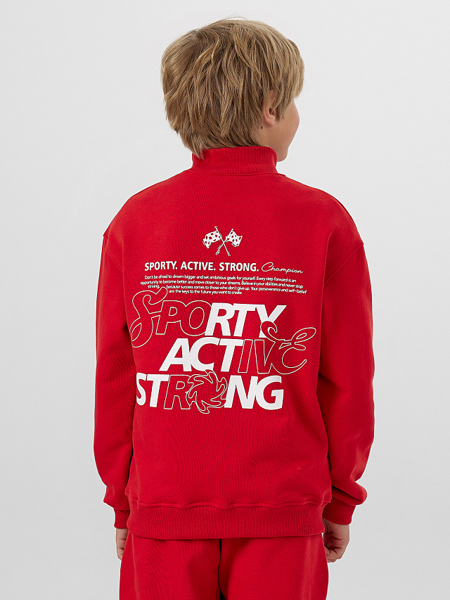 Эта удобная толстовка с мотивирующей надписью "Sporty. Active. Strong" («Спортивный. Активный. Сильный») станет любимой вещью в гардеробе юного непоседы.
