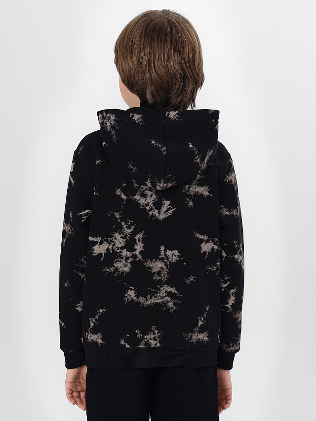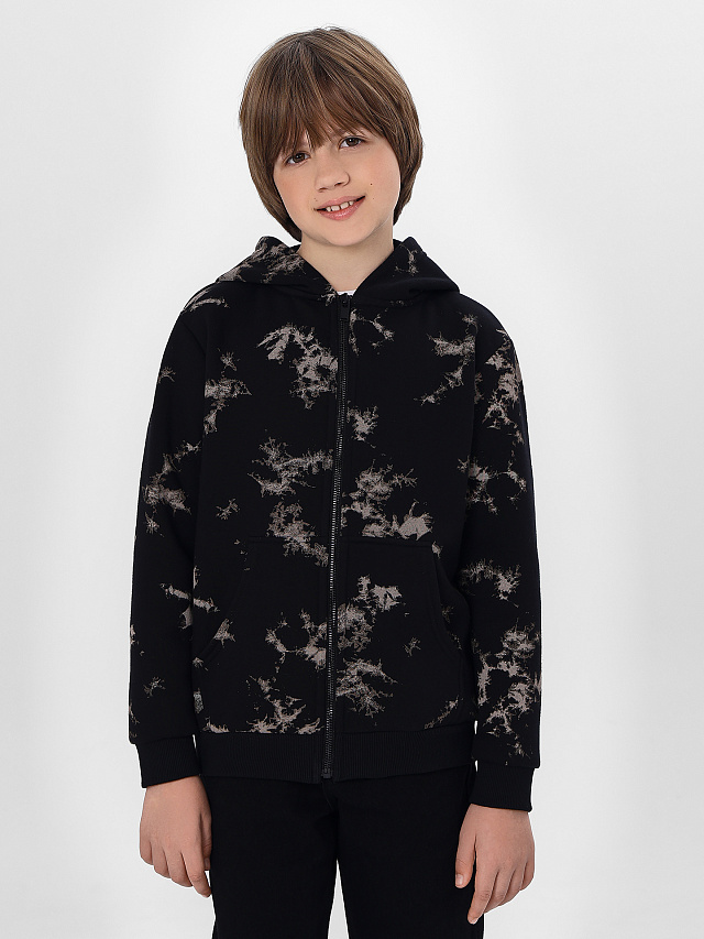 Стильная спортивная толстовка на молнии для мальчиков. Выполнена из теплого и нежного трикотажного футера с подчесом. Прямой свободный силуэт дополнен уютным капюшоном и удобным карманом-кенгуру. Рукава длинные, линия плеча немного спущена. Рекомендуем для прохладной погоды!