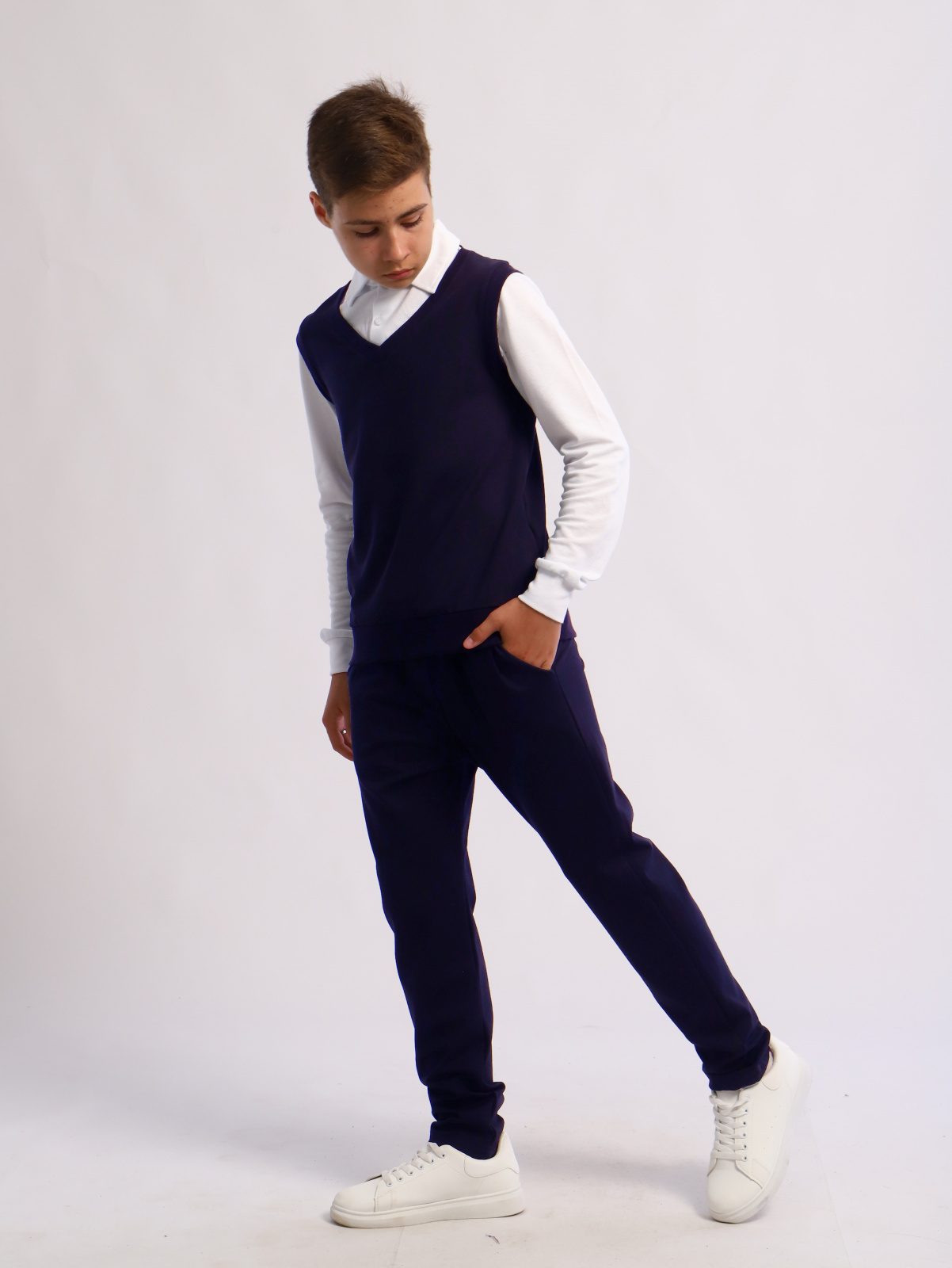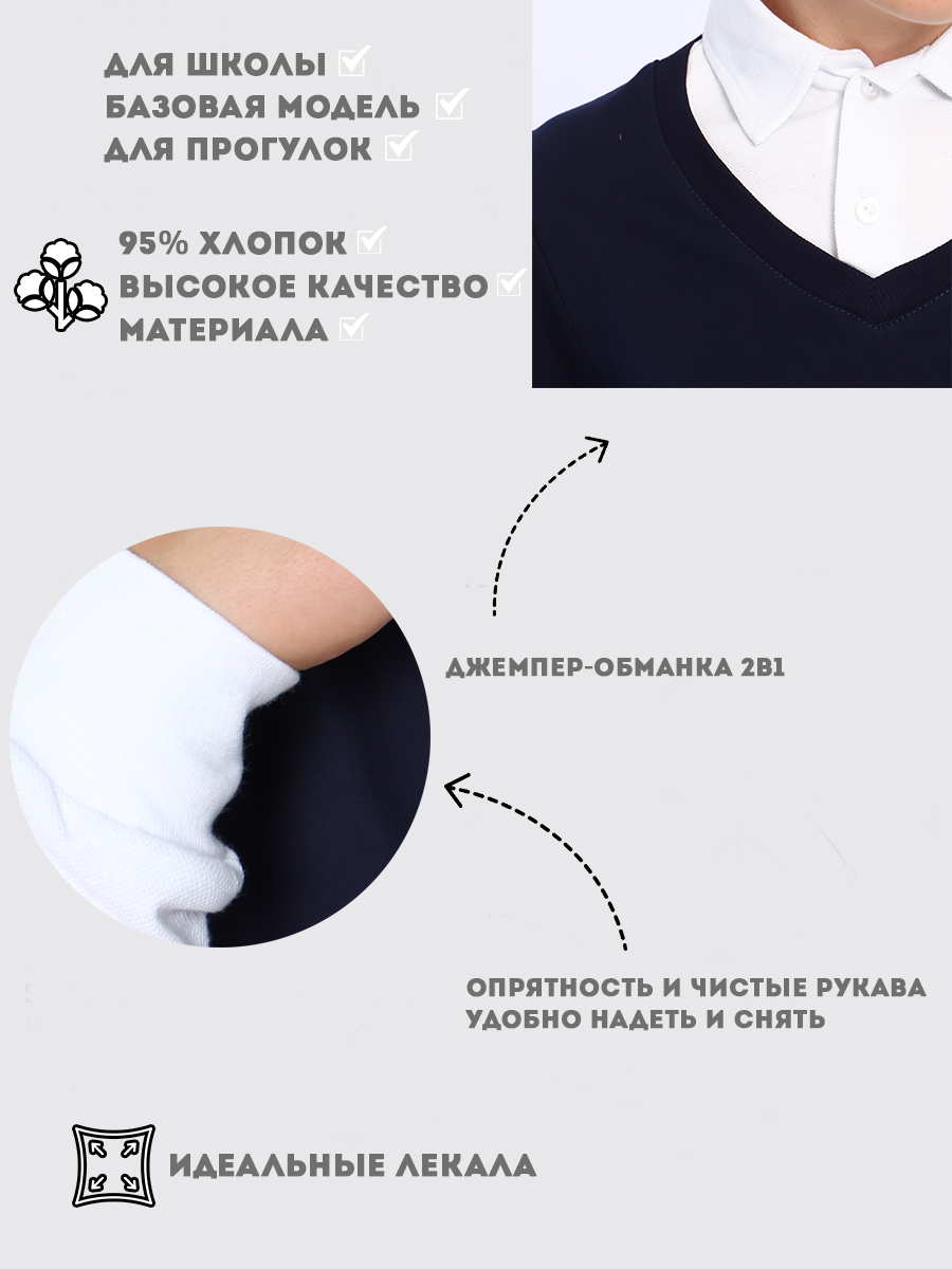 В такой обманке ребенку будет удобно и комфортно. Школьный джемпер можно носить с классическими брюками, джоггерами, спортивками, трико, бриджами, костюмом, пиджаком.