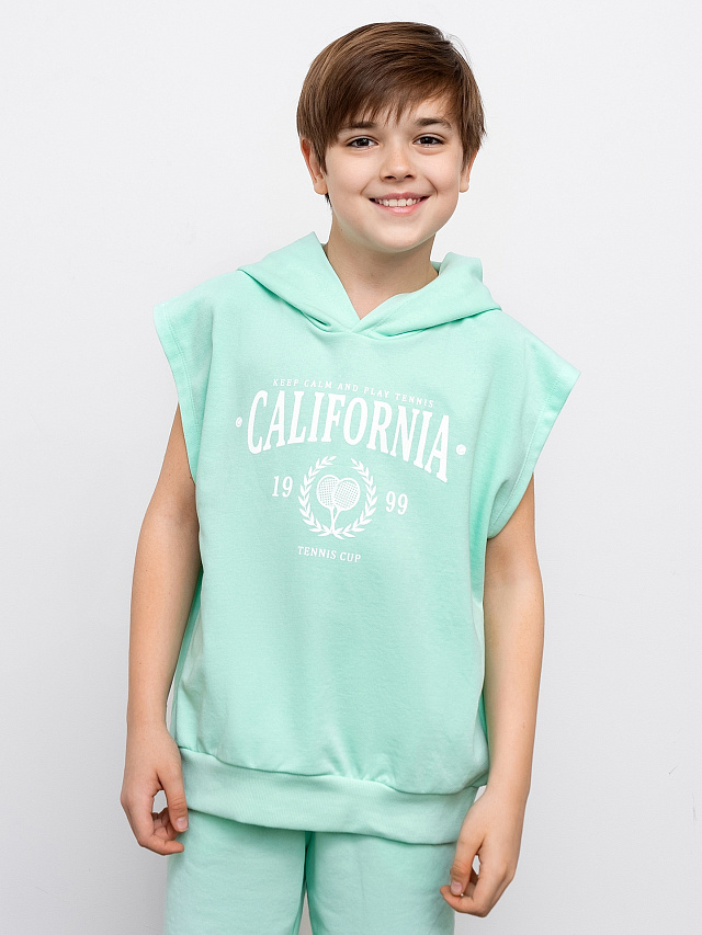 Стильный детский жилет из легкого трикотажного футера для мальчиков. Силуэт модели свободный. Есть просторный уютный капюшон на подкладке. По нижнему краю проходит пояс из рибаны. Широкий размерный ряд. Рекомендуем эту модную и комфортную новинку!