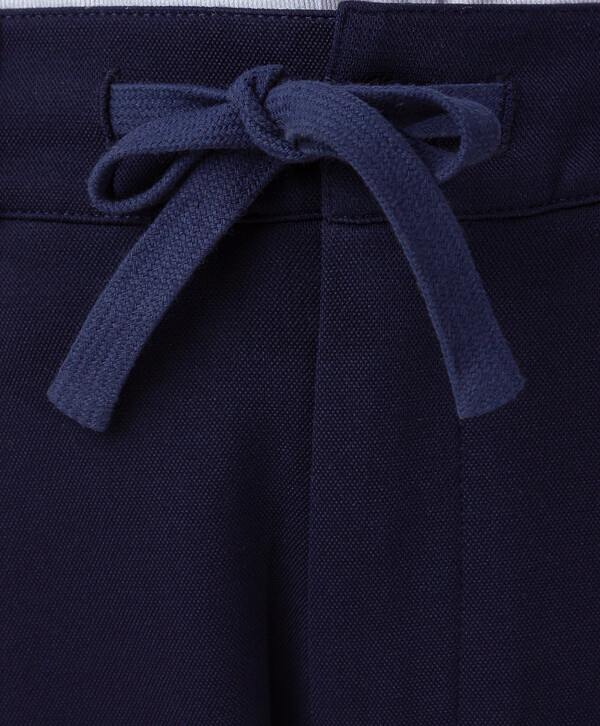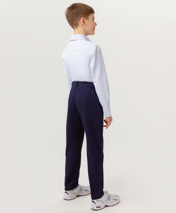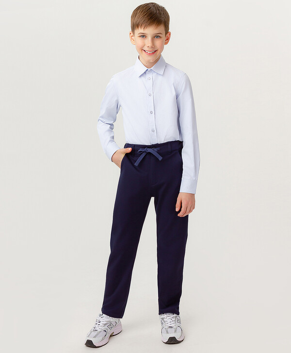 Трикотажные брюки темно-синего цвета для мальчика с поясом на резинке. Модель застегивается на молнию и пуговицу. Для дополнительного удобства и возможности утяжки индивидуально по фигуре пояс оснащен плоскими завязками. Брюки прямого кроя со слегка сужающимися к низу штанинами будут комфортны в носке как на уроках, так и на веселых и активных переменах. По бокам расположены удобные прорезные карманы. Пояс оснащен шлейками под ремень. Брюки из вискозы, нейлона и эластана приятны на ощупь, обеспечивают качественный воздухообмен и оптимально растяжимы. Такой элемент школьной формы идеально сочетается с любым верхом из коллекции Баттон Блю и позволяет создавать стильные образы на День знаний, для торжественных линеек и любых праздничных и повседневных мероприятий как в учебном заведении, так и за его пределами.