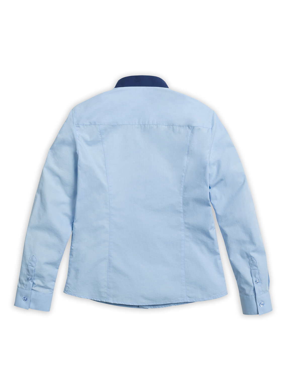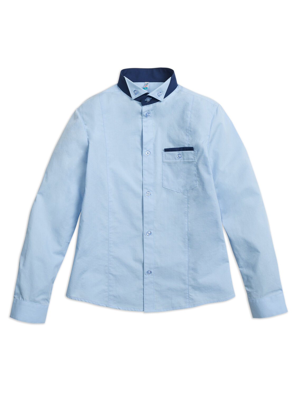 Рубашка для мальчиков с длинным рукавом. Сорочка прилегающего силуэта с вертикальными рельефами на переде и спинке. Воротник классическая невысокая стойка из ткани контрастного цвета, с отгибающимися уголками в цвет основной ткани, пристегивающимися на пуговицы к стойке. Карман с имитацией выглядывающего платка в цвет воротника-стойки.