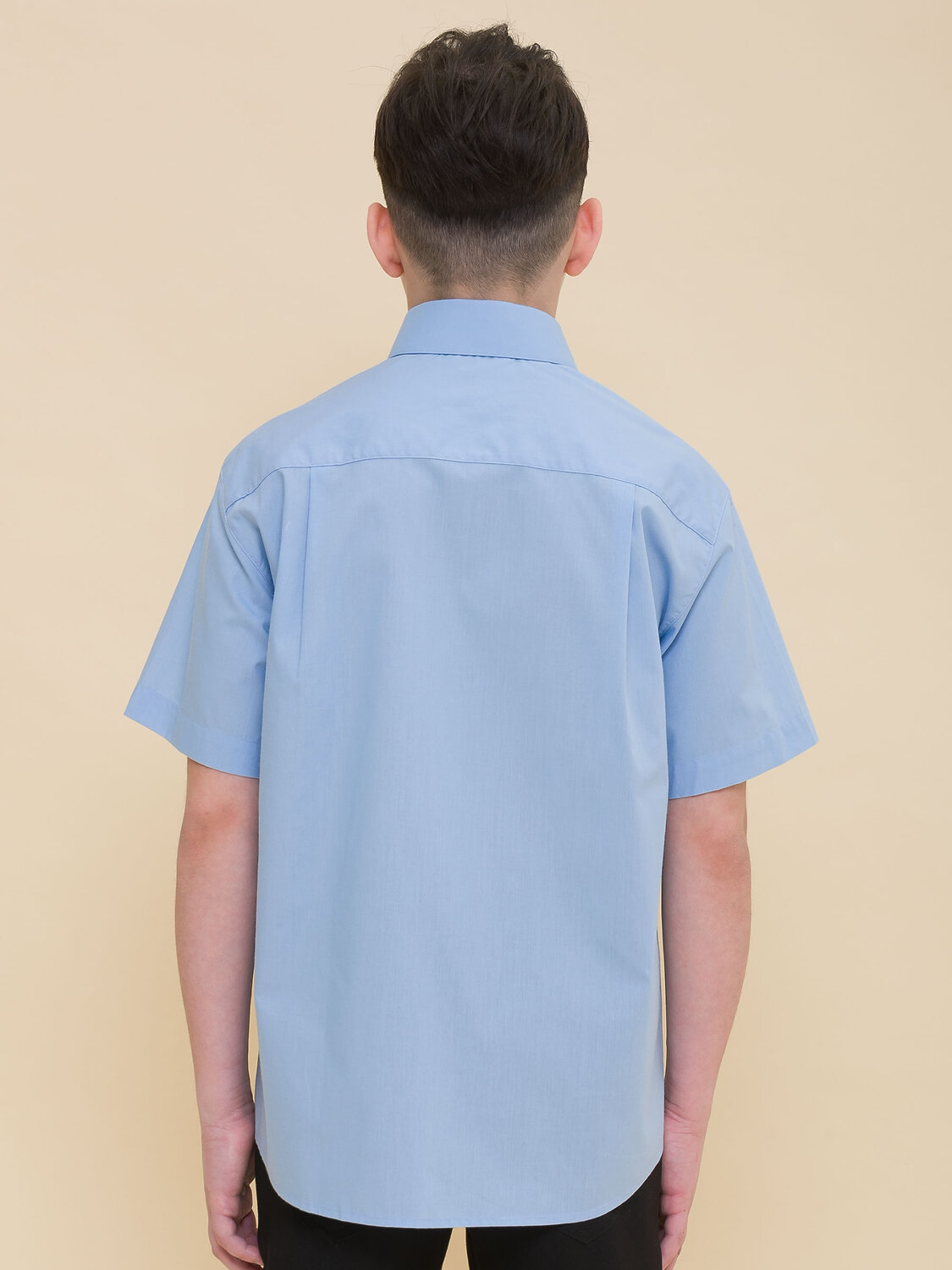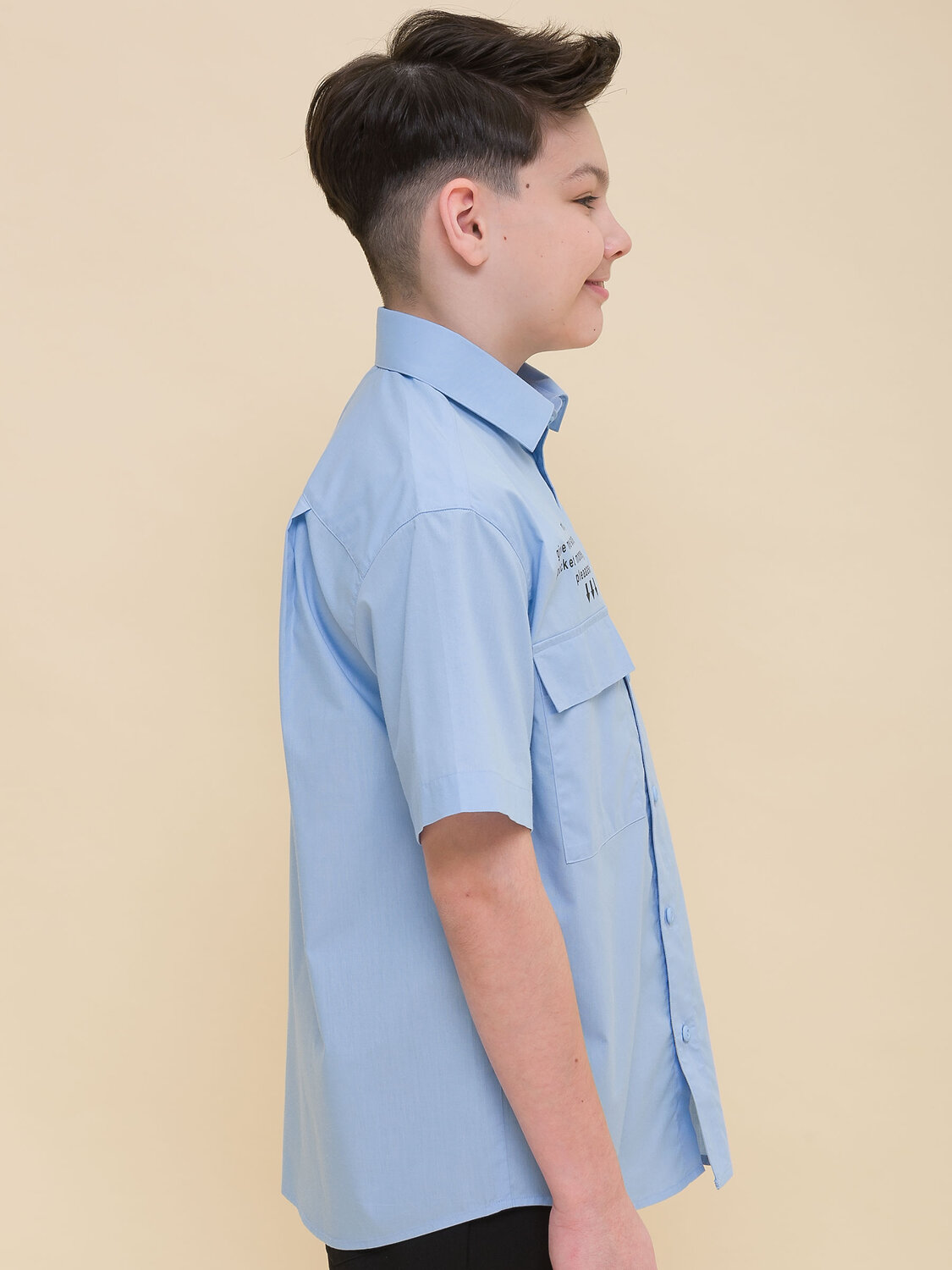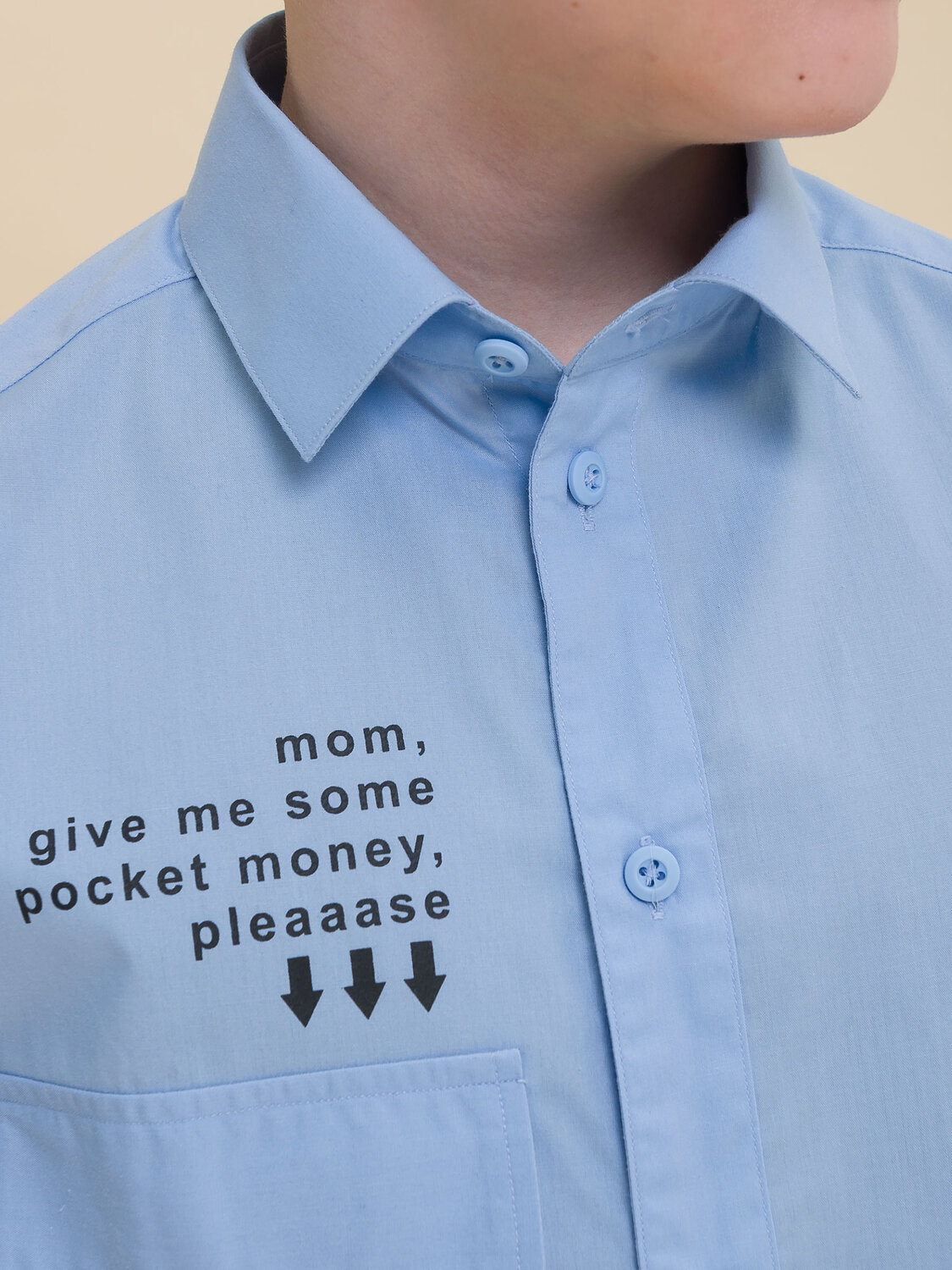 Школьная рубашка свободного силуэта для мальчика. В составе ткани преобладает хлопок — модель мягкая, приятная на ощупь и пропускает воздух. Полиэстер помогает не терять форму и превосходный внешний вид. По спинке кокетка с двумя защипами для свободы движения. Накладной карман с клапаном — актуальный модный тренд. Над карманом изделие украшает забавный принт, мягкий и устойчивый к частым стиркам. Перевод: «Мама, положи в мой карман деньги, пожааалуйста». Рубашка отлично сочетается с различными брюками, пиджаками, жилетами и подходит мальчикам с разными типами фигуры. Модный и практичный вариант школьной сорочки для мальчика.