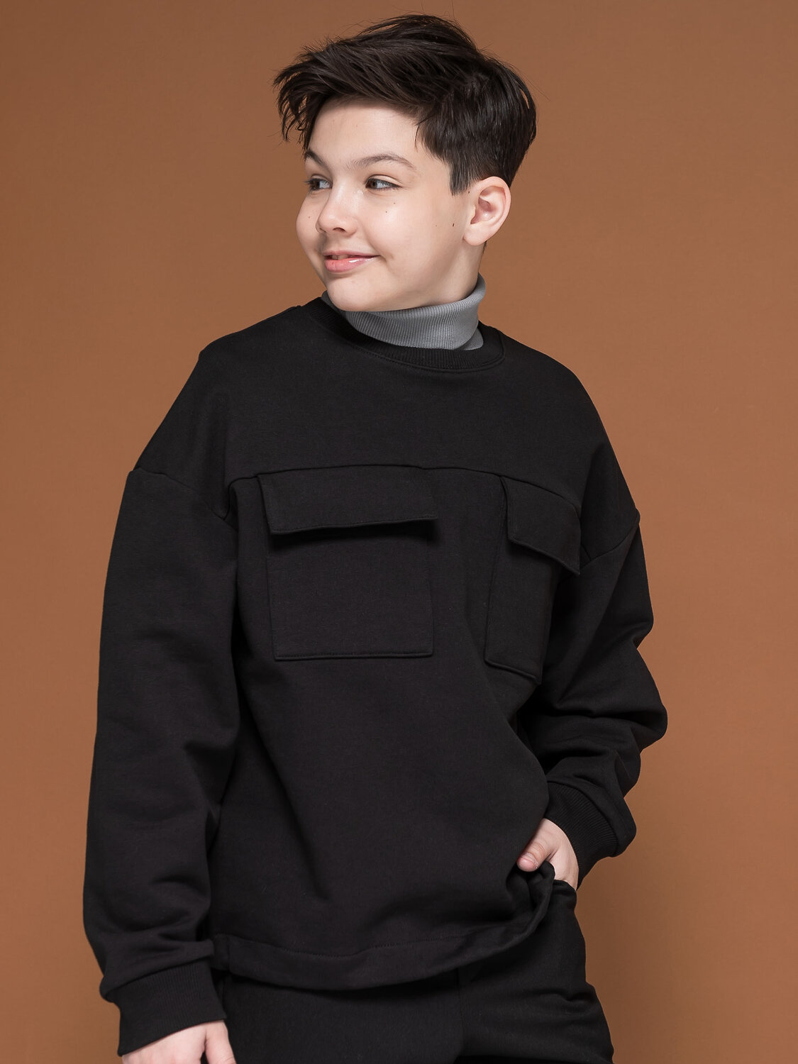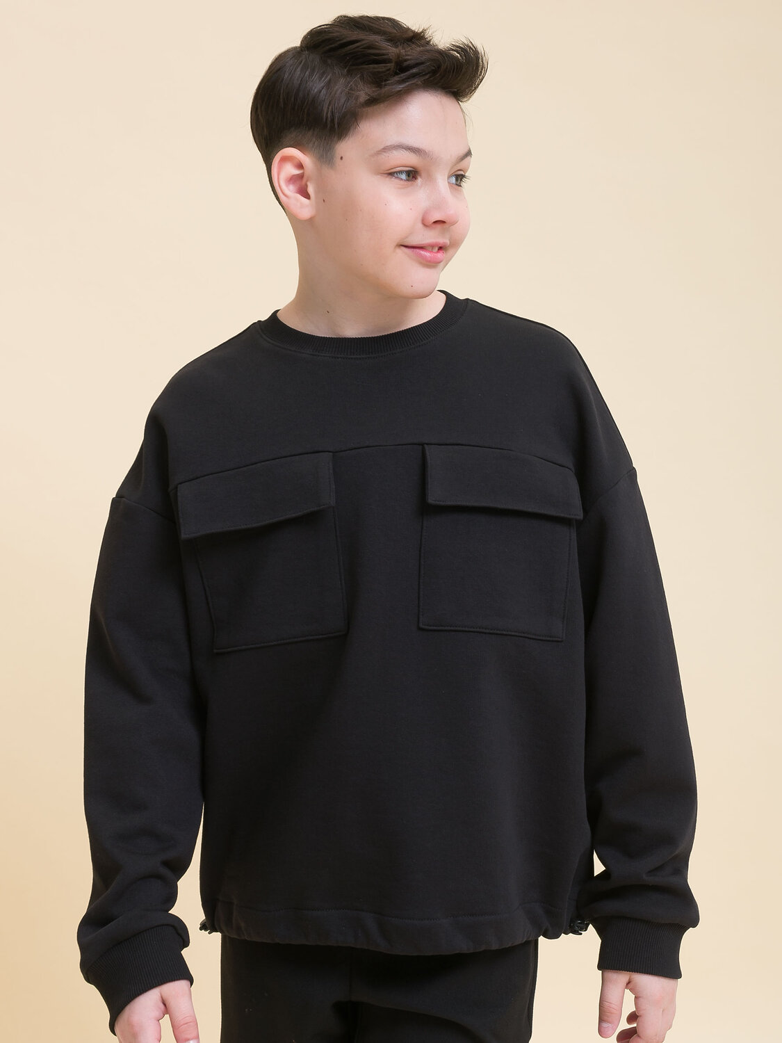 Толстовка из футера оверсайз-силуэта со спущенным плечом для мальчика. В составе ткани 100% хлопка — изделие мягкое, дышащее и приятное на ощупь. Горловина и манжеты отделаны рибаной — удобно надевать и снимать, рукава не сползают. По низу изделия внутренний эластик со стопперами по бокам — с их помощью можно регулировать объём и менять силуэт. На груди два накладных кармана с клапанами для хранения важных мелочей. Актуальная и стильная модель оверсайз-силуэта подходит мальчикам с разными типами фигуры. Можно брать на вырост — благодаря объёму толстовка будет словно «расти» вместе с ребёнком, долго не станет малой. Модный и практичный вариант школьной одежды для мальчиков.