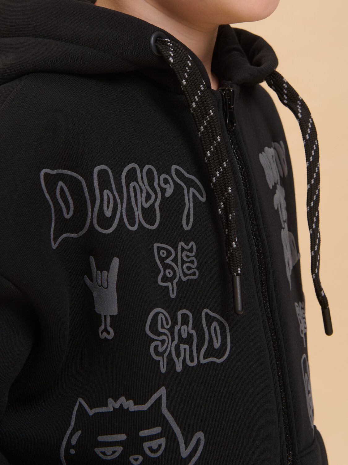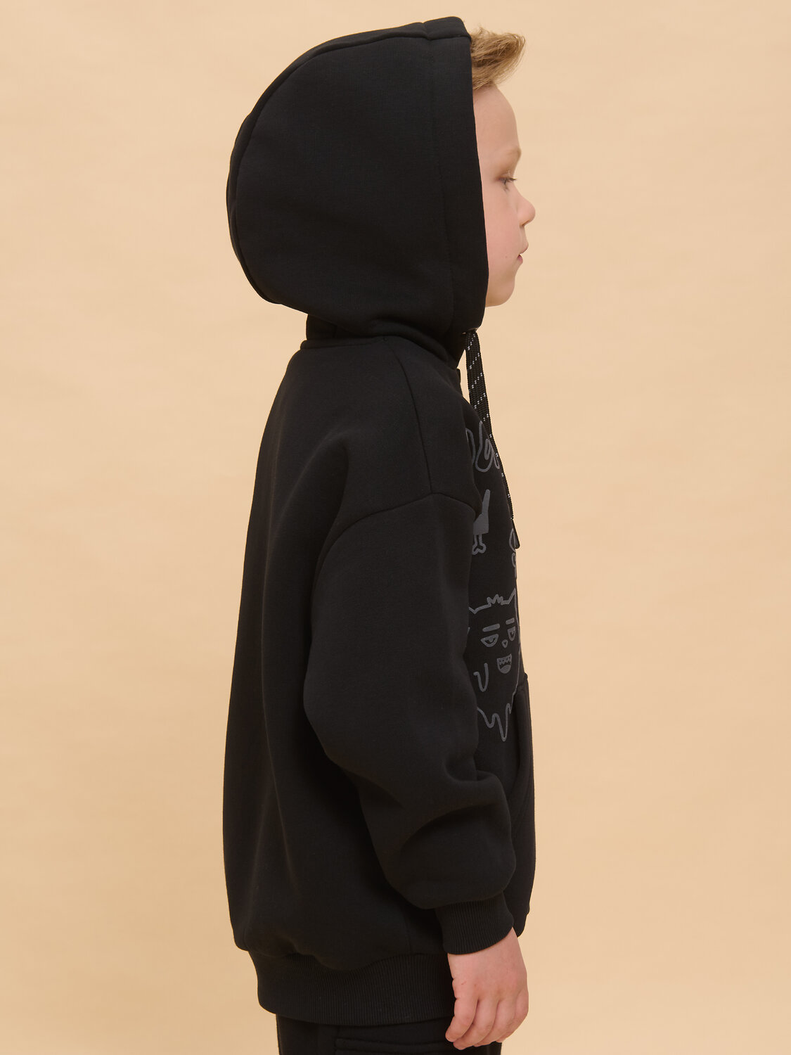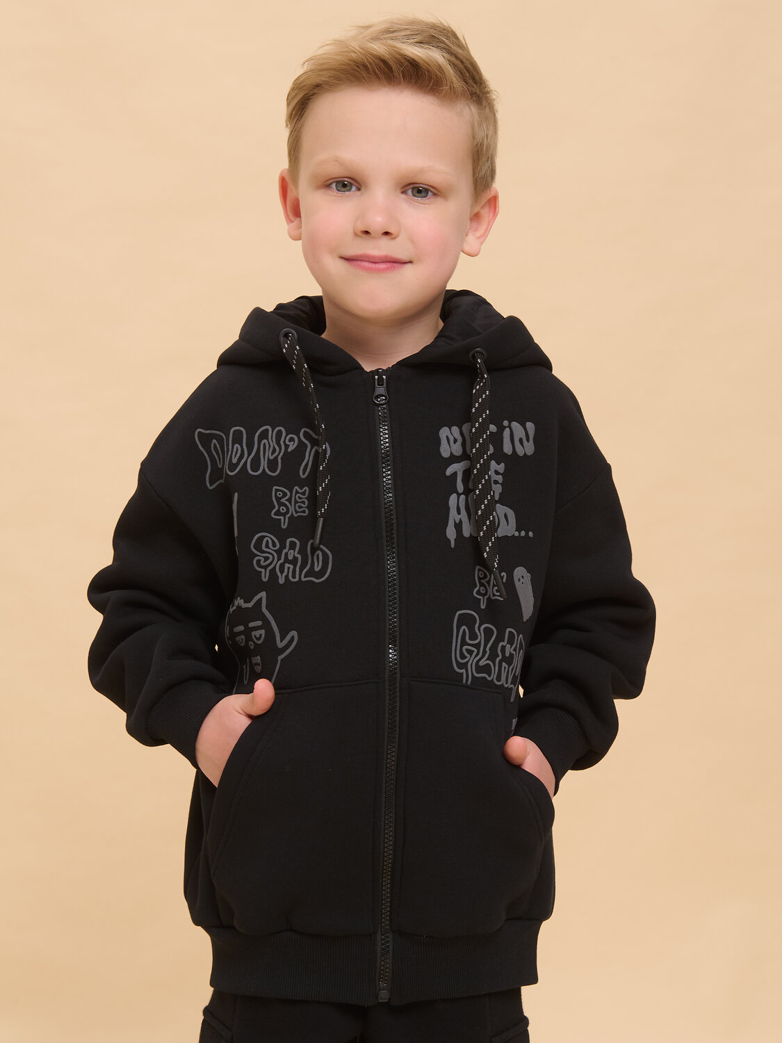 Худи зипка для мальчиков. Трикотажная куртка оверсайз из футера с начёсом заменит ветровку в прохладную погоду. Толстовка детская застёгивается на центральную молнию. В составе ткани преобладает хлопок — зипка мягкая, воздухопроницаемая и очень комфортная. Полиэстер обеспечивает изделию прочность и долговечность. Регулируемый капюшон и манжеты из эластичной рибаны по рукавам и низу защитят от холода и ветра. По переду куртка детская дополнена объёмными накладными карманами. Зипка — базовый элемент для детского и подросткового гардероба. Легко сочетается с джинсами, спортивными брюками и брюками карго. Толстовка для мальчика на молнии декорирована графичными монохромными принтами в готическом стиле по переду. Принты эластичные и стойкие, без проблем переносят частные стирки. Стильная и практичная худи на молнии для мальчика неприхотлива в уходе. Помните о правильном уходе за изделием: рекомендуется стирать при температуре не выше 30 °C, без предварительного замачивания, с изнанки. Это поможет сохранить качество и цвет куртки на длительное время. Не забывайте о выборе правильного размера. Используйте таблицу размеров на фотографии, чтобы выбрать подходящий вариант для вашего мальчика. Обратите внимание, что цвет товара на экране вашего устройства может отличаться от реального.