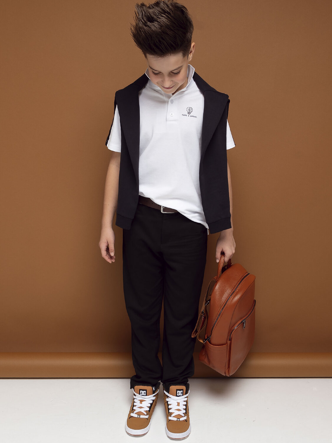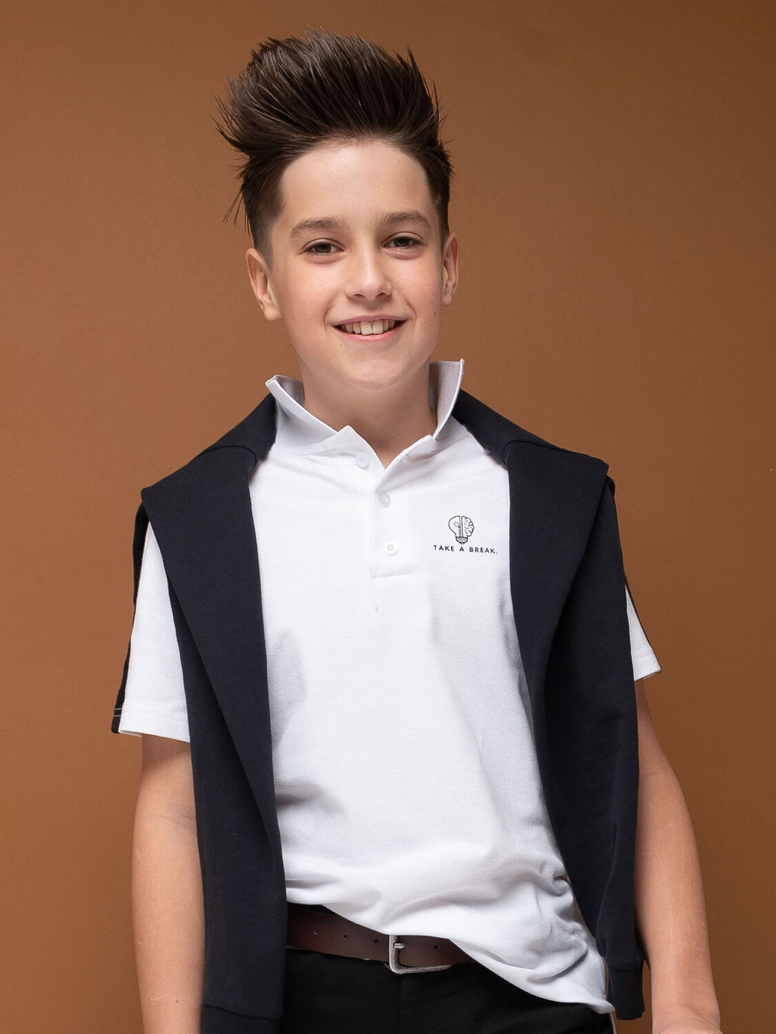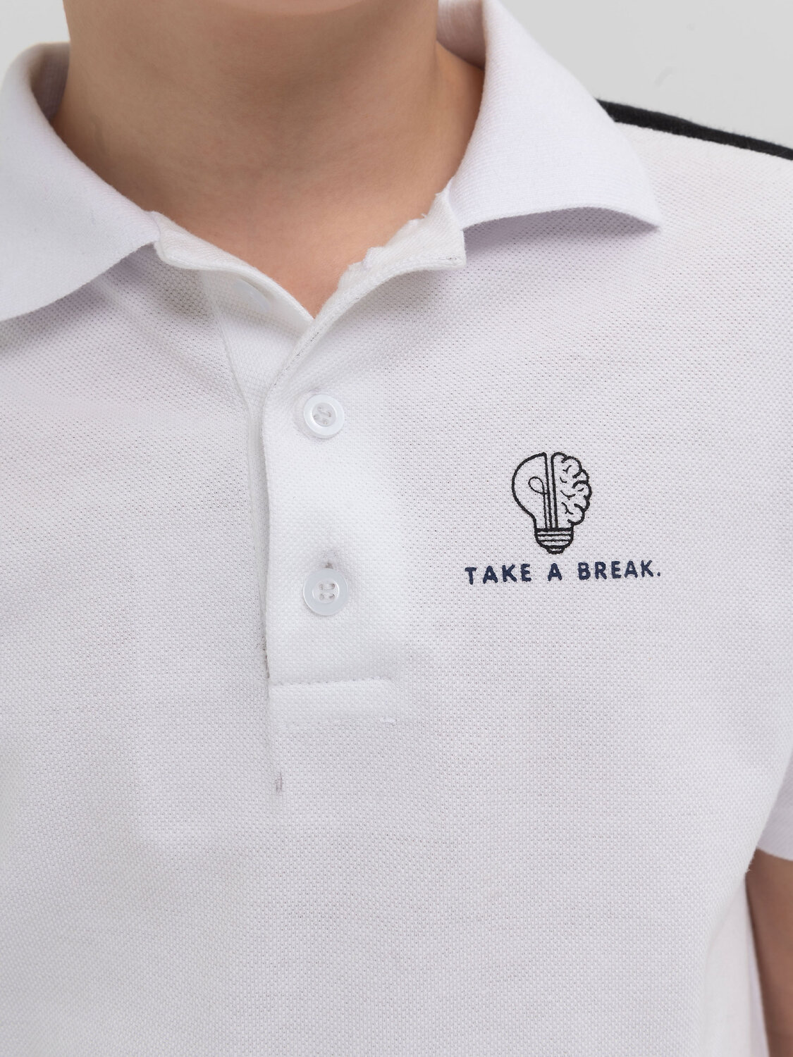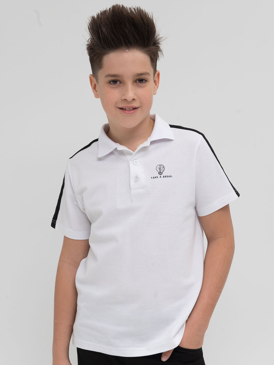 Эта футболка-поло понравится мальчишкам за спортивный стиль, удобный фасон, декор на рукаве в виде настроченной контрастной киперной ленты и заметный текстовый принт Сделай перерыв (перевод). А их мамы будут довольны тем, что футболка хорошо впитывает влагу и пропускает воздух, легко стирается и не теряет цвет. Эта модель подойдет к любым брюкам или джинсам. Под пиджак или спортивную куртку. Актуальная модель для любого гардероба.