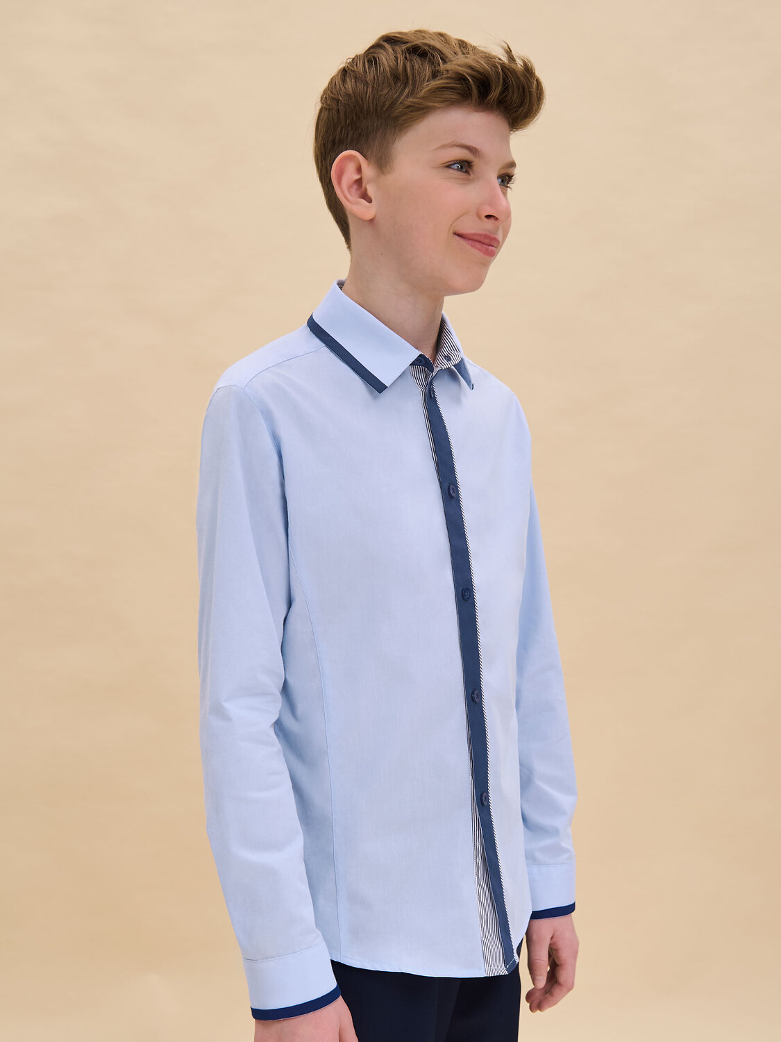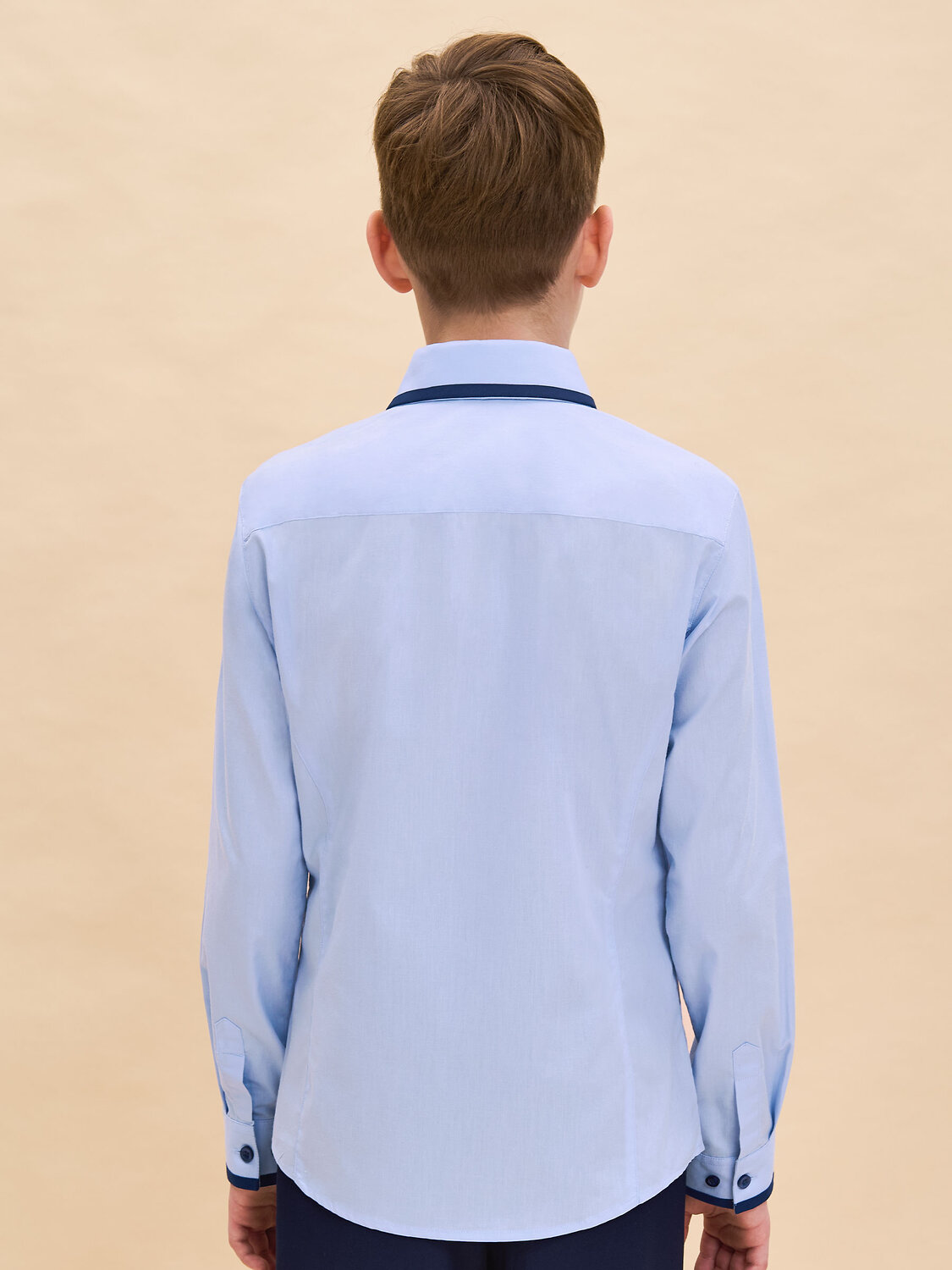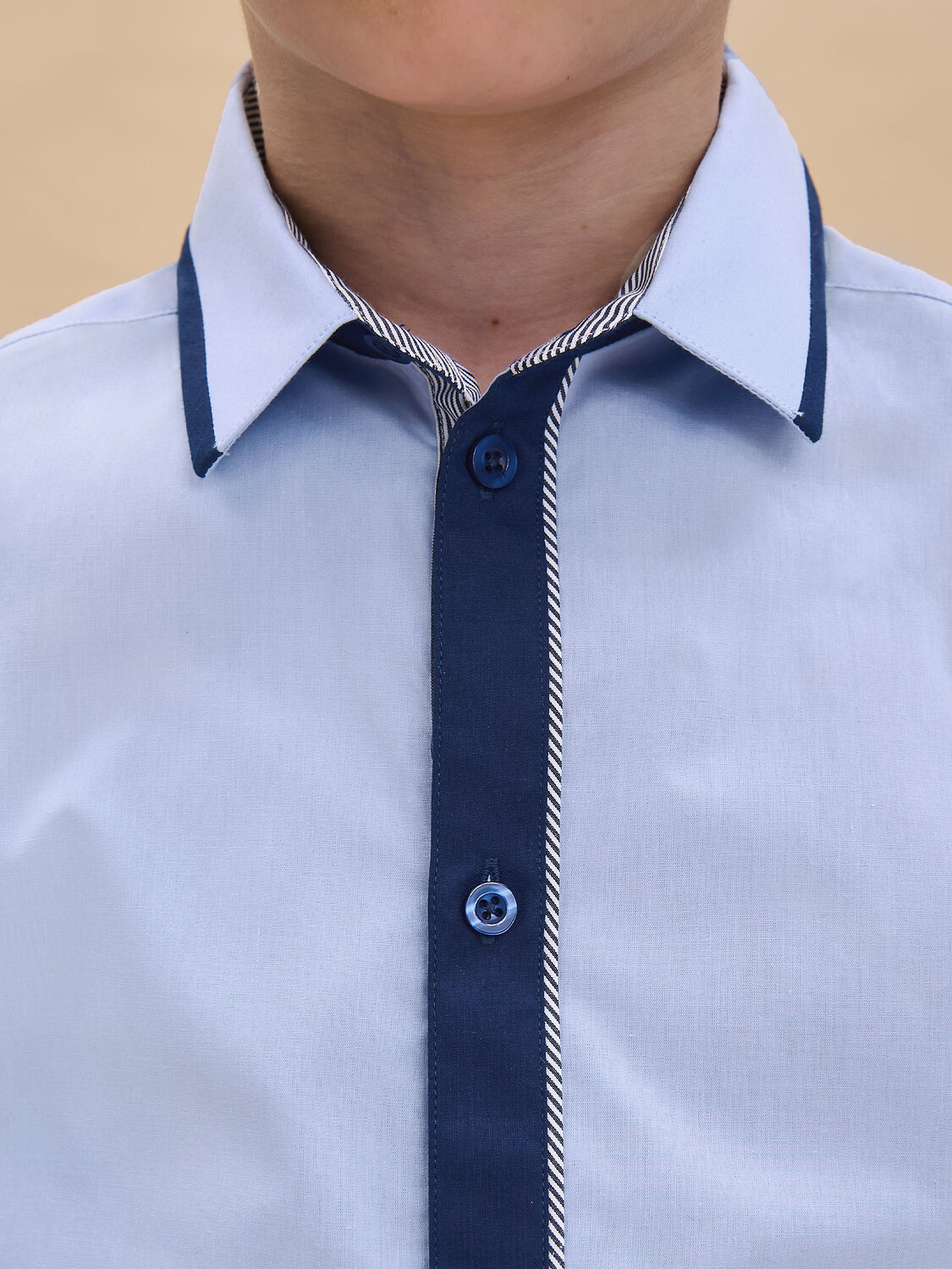 Рубашка для мальчика школьная — это не просто часть школьной формы, это элемент стиля, который придает образу элегантность и изысканность. Модель полуприлегающего силуэта с рельефами от проймы по переду и спинке. Внешний вид рубашки детской завершает воротник типа «Виндзор», который открывает возможность носить ее как с классическим галстуком, так и без него. Особенно привлекательна сорочка для мальчика контрастной отделкой по стойке, внешнему краю воротника, внешней планке и манжетам. Темные оттенки отделки делают рубашку еще более утонченной и позволяют реже стирать изделие, сохраняя его первоначальный вид на протяжении долгого времени. В составе ткани преобладает высококачественный хлопок, который обеспечивает отличную вентиляцию и позволяет коже дышать, не создавая дискомфорта даже в теплую погоду. Добавление полиэстера делает рубашку на мальчика более устойчивой к многократным стиркам и помогает сохранить ее форму на протяжении долгого времени. Для школьных рубашек мы используем сорочечную ткань, плотностью 100 гр/м2. В ассортименте представлены несколько универсальных цветов рубашки на мальчика: белый и голубой, которые легко сочетаются с различными брюками, пиджаками и жилетами. Эта стильная рубашка школьная — отличный выбор для повседневной носки или для особых торжественных случаев. Рекомендуемый уход за рубашкой: стирка при температуре не выше 30 °С, без предварительного замачивания, с изнанки, и расправить перед сушкой. При правильном уходе рубашка не потеряет внешнего вида. Пожалуйста, выбирайте нужный размер, ориентируясь на таблицу размеров на фото. Обратите внимание, что цвет товара на экране вашего устройства может немного отличаться от цвета реального изделия.