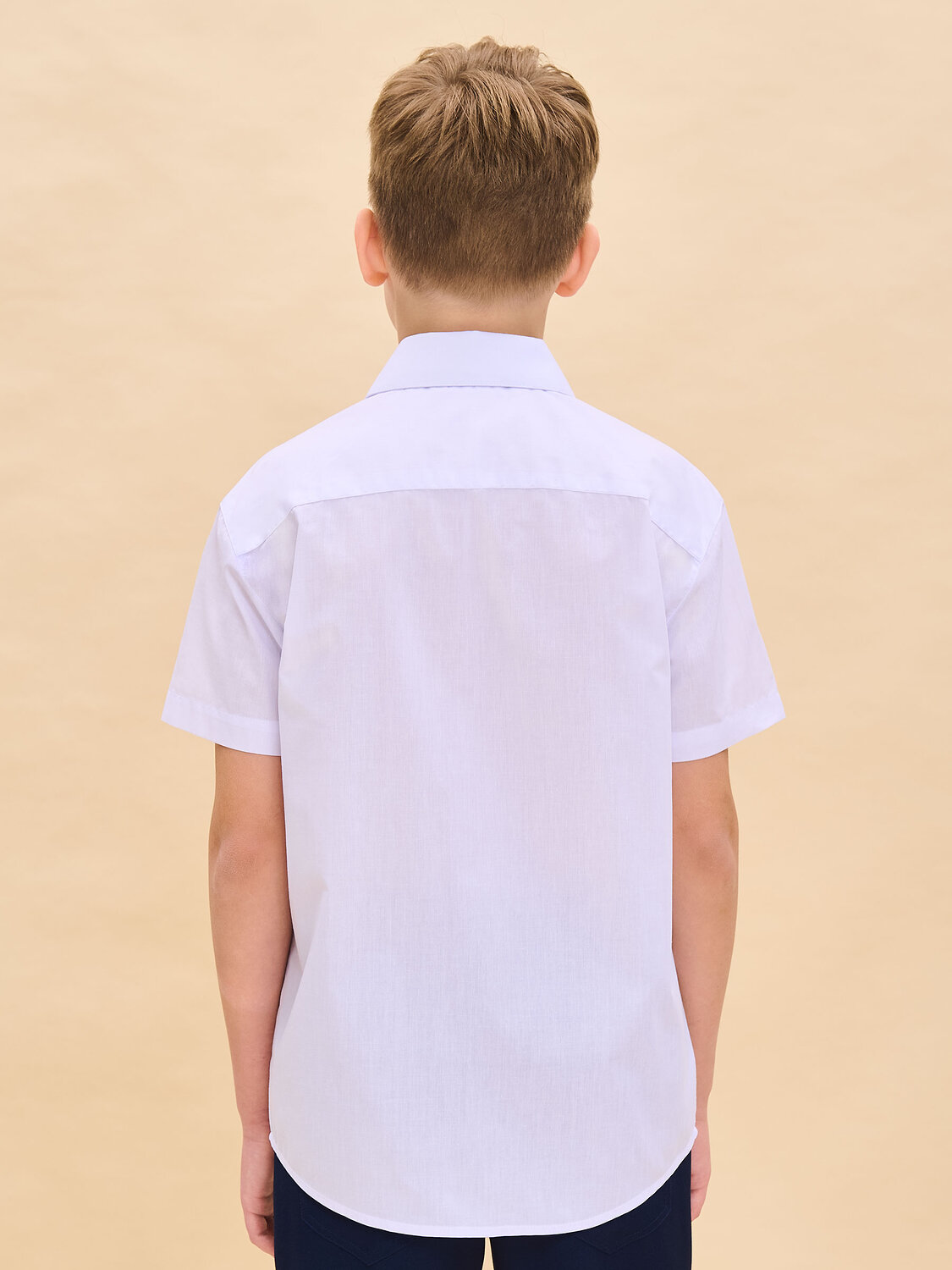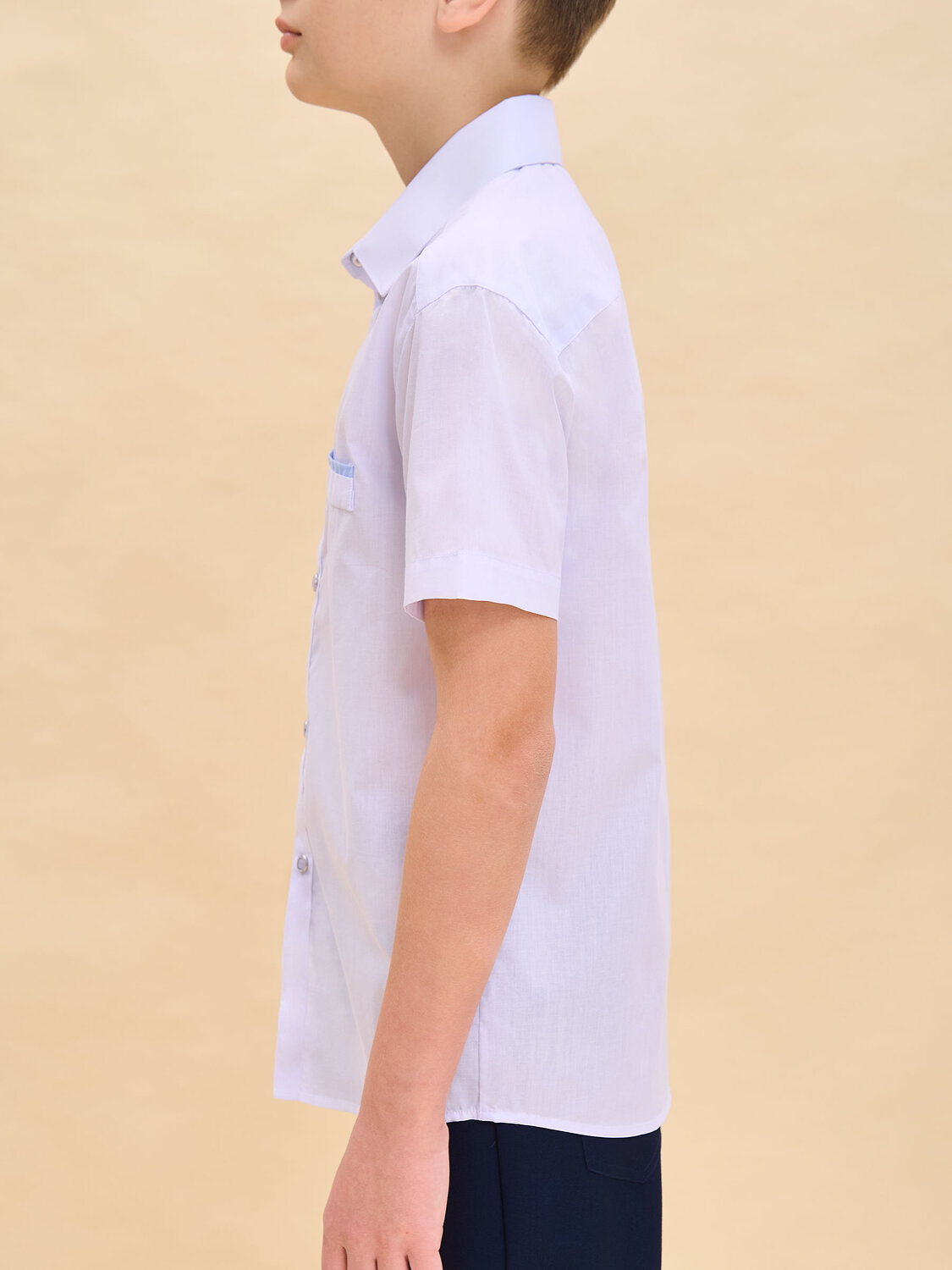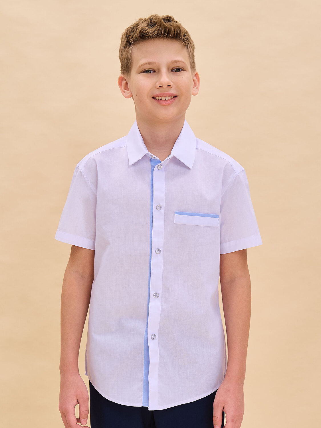 Школьная рубашка прямого силуэта для мальчика. Рубашка детская с классической центральной застёжкой на кнопки, имитирующие пуговицы — ребёнок легко и быстро застегнёт и расстегнёт. На груди имитация прорезного кармана. Вдоль планки и на кармане контрастный кант — яркая деталь, выгодно отличающая эту модель от банальных однотонных рубашек. В составе ткани преобладает качественный хлопок — рубашка для мальчика мягкая, воздухопроницаемая и комфортная для ребёнка. Полиэстер помогает изделию не терять форму и отличный внешний вид — рубашка прослужит не один сезон. Сорочка детская лаконичного дизайна, без принта, её легко сочетать с различными брюками, пиджаками, жилетами. Красивая и практичная рубашка в школу для мальчика — подходит как для повседневной носки, так и для более торжественных случаев. Рекомендуемый уход: стирать при температуре не выше 30 °С, без предварительного замачивания, с изнанки, расправить перед сушкой. Выбирайте нужный размер по таблице размеров на фото. Цвет товара на экране вашего устройства может отличаться от цвета изделия вживую.