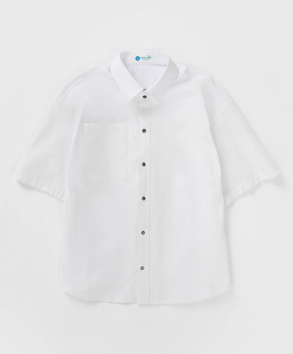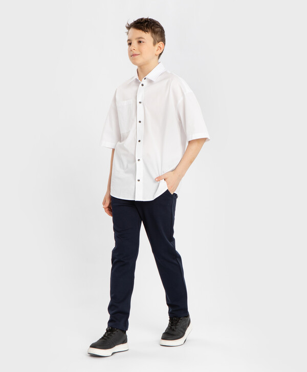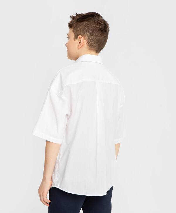 Белая школьная рубашка оверсайз с коротким рукавом и отложным воротником для мальчика. Эта модель от Button Blue выполнена из хлопка, благодаря чему в такой рубашке мальчику будет удобно на протяжении всего дня. Материал дышит, он мягкий и простой в уходе. Полиэстер в составе отвечает за износостойкость, сохранность формы и стойкость цвета даже после продолжительной носки. Плотный отложной воротник и такие же плотные манжеты добавляют официальности. Сорочка застегивается на кнопки. Это еще один плюс, ведь изделие удобно и быстро надевать и снимать. На планке с кнопками есть неброская белая вышивка с названием бренда. Модель со спущенной линией плеча не сковывает, а свободы движениям добавляет защип на спине. Рубашка с круглым подолом идеально впишется в школьный гардероб. Ее легко будет сочетать с любой формой. Швы идеально обработаны, что гарантирует долговечность изделия. Плотность рубашки средняя - слегка просвечивается. Сорочка отлично смотрится как навыпуск, так и заправленная. Следуйте рекомендациям по уходу, указанным на вшивной этикетке.