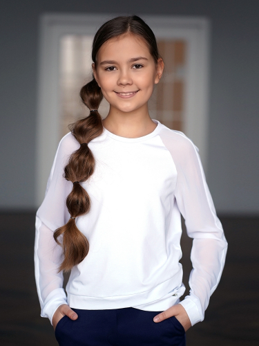 Школьная блузка для девочек выполнена в свободном стиле, подчеркивающем комфорт и удобство. Модель отличается удобным поясом-резинкой, обеспечивающим оптимальный силуэт и свободу движений. Рукава выполнены в стиле реглан, создавая стильный и современный образ. Акцент на область плеча выполнен изящным кружевом, придающий изделию особую нежность и женственность. Открытая горловина добавляет легкости и свежести образу, делая блузку универсальным выбором для повседневного и школьного гардероба. 92% хлопок, 8% лайкра