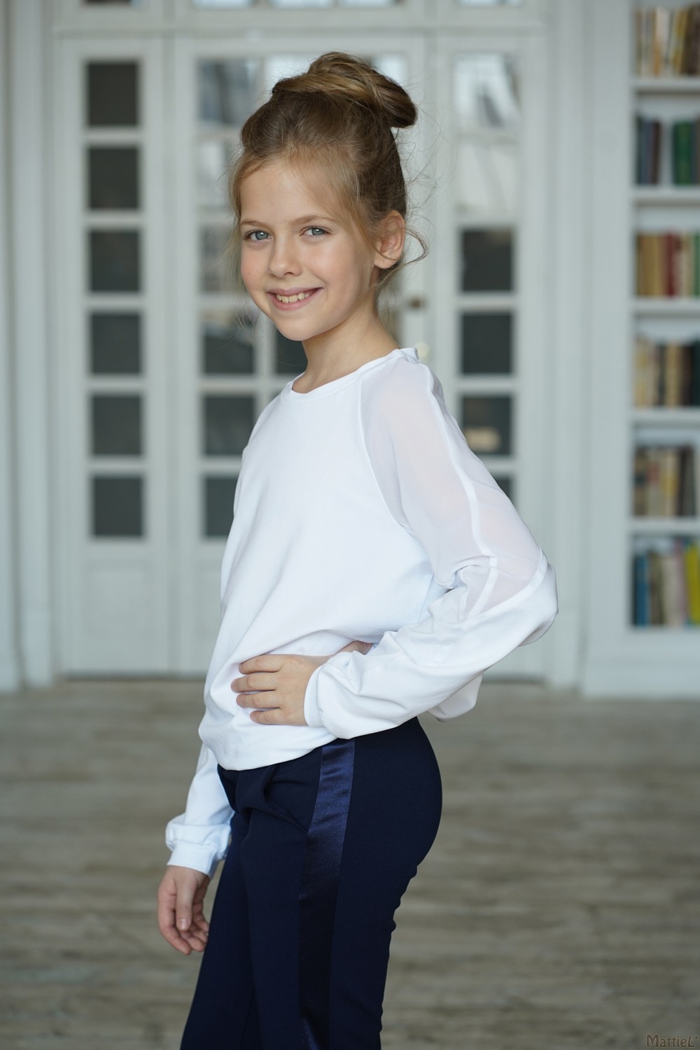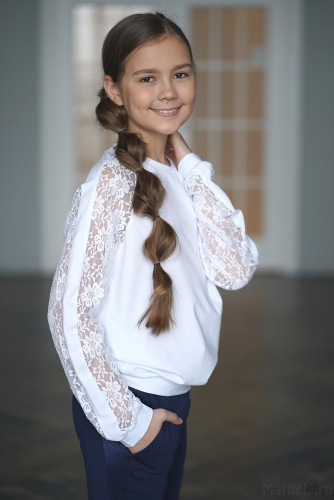 Джемпер для девочек, выполнен из высококачественного трикотажа качества пенье. Джемпер свободный на выпуск, по низу пояс.Покрой рукава реглан. Верхняя часть рукава выполнена из шифона. Джемпер в спортивном стиле особенно элегантен, а также очень удобен для повседневного ношения. 92%хлопок, 8%лайкра