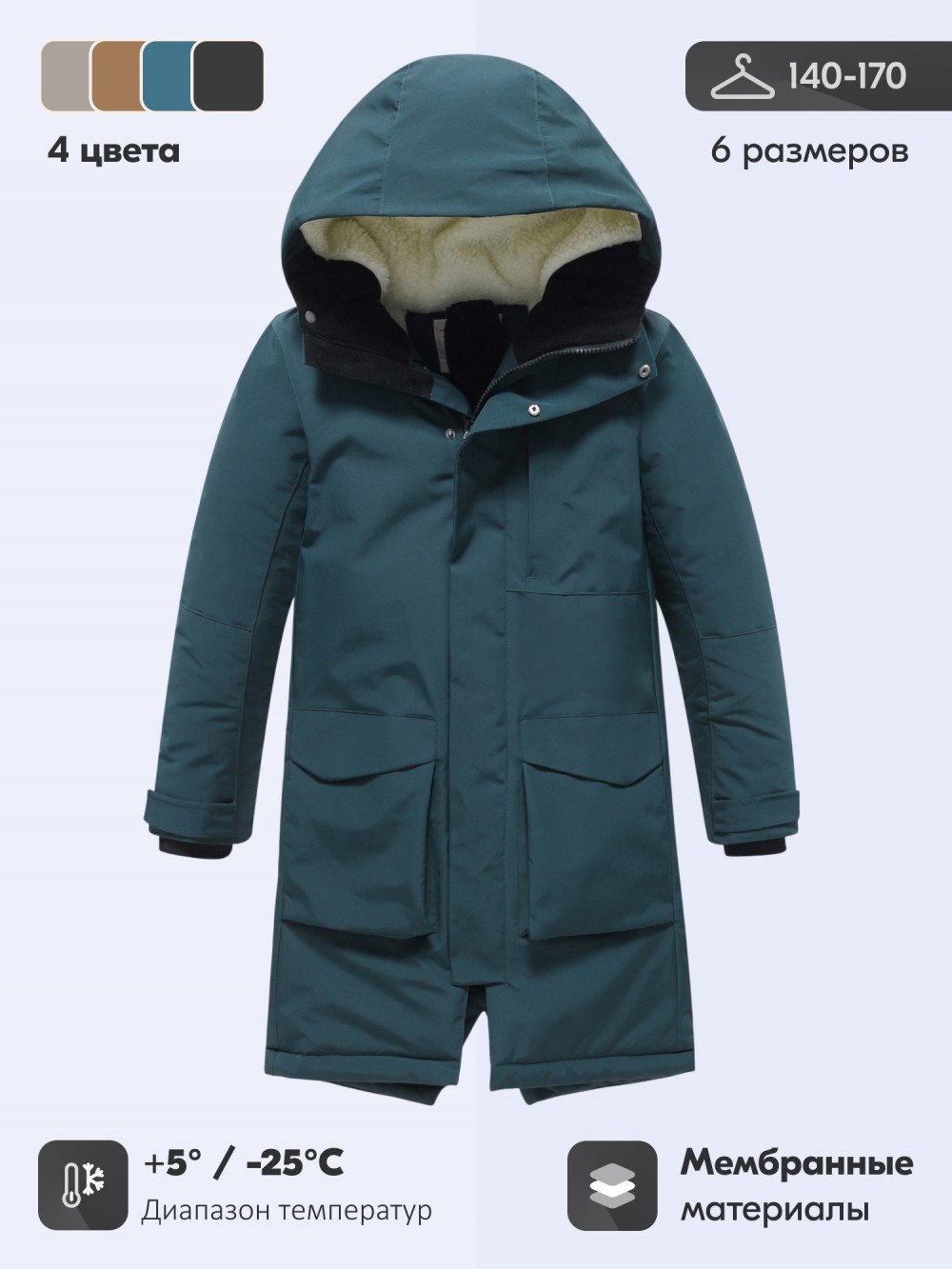 Эта парка представлена в стильных универсальных цветах — коричневом, тёмно-зелёном, чёрном и бежевом. Модель станет отличным выбором для родителей, которые ищут тёплую, удобную и долговечную зимнюю парку для мальчика-подростка, где сочетаются практичность, современный дизайн и комфорт.