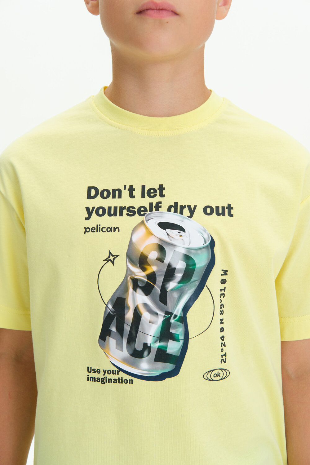 Футболка для мальчика прямого кроя умеренного объема - это идеальный выбор для активного ребенка. Вырез горловины обработан эластичной тканью — она прекрасно держит форму, не растягивается, при этом ребёнку удобно надевать и снимать футболку. Футболка с фотопринтом и надписями. Перевод надписей: Не дай себе засохнуть. Космос(надпись на банке). 21 24 0 N 89 31 0 W - координаты крупнейшего кратера на Змеле(Чикшулуб). Спортивная футболка подходит как для подростков так и для малышей в детский сад. Подходит для любого времени года.