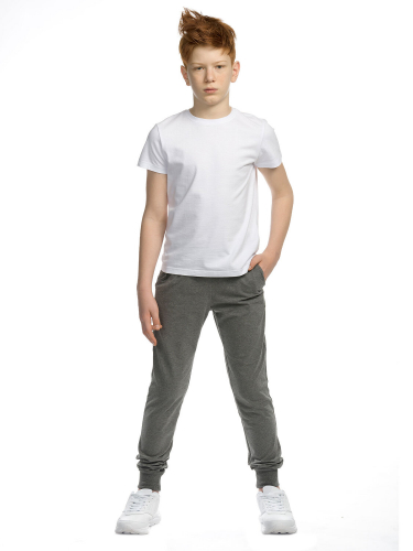Трикотажные спортивные брюки для мальчиков актуального силуэта. Удобные, небольшого объема с наклонными карманами в боковых швах и поясом из основной ткани с регулировкой объема шнурком. Низ и пояс обработаны манжетой из рибаны.
