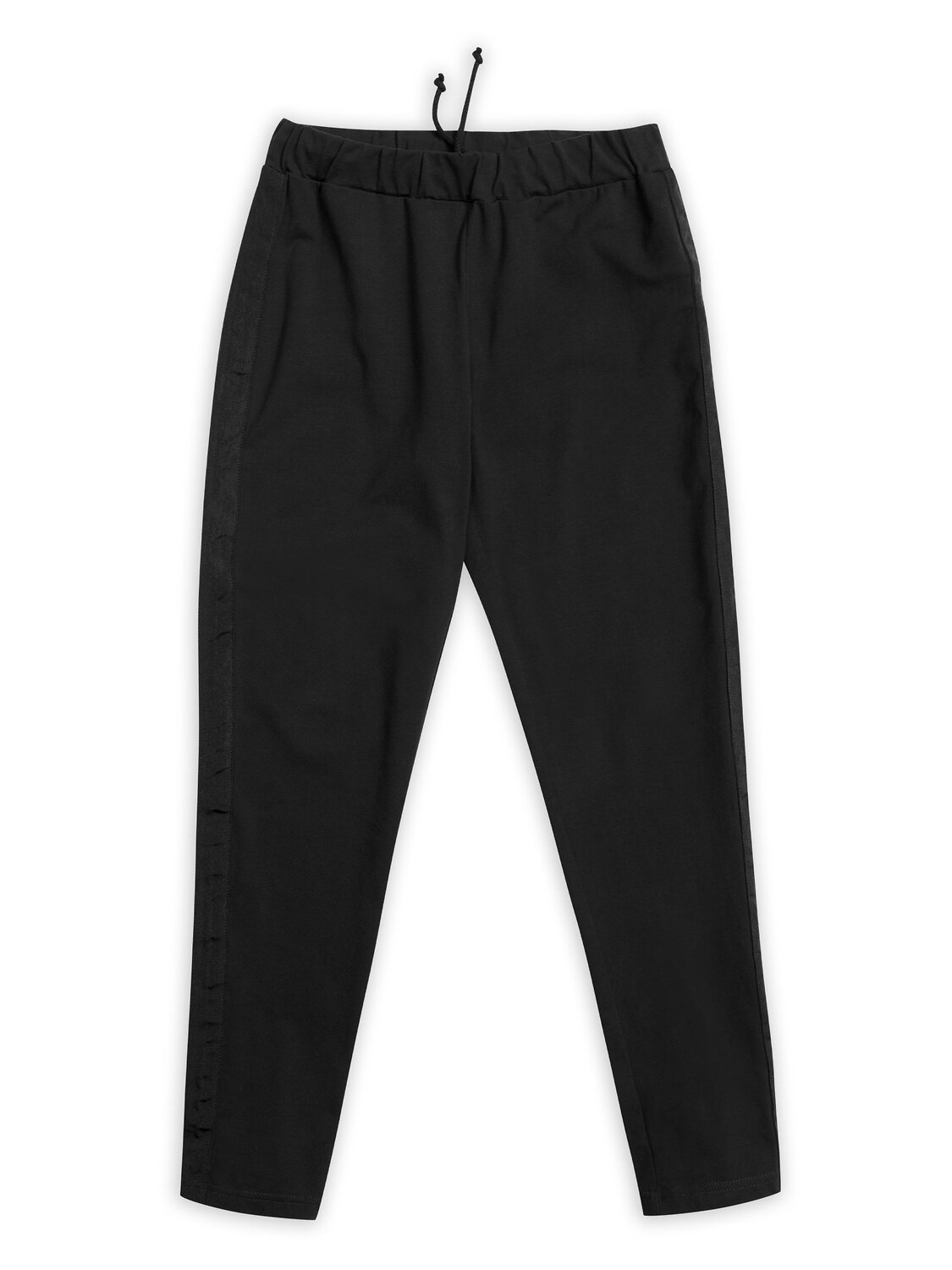 Трикотажные брюки для мальчиков. Небольшого объема, зауженные книзу, с поясом из основной ткани с регулировкой объема шнурком, без манжет. Вдоль боковых швов настрочен лампас из репсовой ленты.