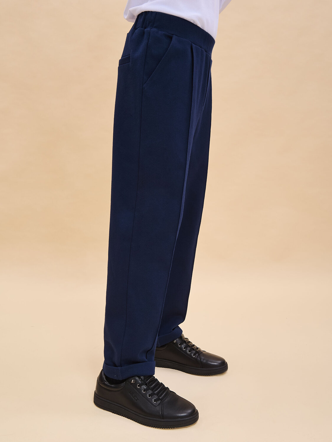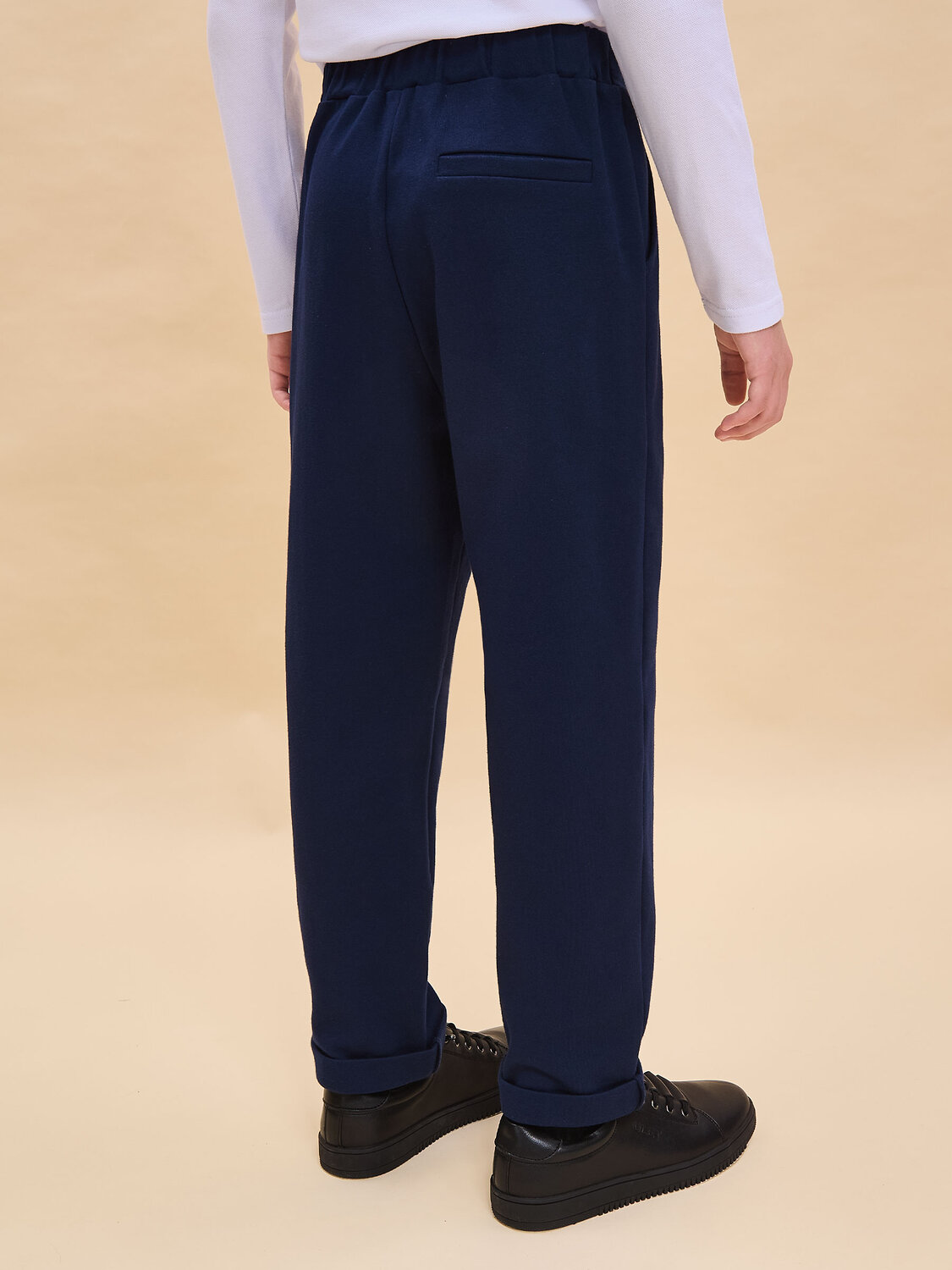 Трикотажные брюки с имитацией швейных из формоустойчивого трикотажа. Брюки с карманами в боковых швах. Гладкий пояс на переде, имитация застежки с гульфиком, имитация кармана с листочкой на спинке. Брюки можно носить с отворотами и без.