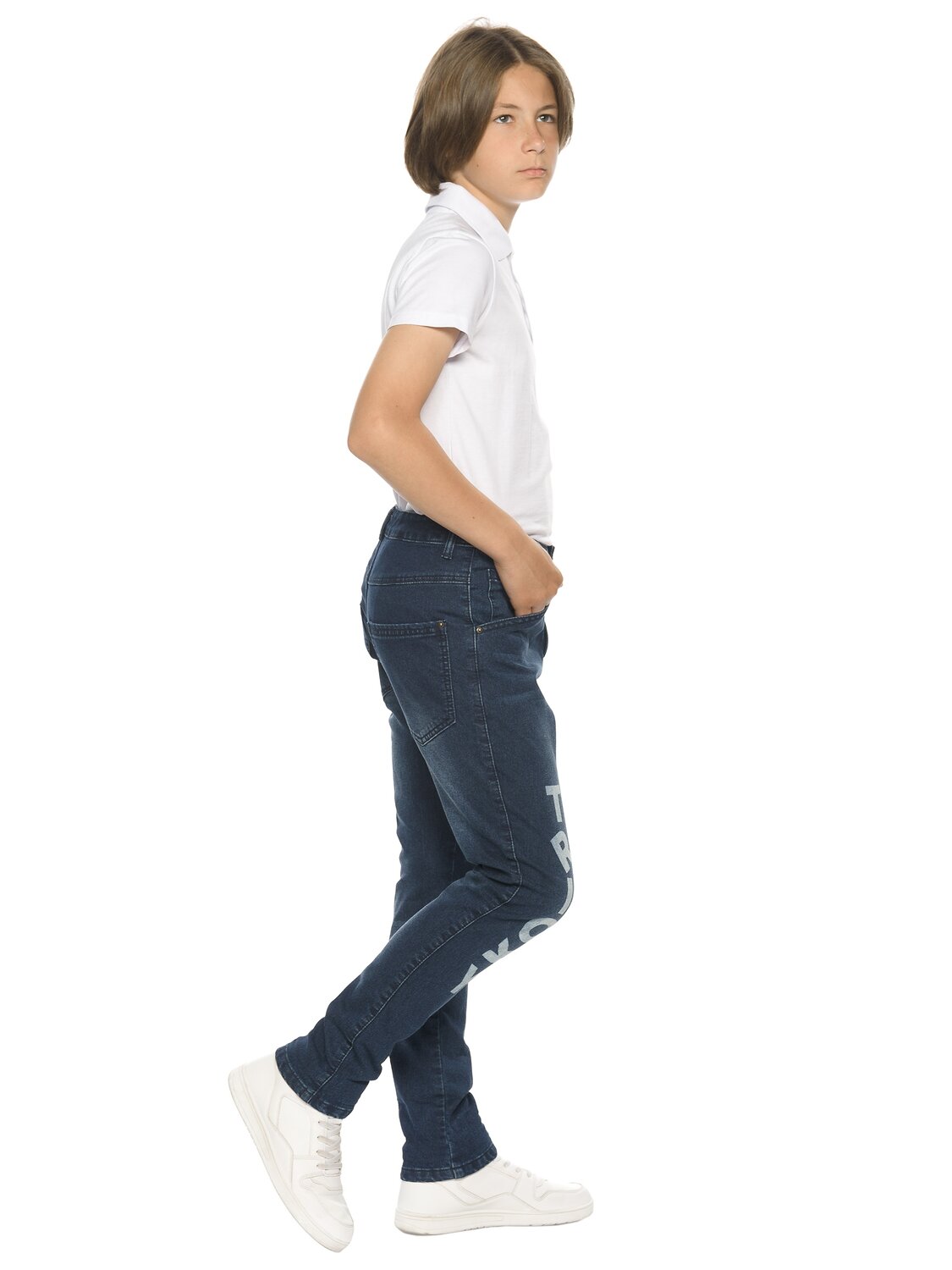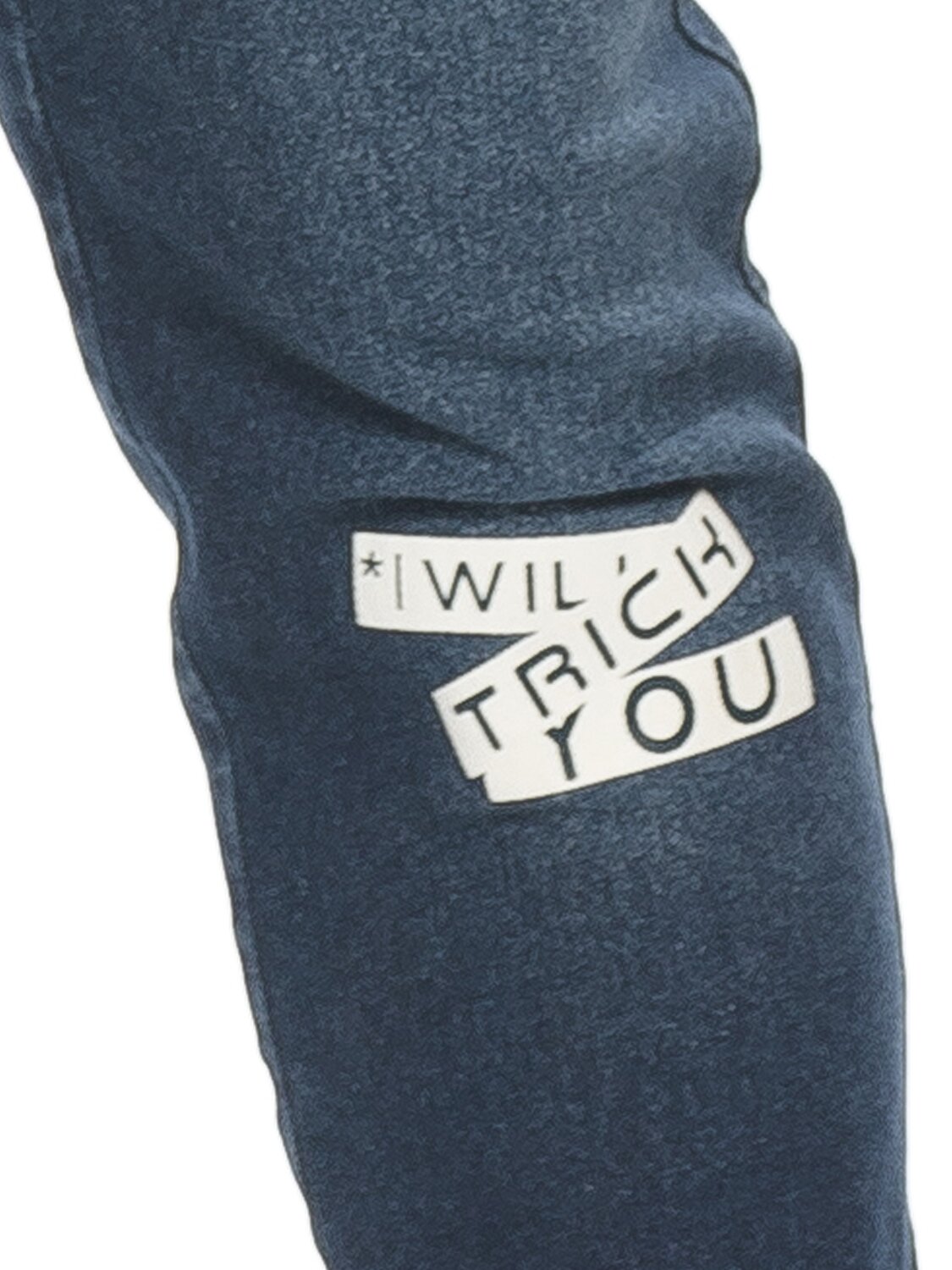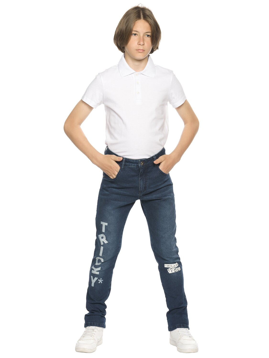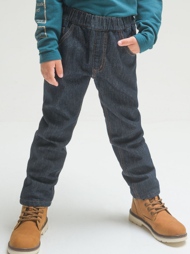 Утепленные джинсы для мальчиков умеренного объёма с 5 ю карманами и металлической фурнитурой. На правой брючине мягкий принт, надпись Хитрый, на левой rubber принт, надпись Я обхитрю тебя. Пояс из рибаны с дополнительной регулировкой внутренним шнуром.