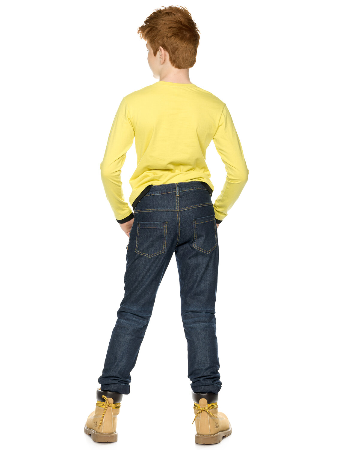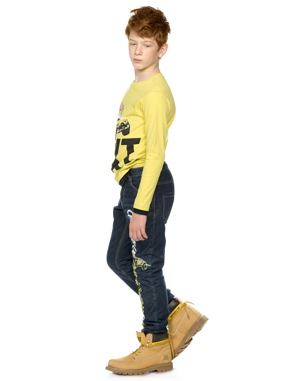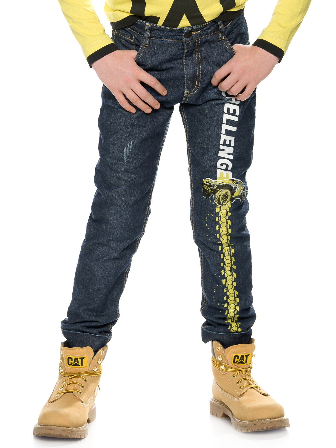 Джинсы для мальчиков на флисе умеренного объёма и отворотами по низу брючин, вертикальный принт Вызов принят.