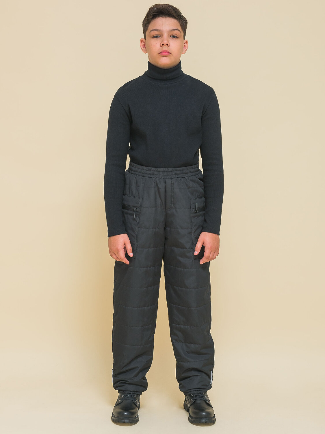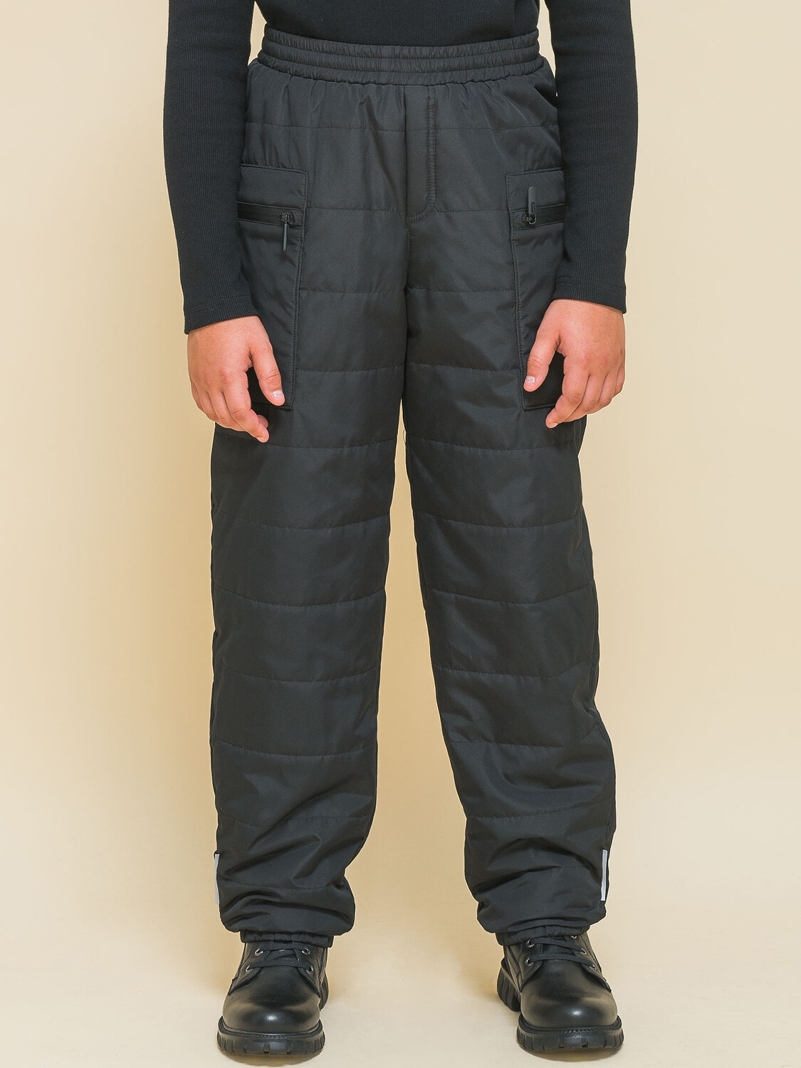 Зимние брюки из курточной ткани для мальчика. Штаны без застёжки. В поясе мягкая широкая резинка — не давит и не перекручивается. Предусмотрен шнурок для регулировки ширины и посадки изделия. По бокам накладные утеплённые карманы на водонепроницаемой молнии — содержимое карманов не намокнет. По бокам молний на карманах ограничители из ткани — для предотвращения разрыва. На штанинах узкие манжеты из основной ткани на комфортной резинке. В боковых швах и по низу брюк светоотражающие элементы — безопасность в тёмное время суток. Изделие декорировано горизонтальной стёжкой. За штанами легко ухаживать. Модель выполнена из полиэстера — брюки тёплые, не промокают, легко стираются, быстро сохнут, сохраняют отличную форму и цвет надолго. Внутри уютная трикотажная плюшевая подкладка из с небольшим ворсом. Модель выполнена в универсальном чёрном цвете. Её легко сочетать с различными куртками. В линейке представлены следующие размеры: 7 (122): 8 (128): 9 (134): 10 (140): 11 (146). Зимние брюки подходят для мальчиков младшего школьного возраста, а также подростков. Рекомендуемый температурный режим: не ниже минус 25 градусов. Утеплитель: синтепон 60 г/м2. Модель идеальна для носки в школу, для прогулок и активного отдыха, спорта. Утеплённые штаны — стильный и практичный подарок для сына или внука на любой праздник.