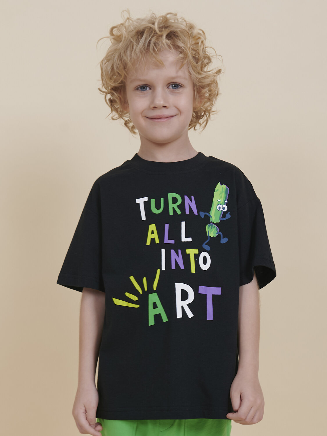 Футболка для мальчика оверсайз – модель большого объема на каждый день, для дома и прогулок. Легкая трикотажная футболка подходит в качестве нательного белья и многослойных образов. Базовая футболка на любой сезон. Изделие сшито из 100% натурального хлопка, мягкий материал приятно прилегает к телу, не вызывая дискомфортных ощущений во время движений. Хлопок хорошо пропускает воздух, обеспечивает гигроскопичность. Материал не задерживает влагу - ребенок не потеет. Футболка с оптимальным размером горловины удобна в носке - позволит ребенку с легкостью надевать и снимать ее самостоятельно, прослужит долго и будет радовать износостойкостью. Модель представлена в черном цвете. Черная футболка для мальчика - оптимальный вариант на любой выход. Футболка для мальчика с принтом украшена надписью "Turn all into art" – перевод "Превратим всё в искусство". Изделие привлекает интересным дизайном. Свободная футболка для мальчика подростковая рассчитана на возраст садика и школы. Размерная линейка: 1 (86): 2 (92): 3 (98): 4 (104): 5 (110): 6 (116): 7 (122): 8 (128): 9 (134): 10 (140): 11 (146). Крутая футболка для мальчика – отличный подарок для сына, внука, братика, племянника, крестника! Выбирайте нужный размер по таблице размеров на фото. Цвет товара на экране вашего устройства может отличаться от цвета изделия вживую.