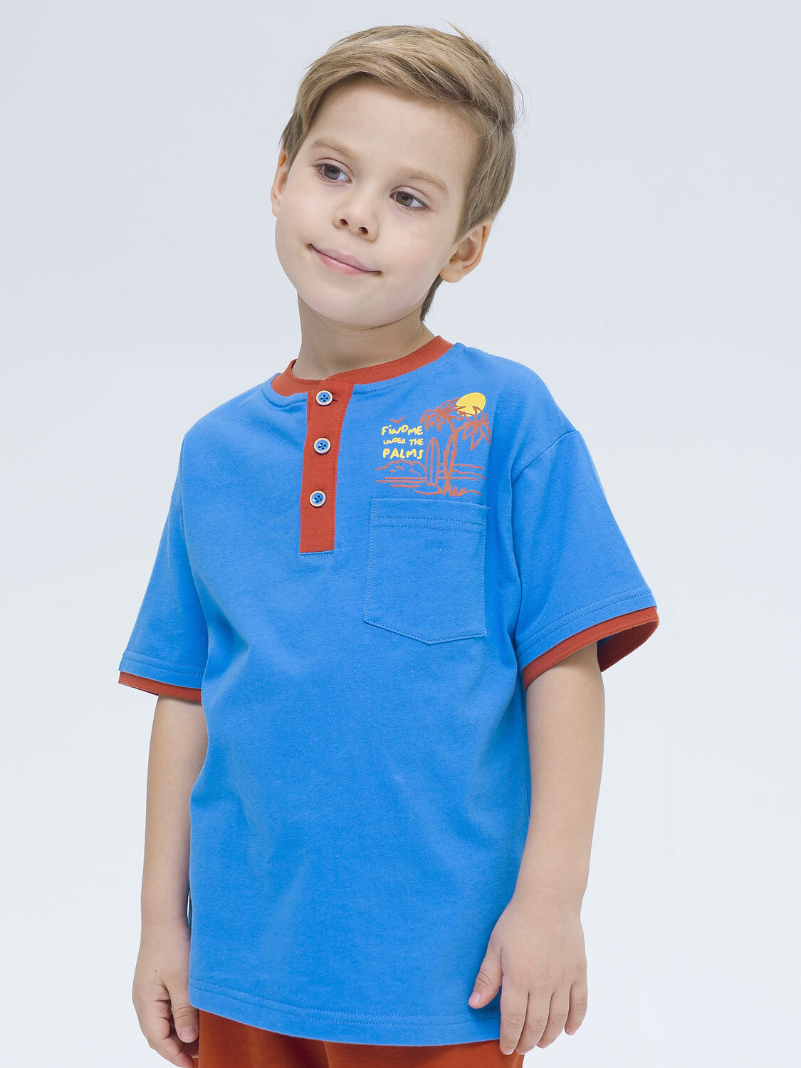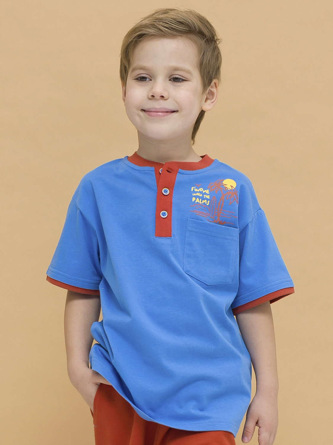 Футболка-хенли для мальчиков. 100% хлопок в составе – ткань мягкая, дышащая, приятная на ощупь. Свободный прямой силуэт, воротничок из рибаны – не давит, эластичный. Планка у горловины на пуговицах. Контрастная отделка горловины и рукавов дает имитацию двухслойности – оригинальная фишка модели. Накладной карман и яркий принт спереди для позитивного настроения. Подходит на каждый день, для активного образа жизни, идеальна для пляжного сезона.
