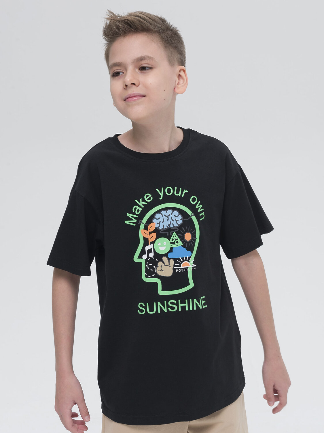 Футболка актуального оверсайз-силуэта для мальчика. Ткань из 100% хлопка мягкая, приятная на ощупь и комфортная для кожи ребёнка. Изделие с классическим округлым вырезом горловины и спущенным плечом украшает позитивный жизнеутверждающий принт, который устойчив к частым стиркам. Оверсайз-силуэт не стесняет движений ребёнка, позволяет носить футболку долго. Она будет словно "расти" вместе с ребёнком. Такая модель идеально подходит как для летнего отдыха, так и для занятий спортом.