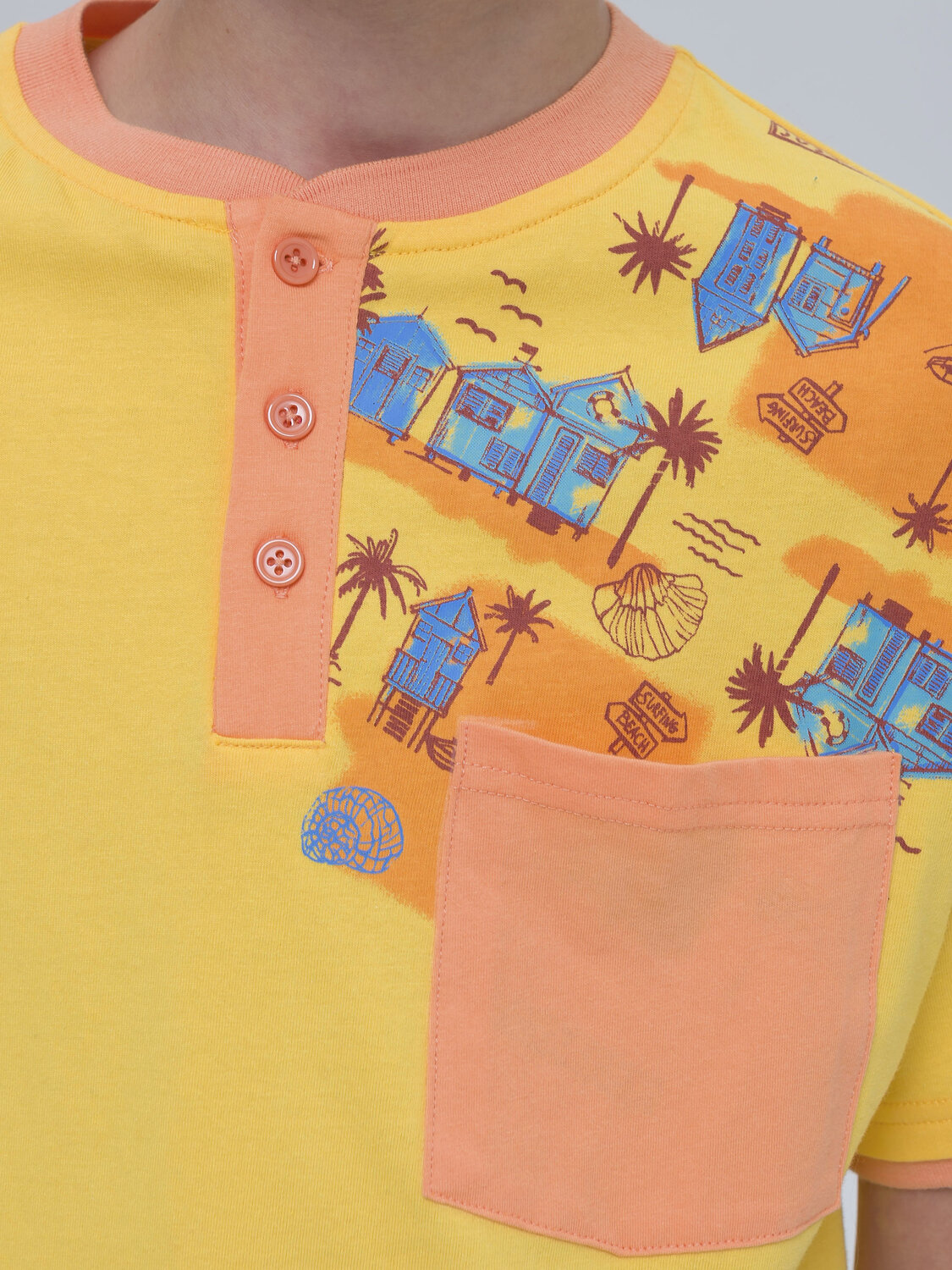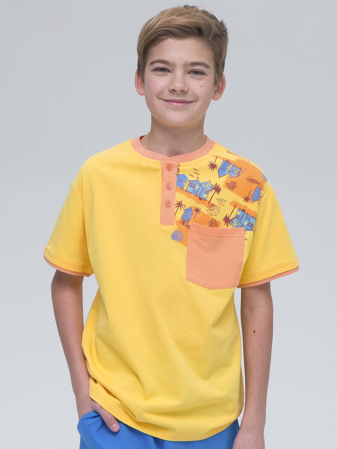 Модная футболка-хенли из 100% хлопка для мальчика. Ткань приятна на ощупь, дышит и обеспечивает ребёнку комфорт. Модель с умеренно свободной посадкой дополнена пуговицами у горловины – её удобно надевать и снимать. На груди небольшой накладной карман. Рукава и горловину украшает контрастная отделка — имитация двухслойности и один из актуальных летних трендов. Футболка декорирована милым летним принтом. Яркий жёлтый цвет выделит вашего ребёнка из толпы. Вы не потеряете его в местах большого скопления людей (в аэропорту или на пляже). Эта модель сделает образ мальчика по-настоящему стильным!