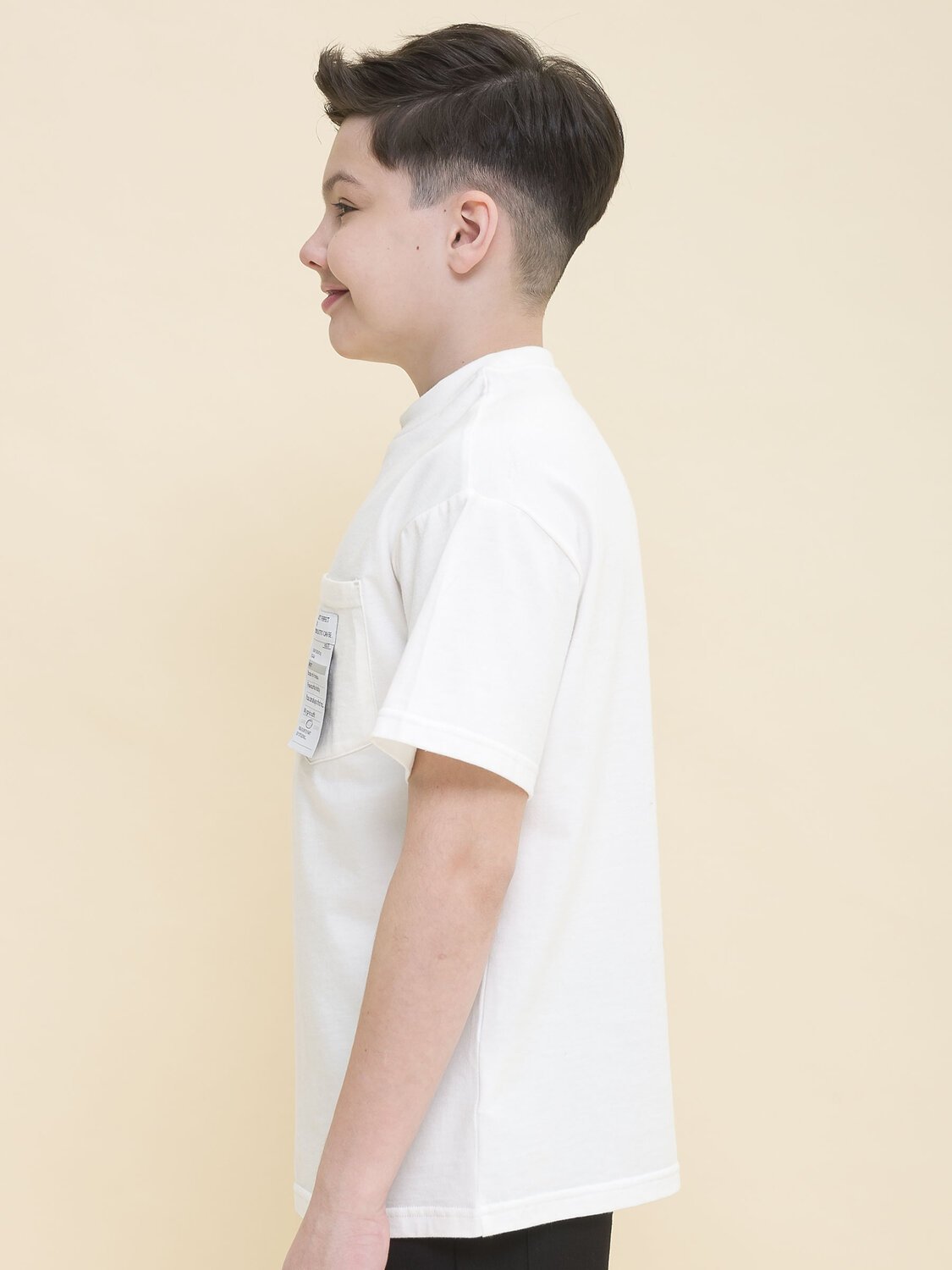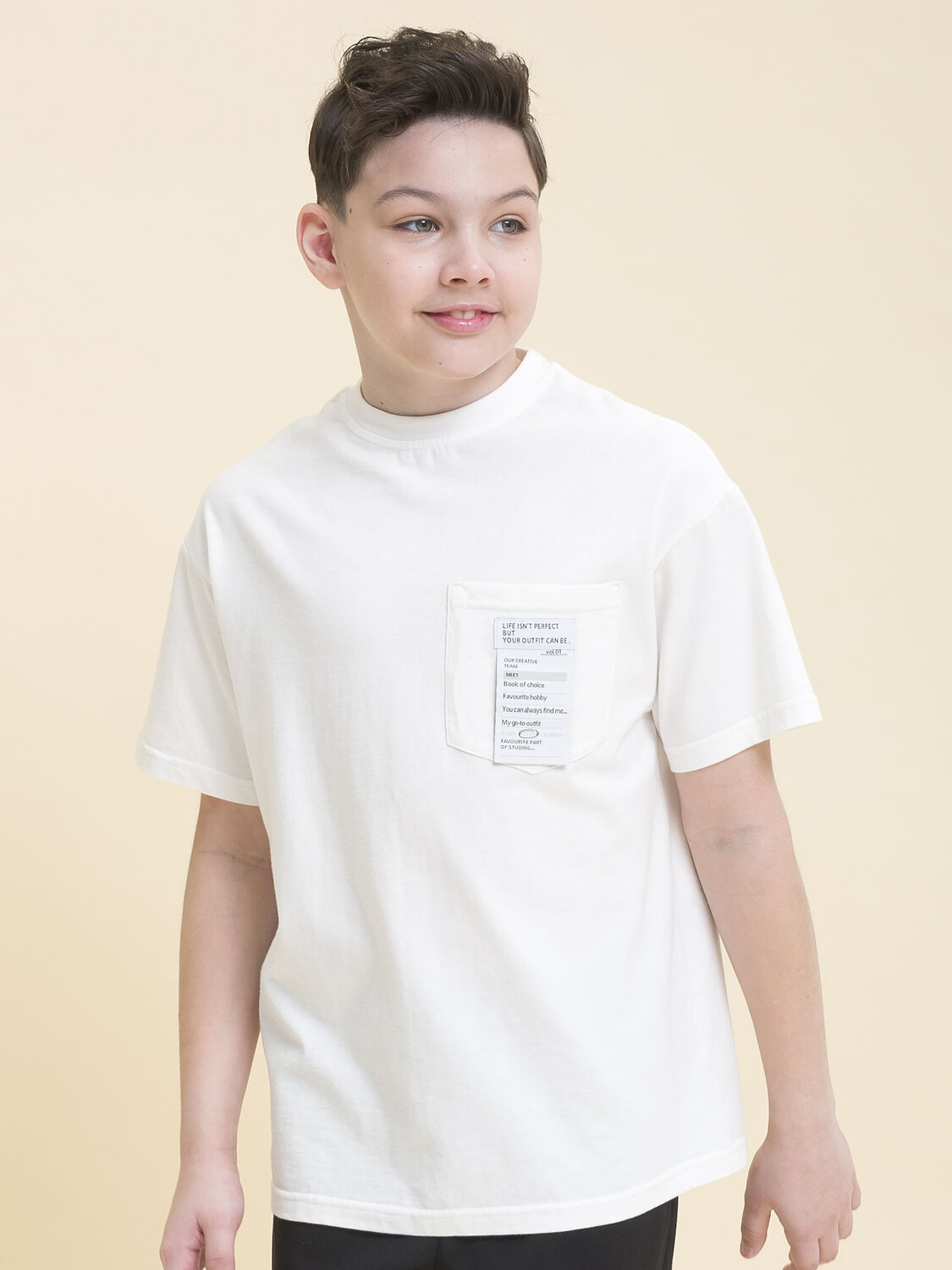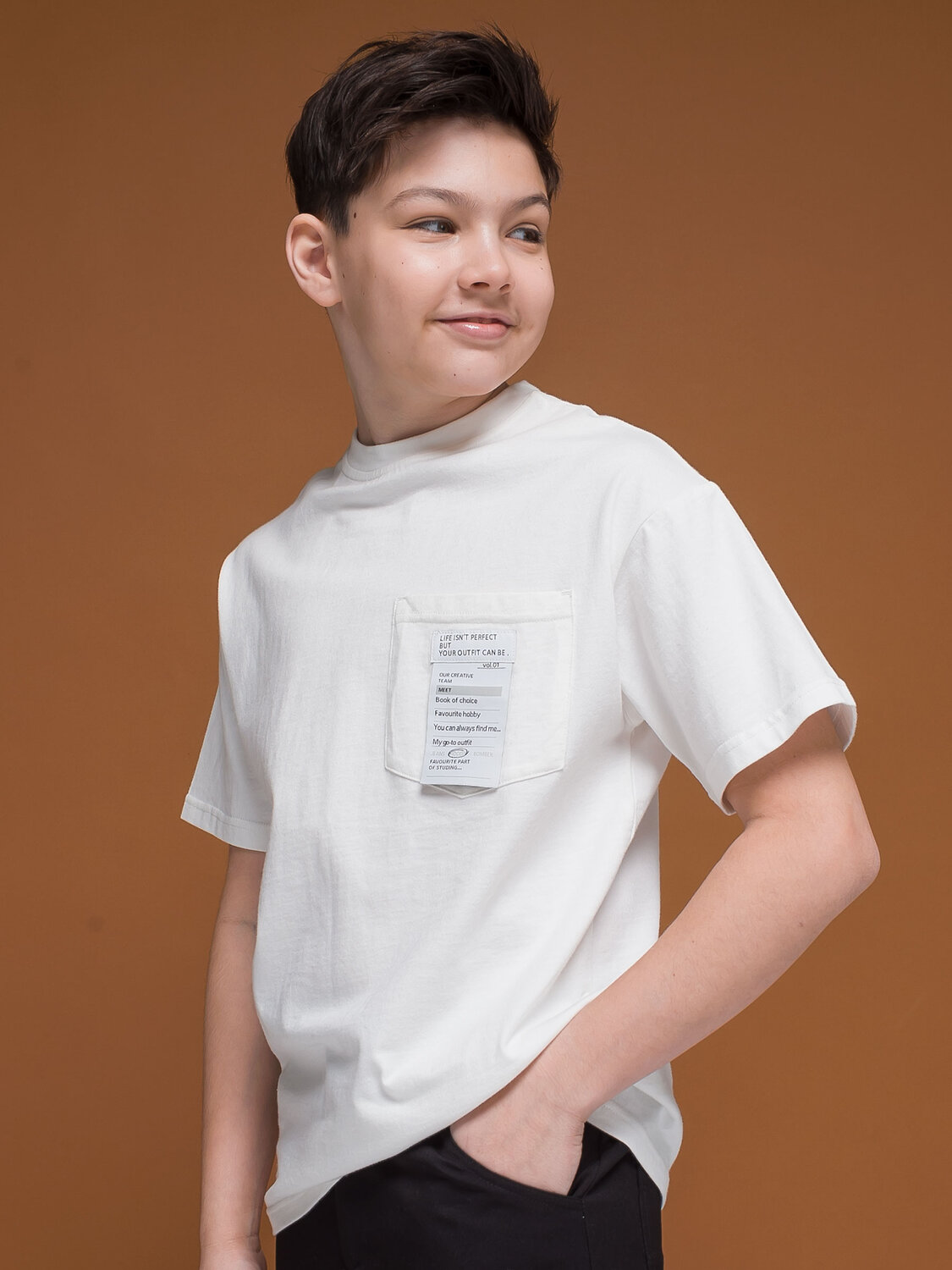 Футболка умеренного объема для мальчика. Модель выполнена из 100% хлопка – ткань дышит, приятна на ощупь и очень комфортна. Футболка лаконичного дизайна дополнена накладным карманом на груди. Изюминка изделия — декоративный тканевый лейбл-нашивка на кармане, на нём забавная анкета с позитивным настроением. Благодаря свободному силуэту джемпер подходит мальчикам с разными типами фигуры. Отличный вариант одежды для школы.