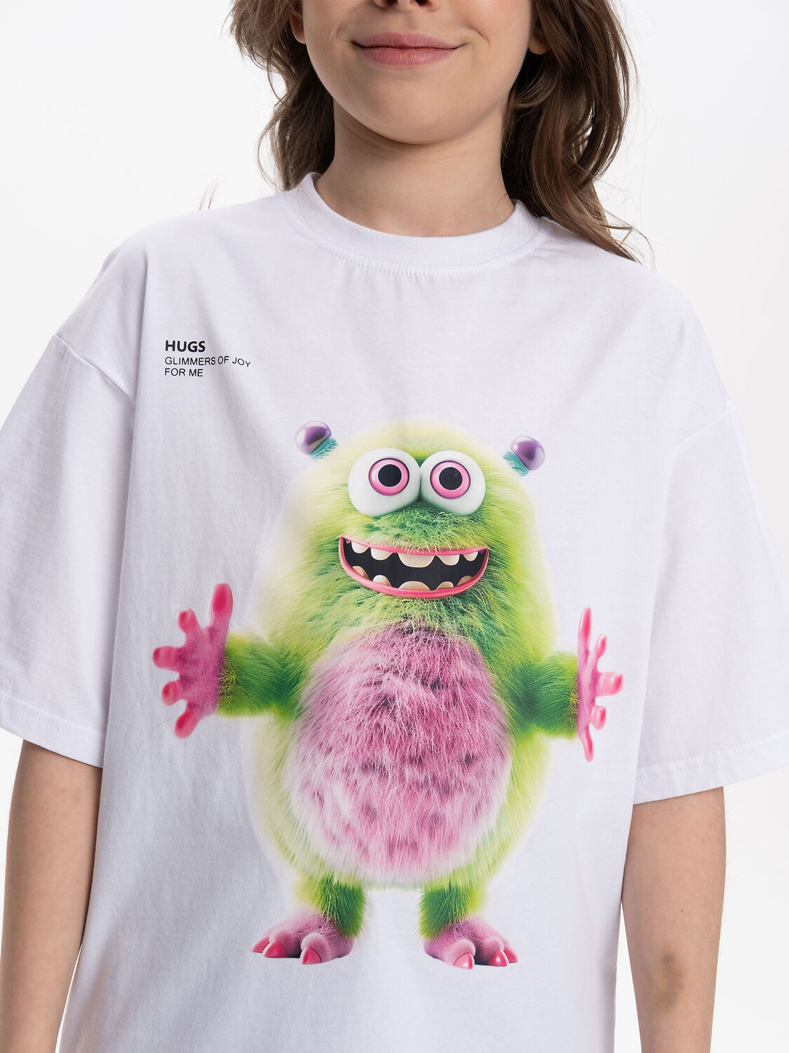 Детская футболка унисекс среднего объема. Прикольная нарядная футболка свободного силуэта со спущенным плечом не будет стеснять движений ребёнка. Вырез горловины отделан эластичной рибаной - голова не застрянет. Главная фишка футболки — яркий милый принт, изображающий персонажа, сгенерированного нейросетью (искусственным интеллектом). Это супермодный тренд! Принт эластичный и стойкий — без проблем переносит многочисленные стирки, не теряя своей яркости. На принте изображён забавный пушистый чудик (монстрик) зеленого и сиреневого цветов + надписи "обнимашки", "искры радости для меня" и "создано с помощью искусственного интеллекта". Широкая размерная сетка позволяет приобрести такую футболку как малышу в детский садик так и подростку. . Белые футболки подходят для носки летом, осенью и весной (демисезон), а также зимой . Цвет товара на экране вашего устройства может отличаться от цвета изделия вживую.