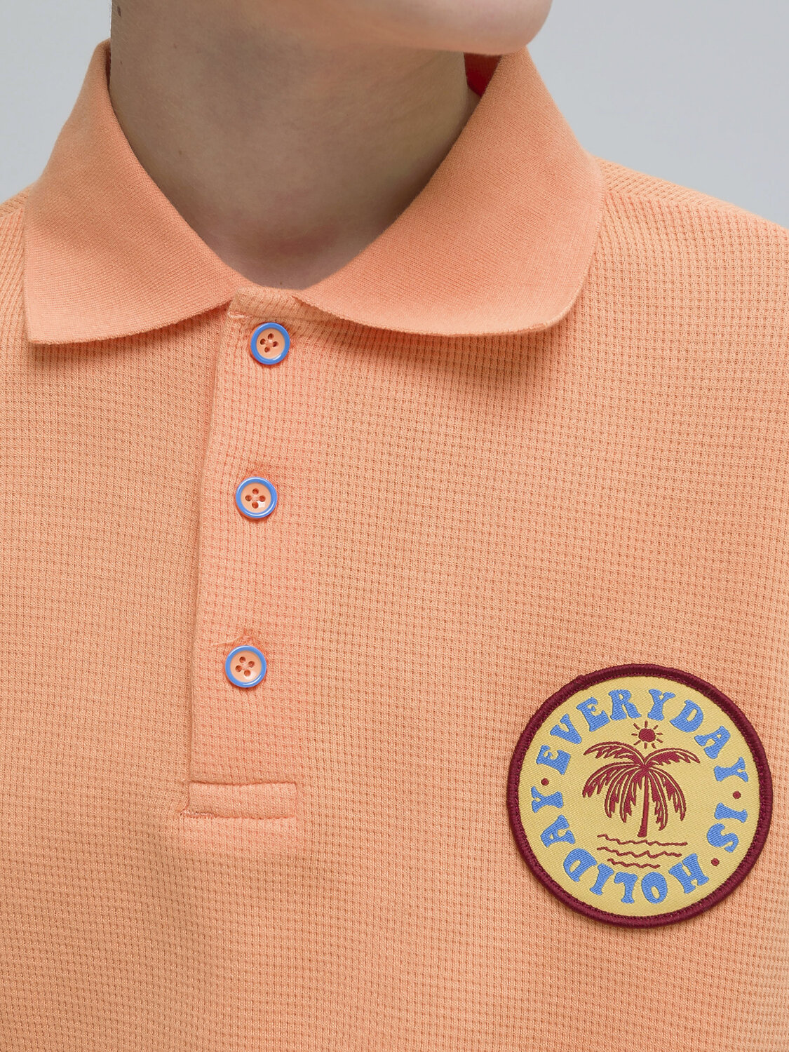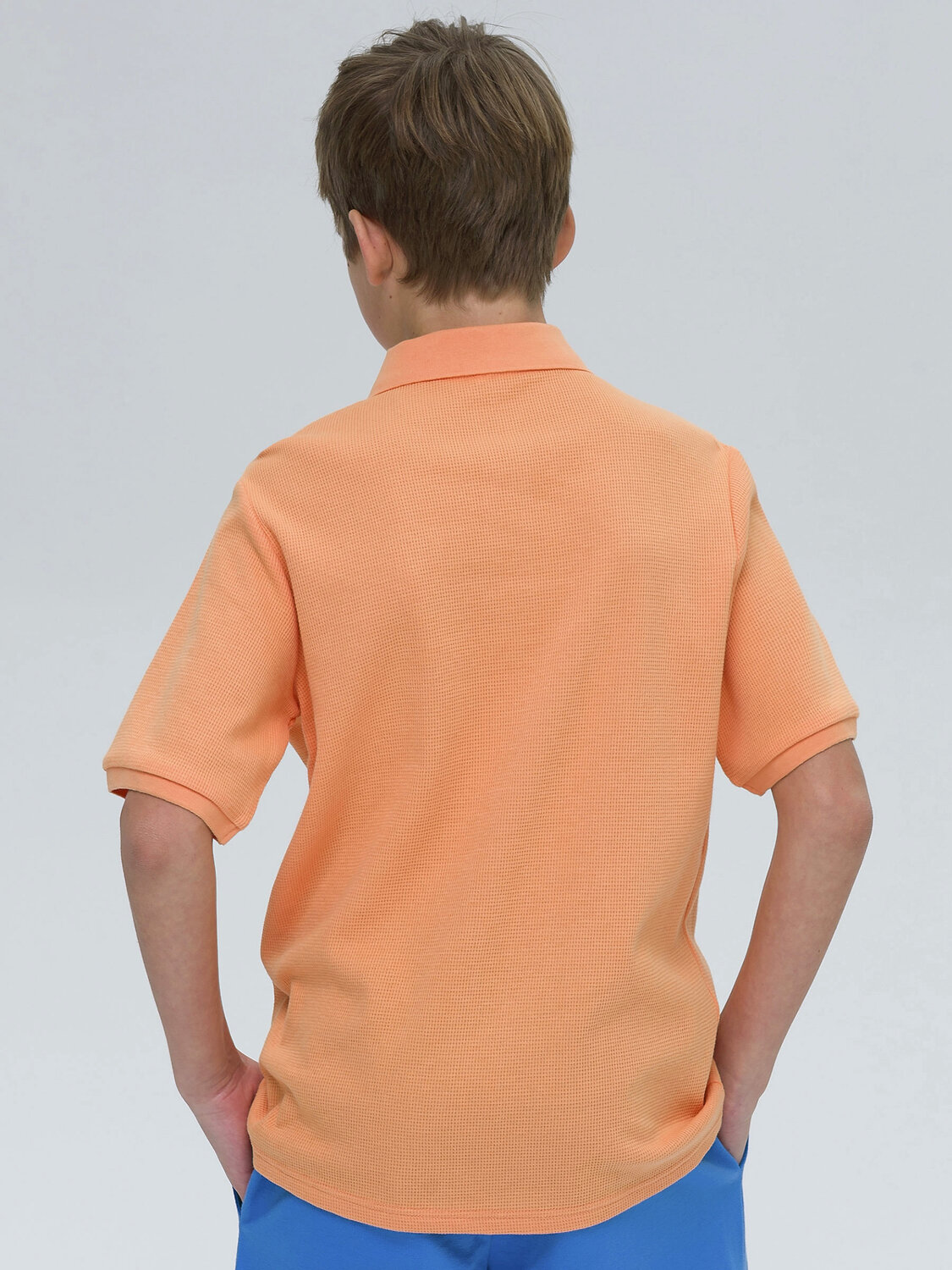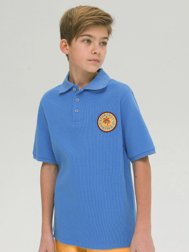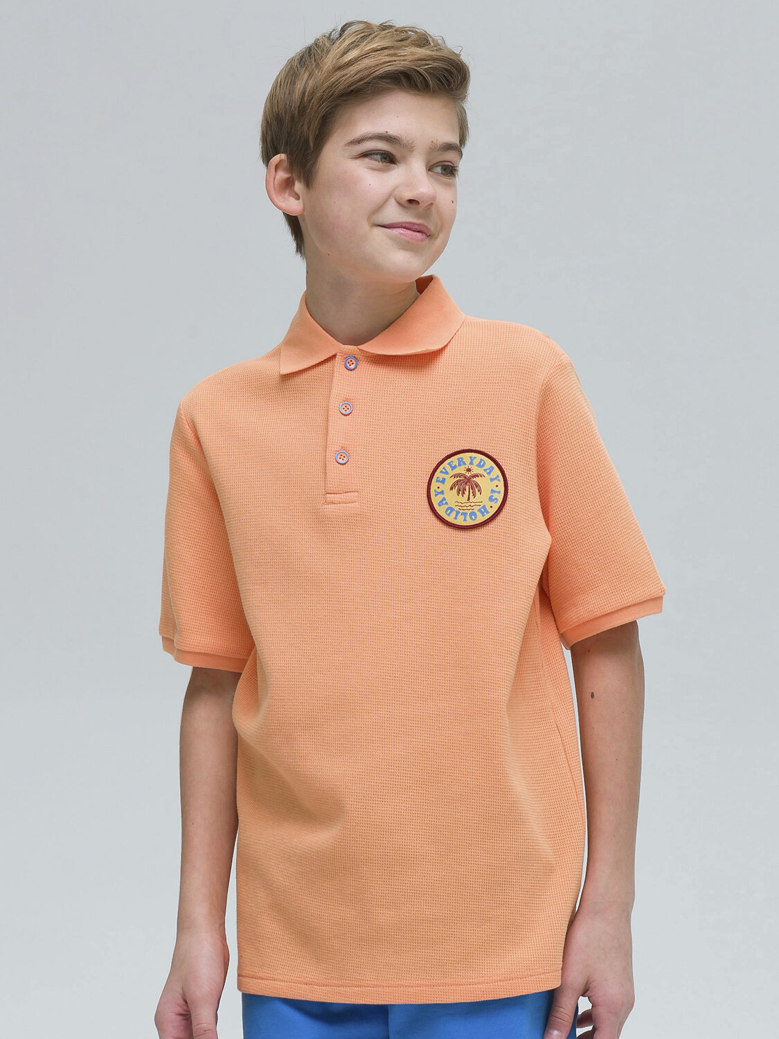Футболка-поло из 100% хлопка для мальчика. Модель выполнена из трикотажного полотна актуальной "вафельной" фактуры. Такая ткань неприхотлива в уходе, а также она мягкая и очень приятная на ощупь. Благодаря этому ваш ребёнок будет чувствовать себя комфортно. У горловины планка с пуговицами — изделие удобно надевать и снимать. Поло среднего объёма можно сочетать как с шортами, так и с брюками. С такой футболкой легко создать стильный образ для мальчика. Изюминка модели — жаккардовая нашивка с принтом.
