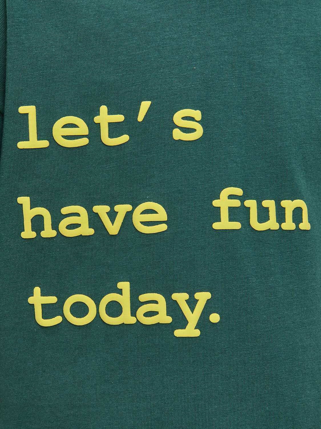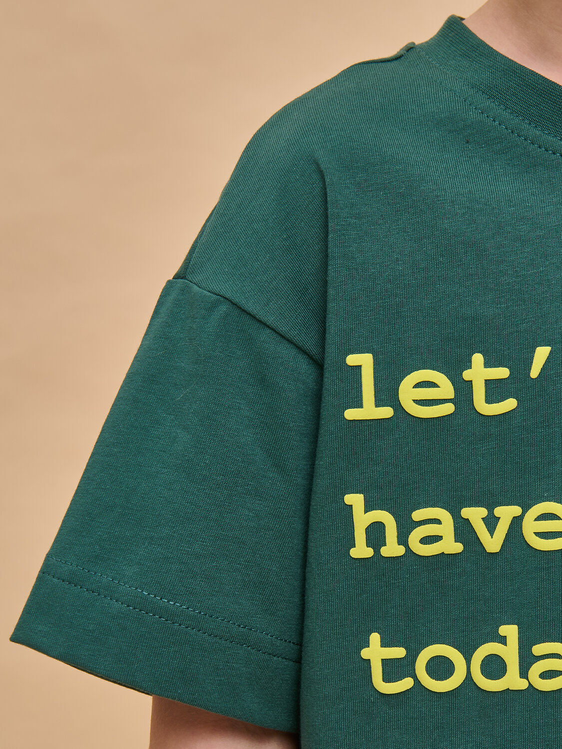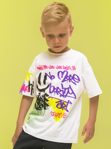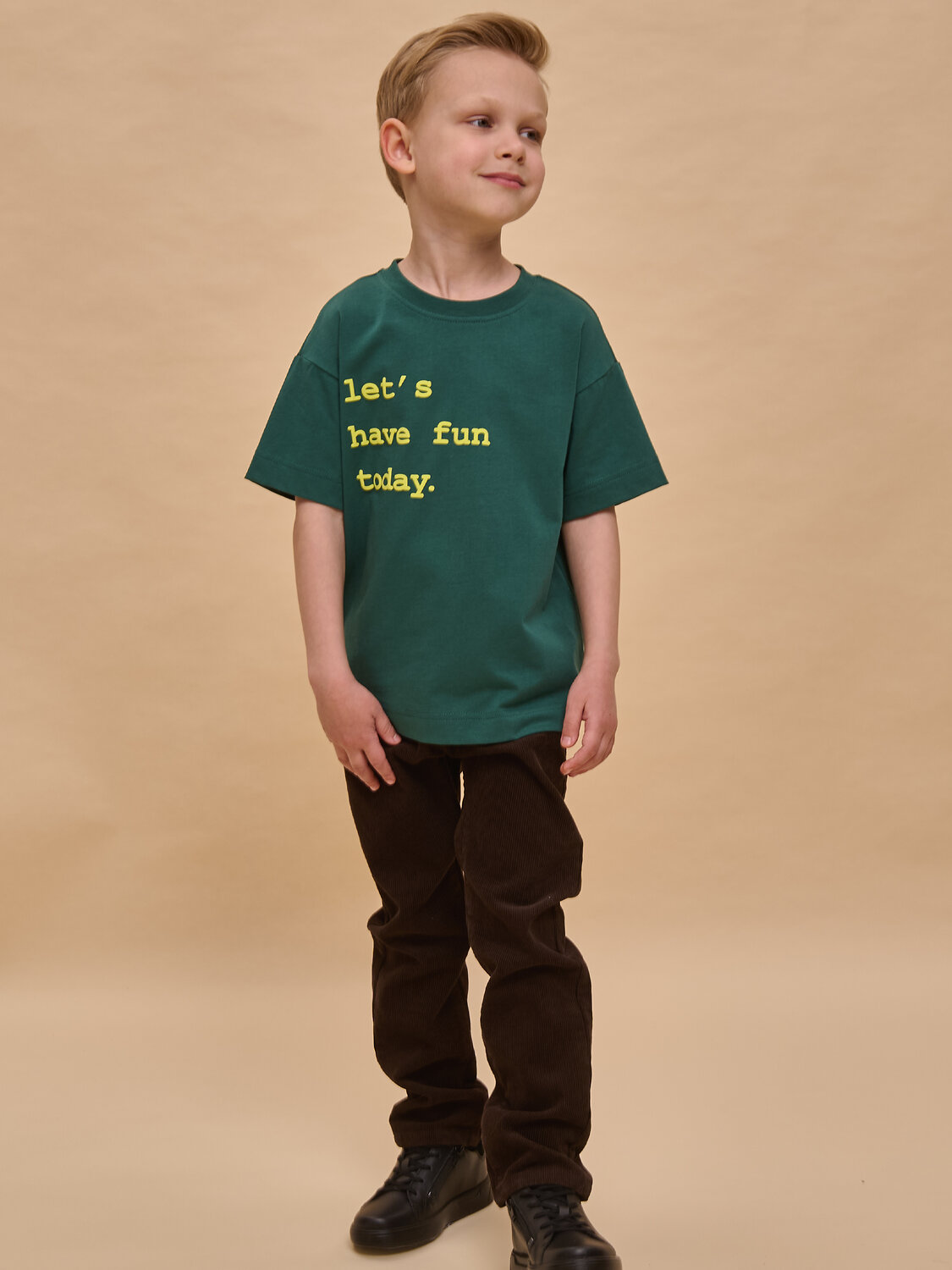 Детская футболка для мальчика. Комфортная майка свободного объёма со спущенным плечом не будет стеснять движений ребёнка. Вырез горловины обработан эластичной рибаной (ткань в рубчик) — она прекрасно держит форму, не растягивается, при этом ребёнку удобно надевать и снимать футболку. Изделие неприхотливо в уходе. Футболка детская с принтом в актуальном университетском стиле по переду. Надпись переводится: «давайте веселиться сегодня». Принт эластичный и прочный, не боится частых стирок. В составе ткани 100% хлопка — майка мягкая, дышащая, приятная на ощупь. Футболка для мальчиков выполнена в универсальном цвете, её легко комбинировать с различными брюками, шортами. Детские футболки с принтом подходят как для маленьких мальчиков, так и для подростков. Оверсайз-футболка для мальчика подходит для любого времени года, её можно носить как летом, так и в холодное время года в качестве среднего слоя одежды. Помните о правильном уходе за изделием: рекомендуется стирать при температуре не выше 30 °C, без предварительного замачивания, с изнанки. Это поможет сохранить качество и цвет футболки на длительное время. Не забывайте о выборе правильного размера. Используйте таблицу размеров на фотографии, чтобы выбрать подходящий вариант для вашего мальчика. Обратите внимание, что цвет товара на экране вашего устройства может отличаться от реального.