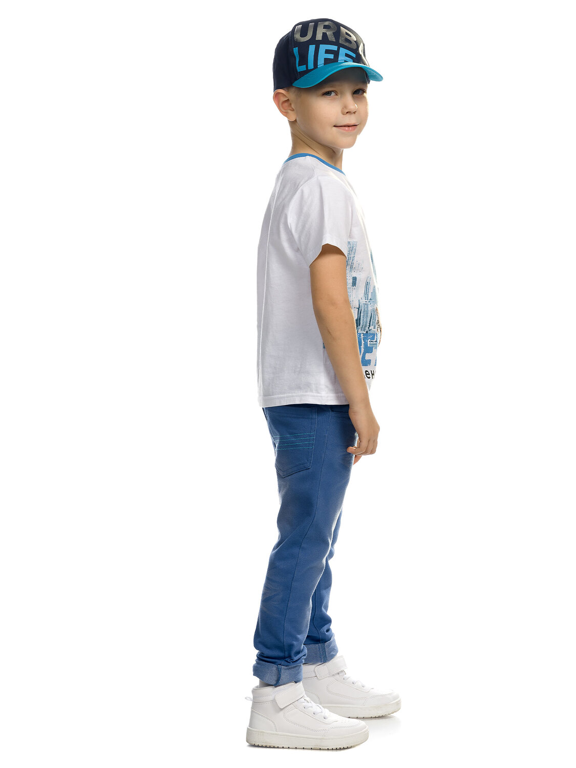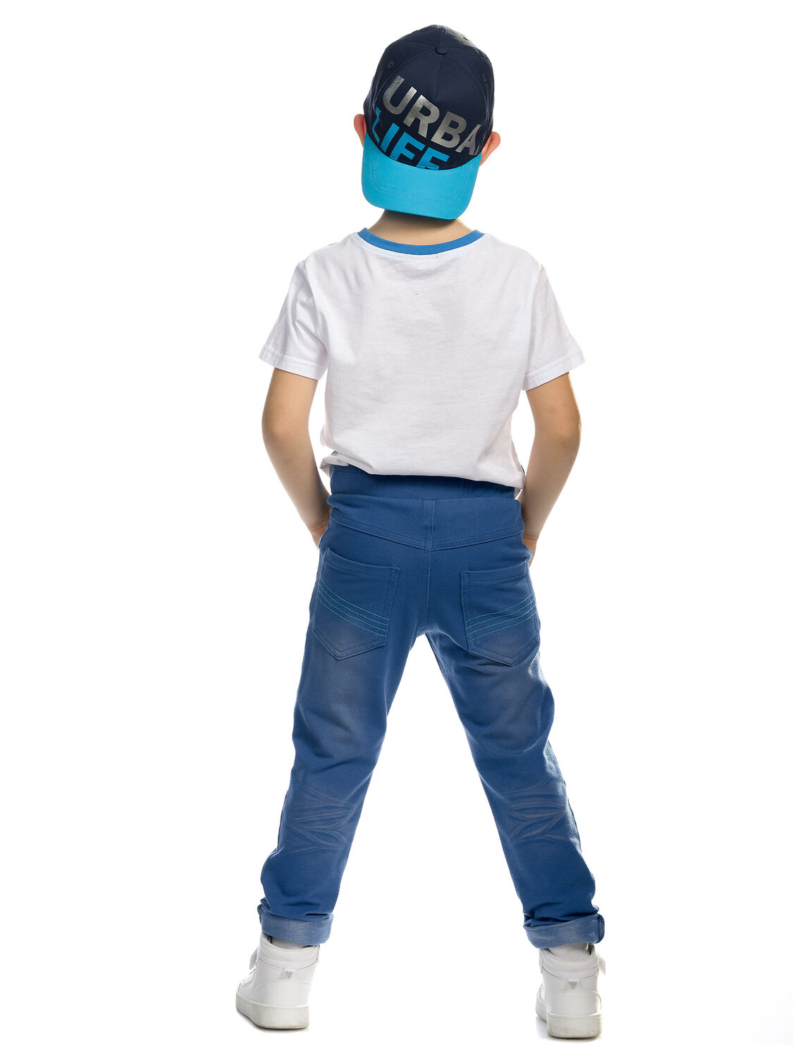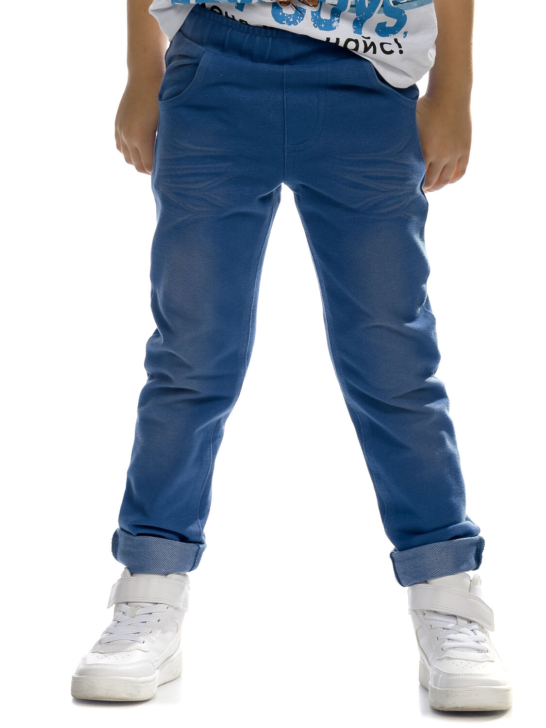 Брюки для мальчиков. Брюки из футера, имитация джинсы - полукруглые боковые карманы спереди, кокетка и накладные карманы на спинке, отвороты по низу брюк. Регулировка объема по поясу внутренним шнурком.