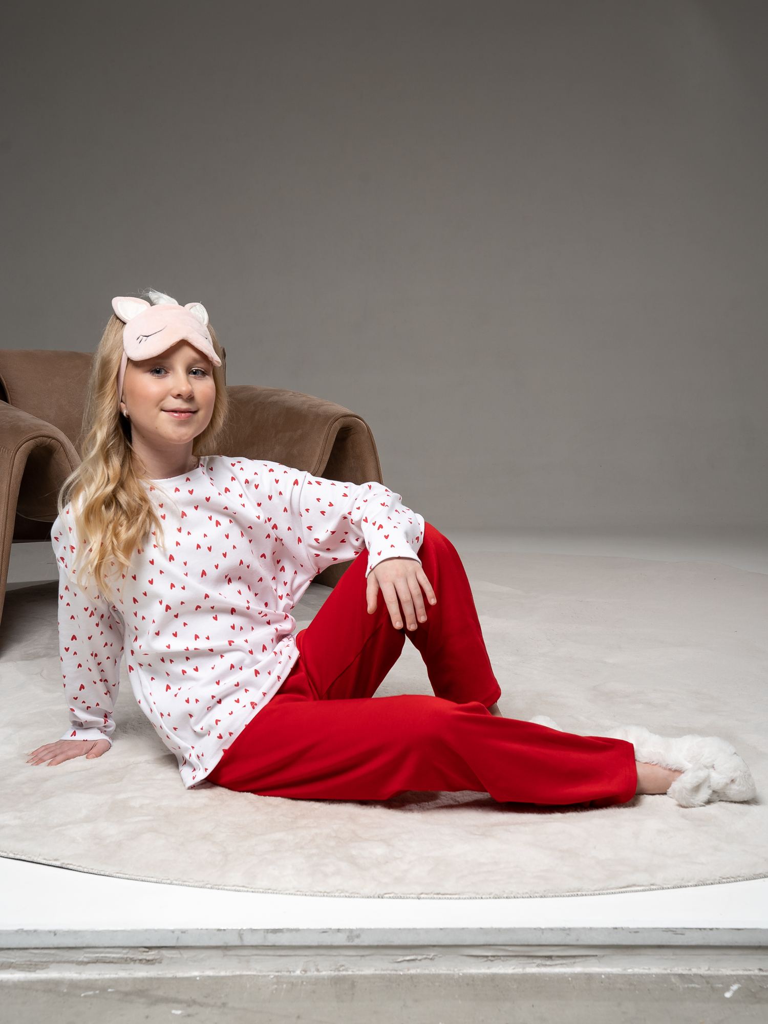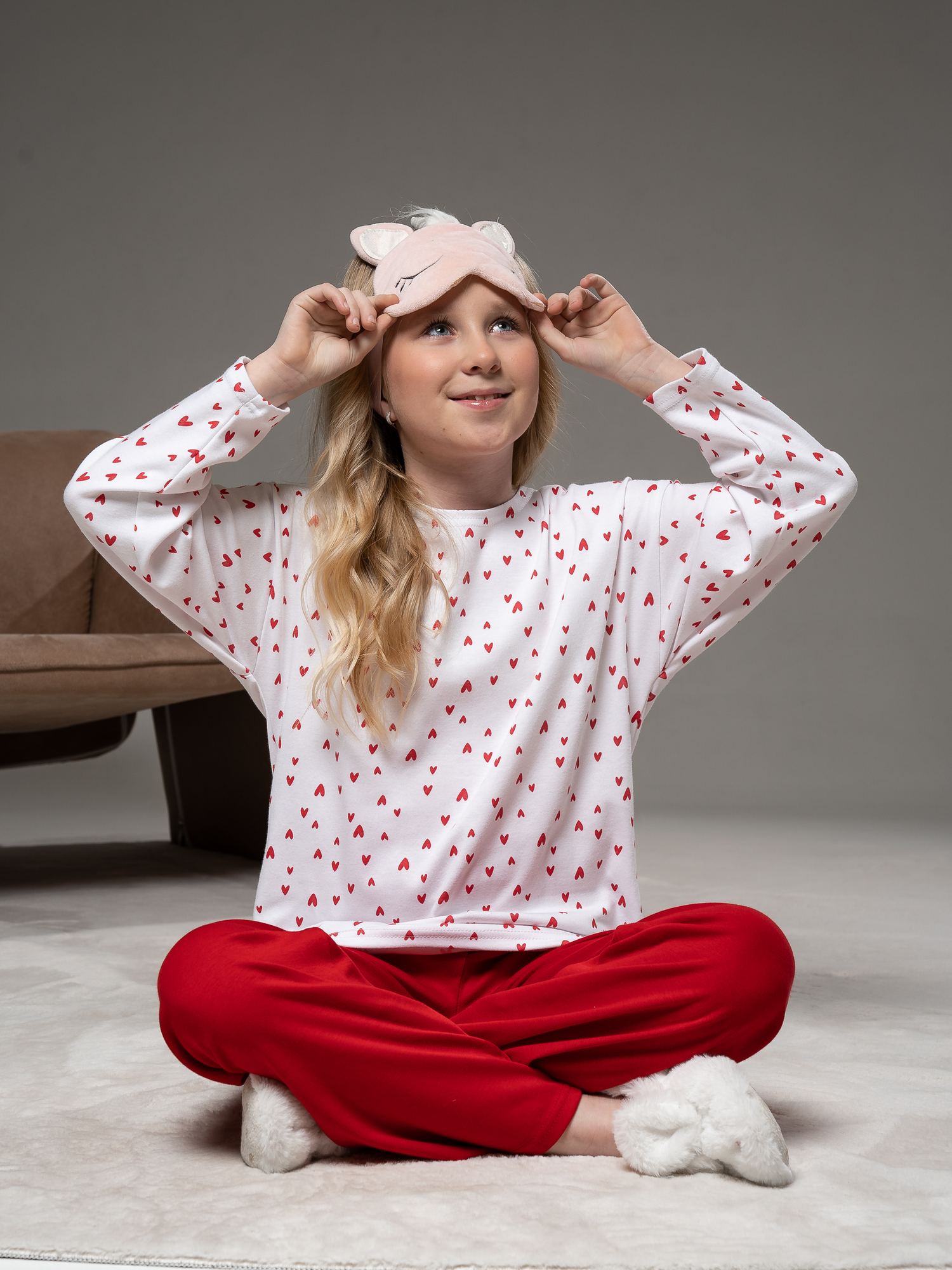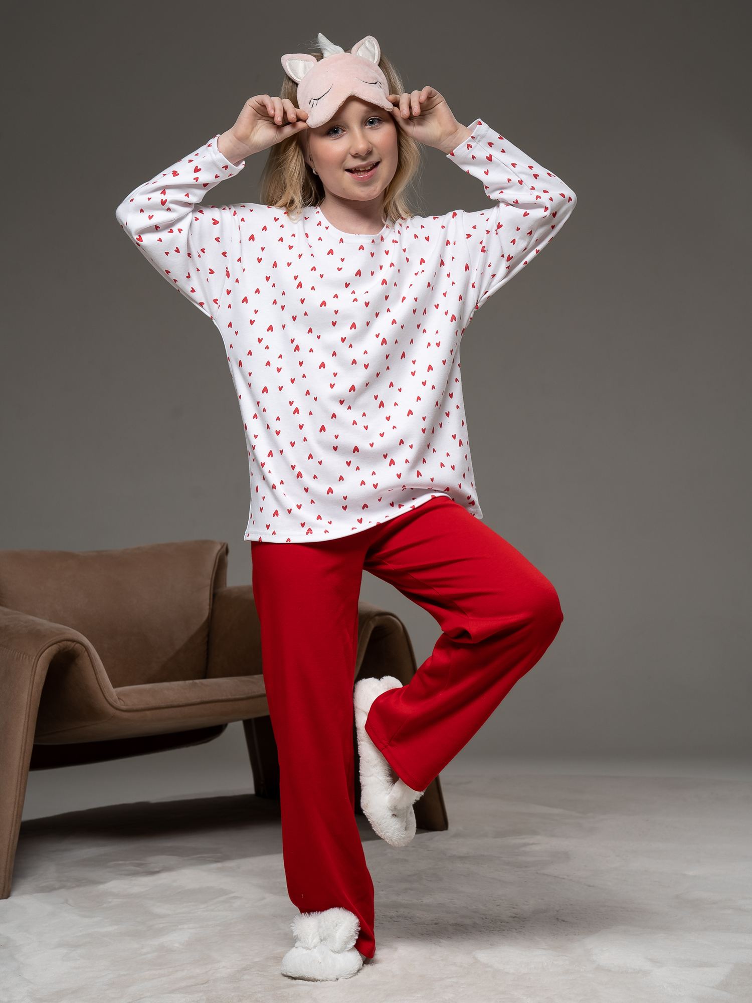 Пижама из интерлока белого цвета для девочки свободного силуэта . Состоит из толстовки и брюк . Толстовка с расширенной линией плеча, округлой горловиной и длинными рукавами. Прямые брюки с цельнокроенным поясом на резинке без бокового шва.