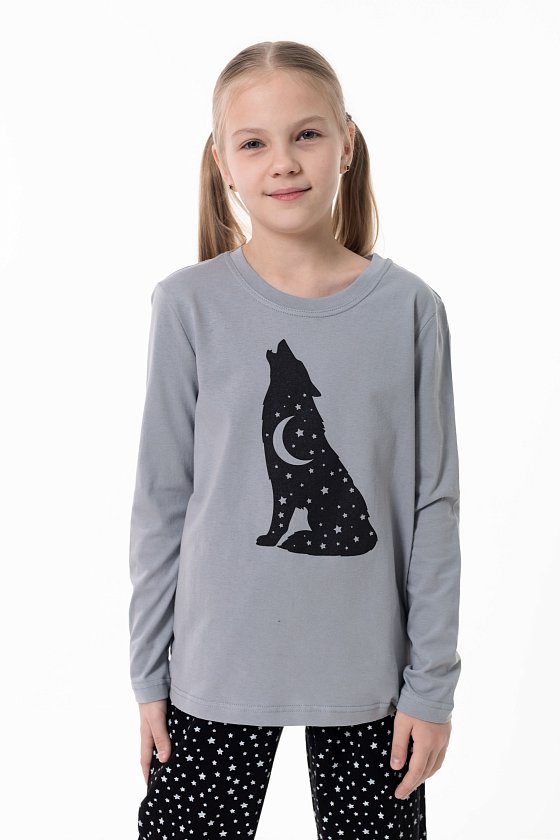Детская пижама выполнена из однотонного хлопкового полотна, приятного к телу и комфортного в носке. Комплект состоит из лонгслива с круглым вырезом горловины, украшенного принтом, и брюк прямого кроя. Брюки имеют пояс на резинке и среднюю посадку, что обеспечивает удобство и свободу движений во время сна и домашнего отдыха.