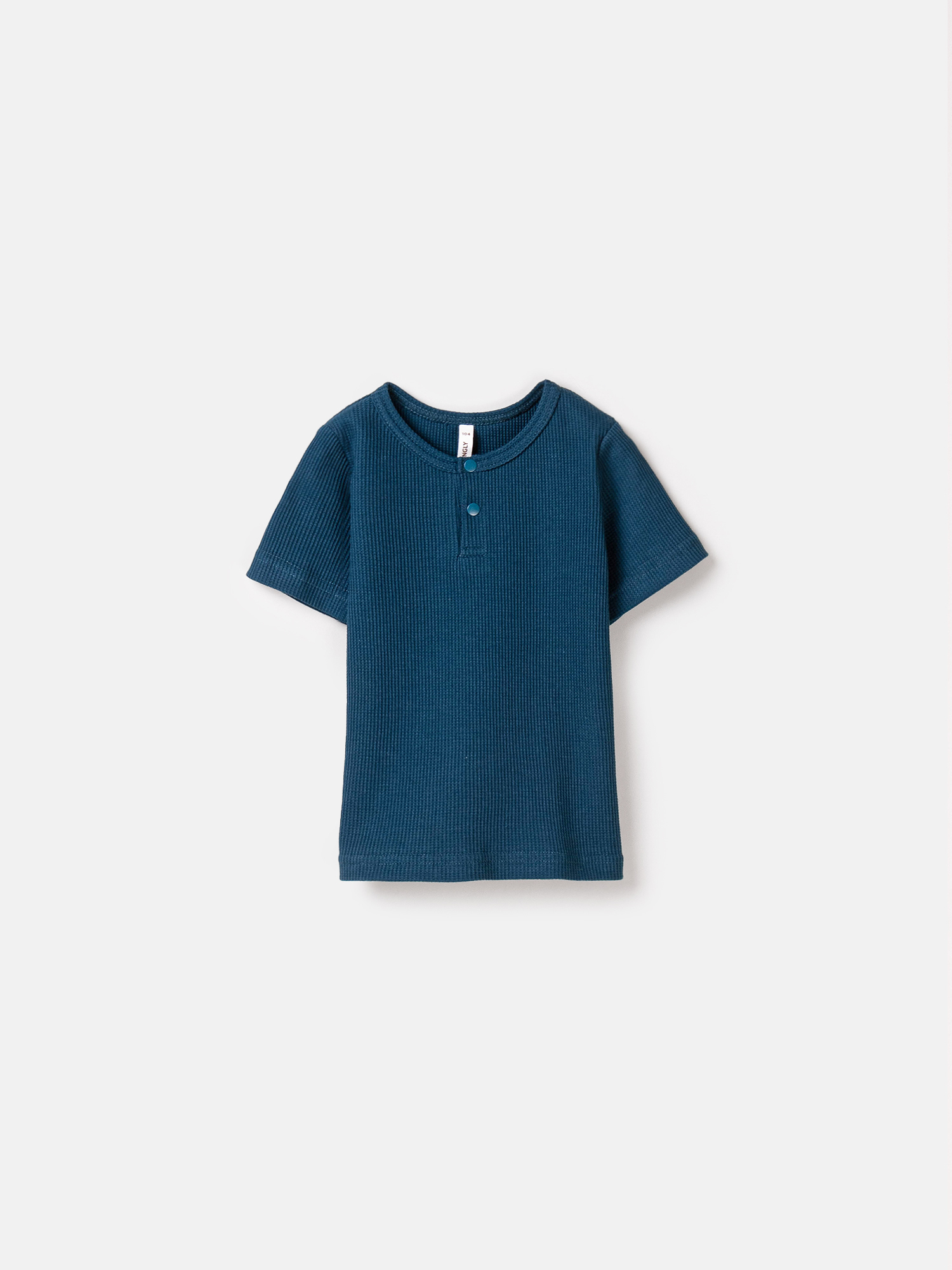 Футболка полуприлегающего силуэта с застежкой на кнопки легко надевается и снимается без помощи взрослых.